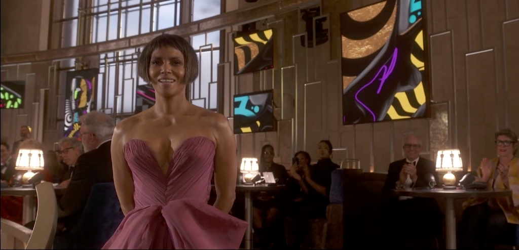 And then, if we want to get even more inside baseball, since there was natural light coming in through the windows, and the event was over three hours long, the light kept changing throughout the show, and I don’t think they were adjusting well to it because some of the presenters were really badly lit. I noticed it most with Halle Berry. Look at her in this shot – I mean, I know her new hairstyle probably isn’t popular but they did her dirty by not lighting her face properly. You can’t see her eyes!