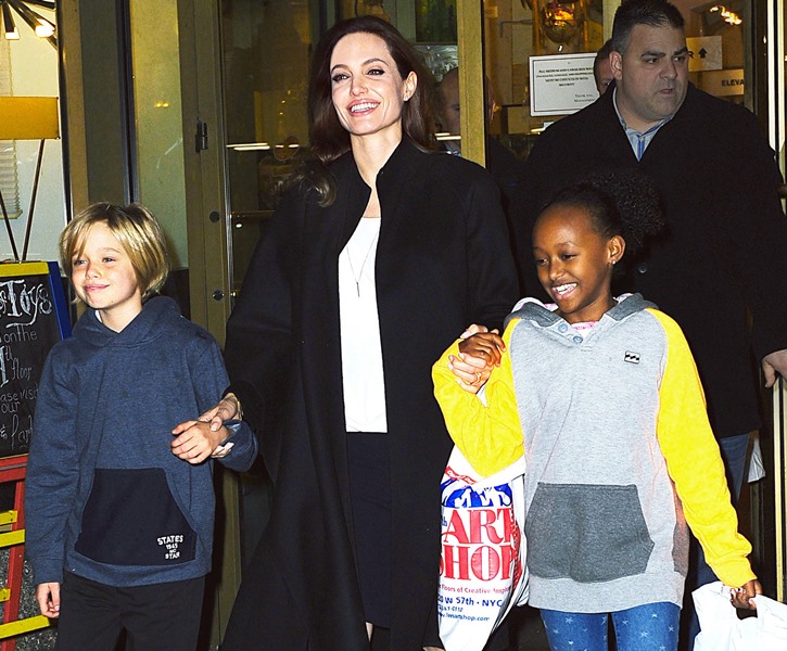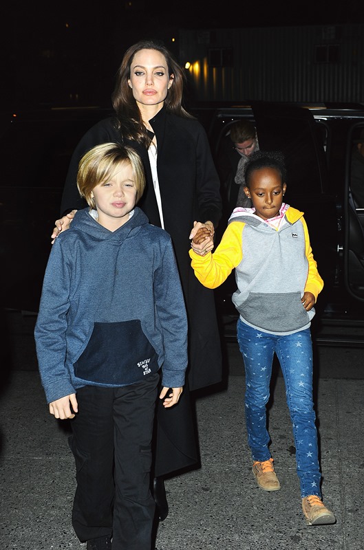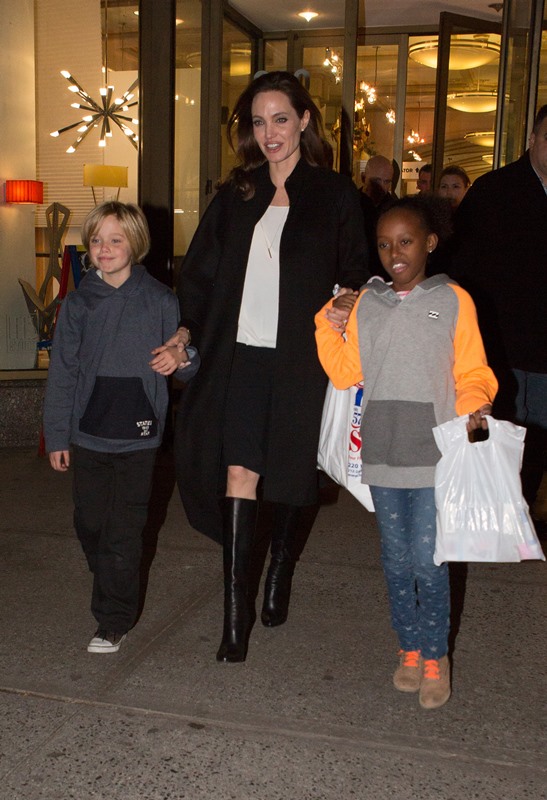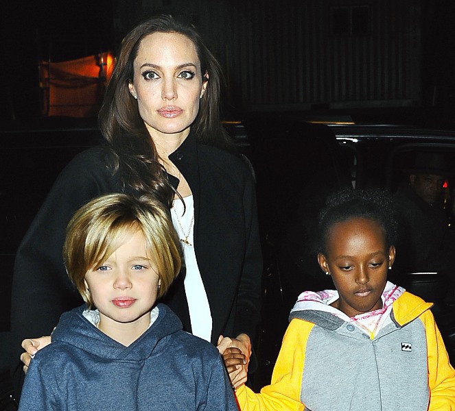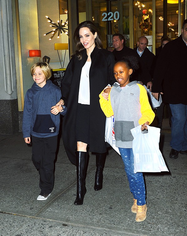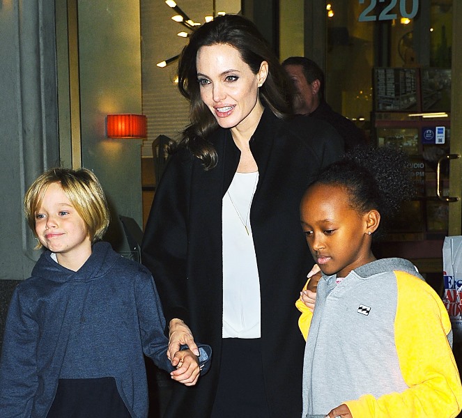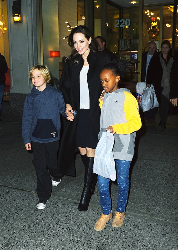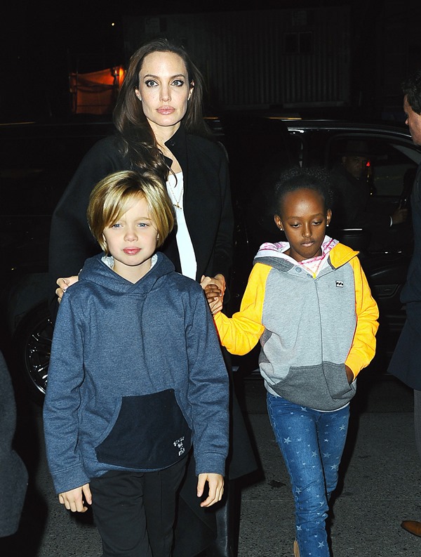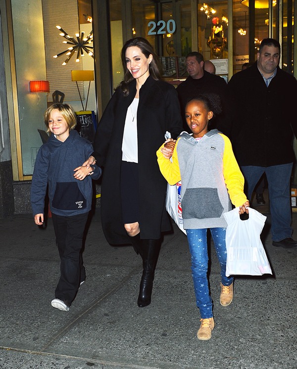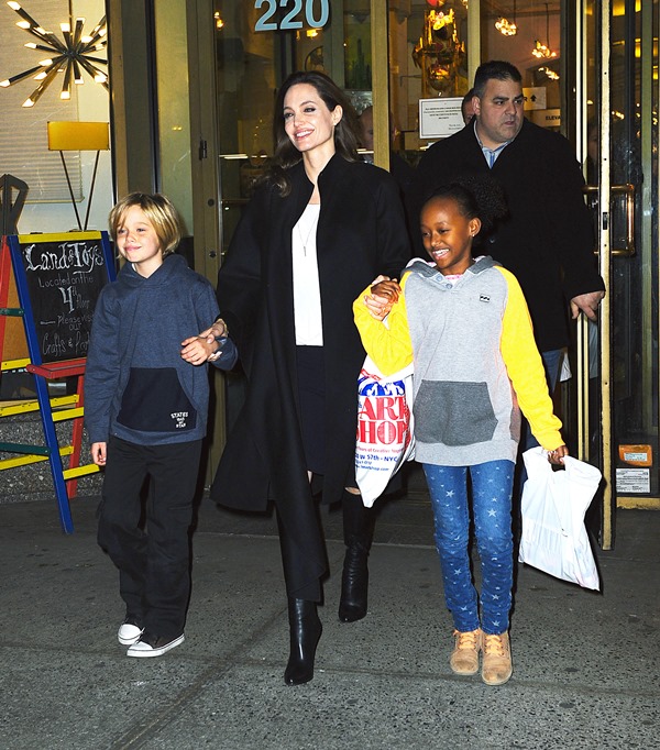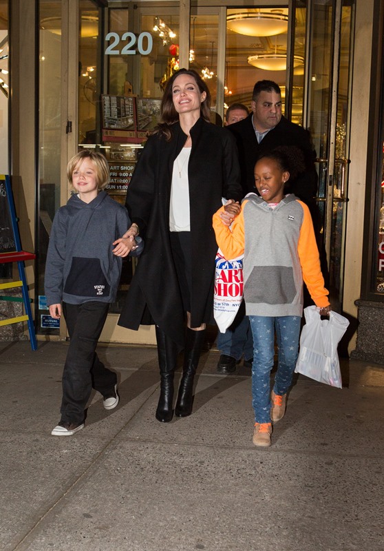 Angelina Jolie was in New York this weekend doing some work for Unbroken. Then she took her girls, Miss Zahara and Shiloh the Chosen, to Lee’s for art supplies. They’ve gone there often. And they’ve been photographed there often. So the kids know the deal. They know about the photographers. And they know what to give those photographers – big smiles. I like it that Shiloh’s smile is all punk. Like she knows something you don’t know. And she’s laughing about it inside. A joke she’s been sharing with her mother? There was a time when she and the kids would go to Lee’s and she’d have to hold Shiloh by the wrist. Duana noticed it first. That the wrist-hold is the one you put on the wild one, the one who’s a runner.