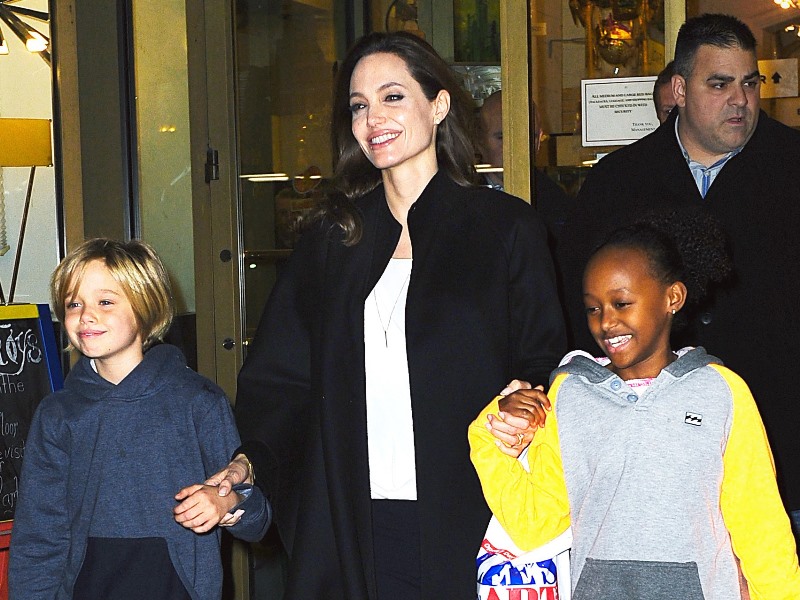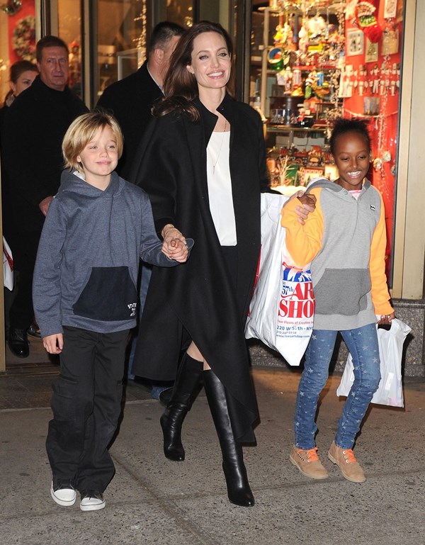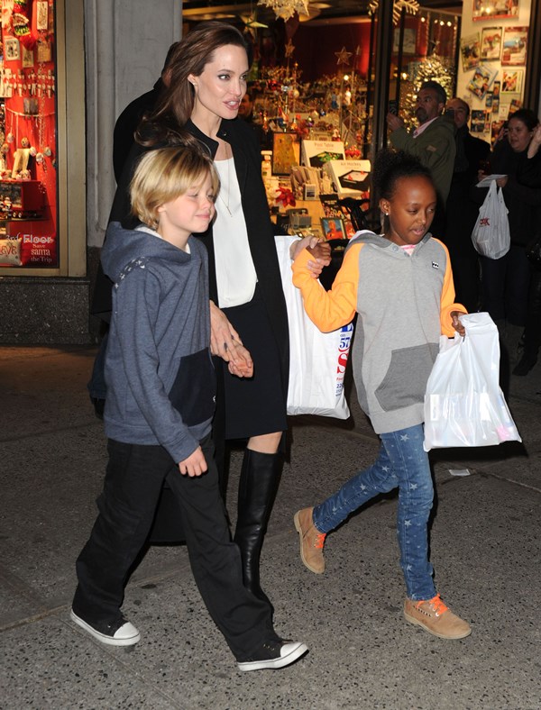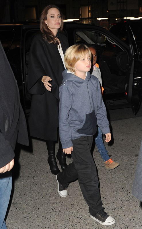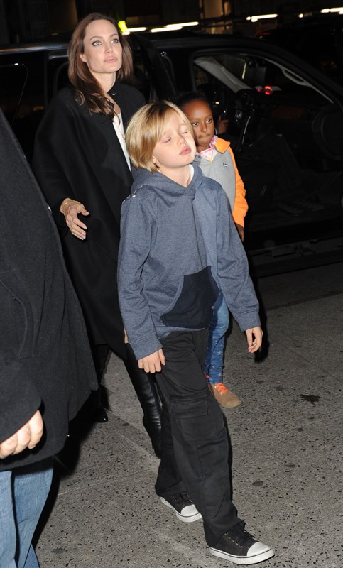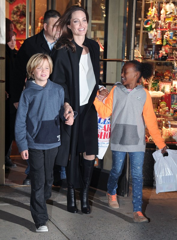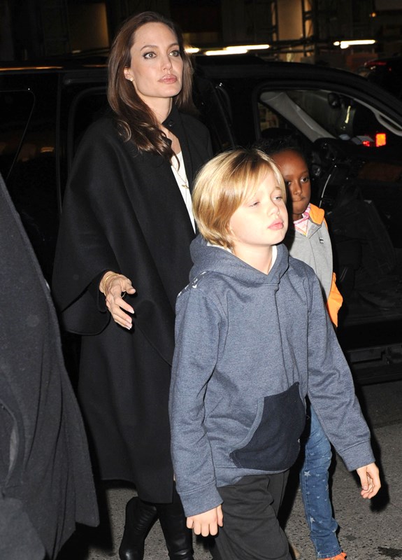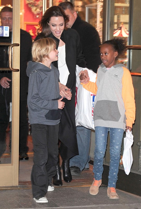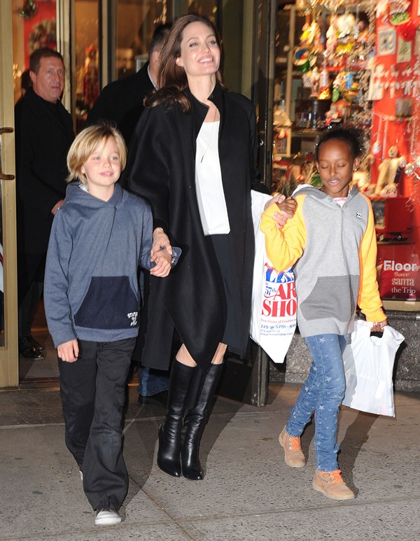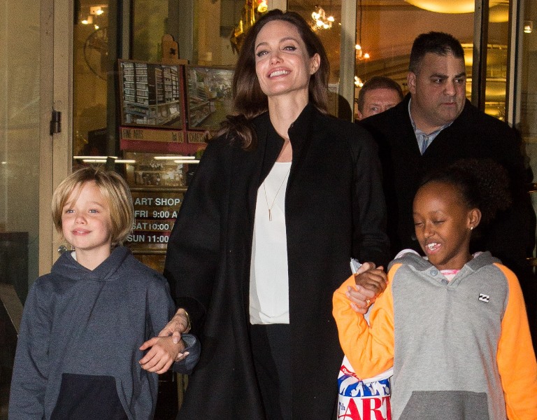 Angelina Jolie was in New York this weekend doing some work for Unbroken. Then she took her girls, Miss Zahara and Shiloh the Chosen, to Lee’s for art supplies. They’ve gone there often. And they’ve been photographed there often. So the kids know the deal. They know about the photographers. And they know what to give those photographers – big smiles. I like it that Shiloh’s smile is all punk. Like she knows something you don’t know. And she’s laughing about it inside. A joke she’s been sharing with her mother? There was a time when she and the kids would go to Lee’s and she’d have to hold Shiloh by the wrist. Duana noticed it first. That the wrist-hold is the one you put on the wild one, the one who’s a runner.