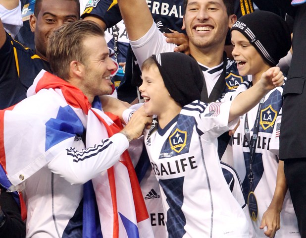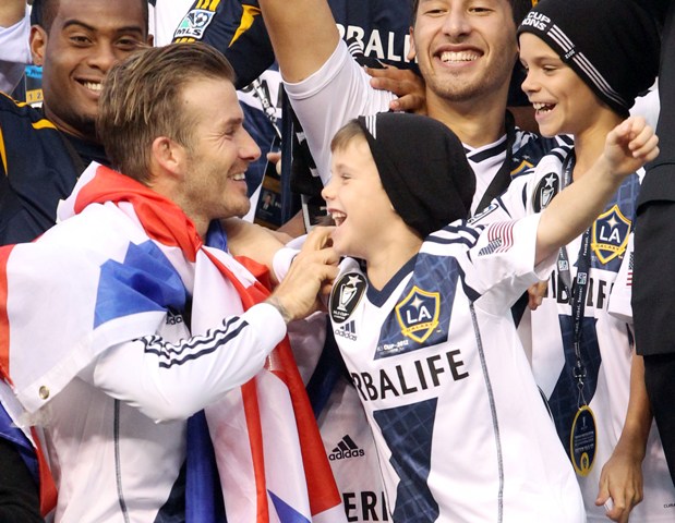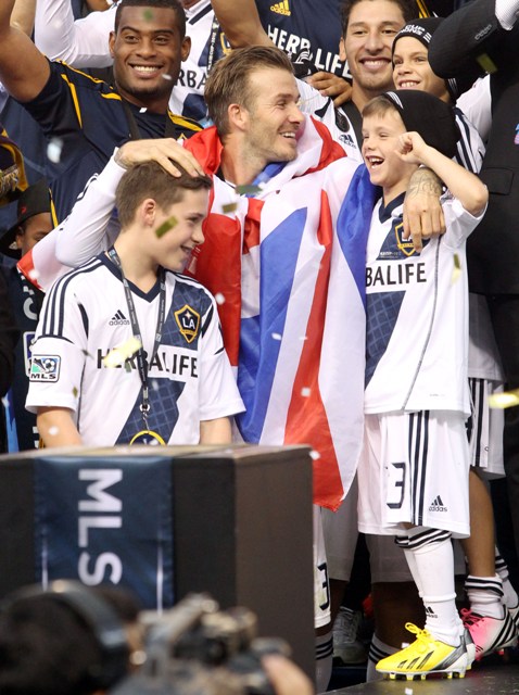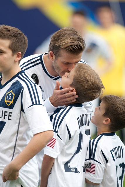 David Beckham led the LA Galaxy to the MLS title on Saturday. He celebrated with his three sons, always publicly affectionate and tactile. I love this. And I wonder how much longer they'll let him. I remember my dad picking me up at the airport after I spent an entire summer in Hong Kong. When we said goodbye, we hugged and he kissed me. When I came home and he tried to do the same, I pushed him away out of embarrassment. I think I was around 12. God, why are adolescents so awful?