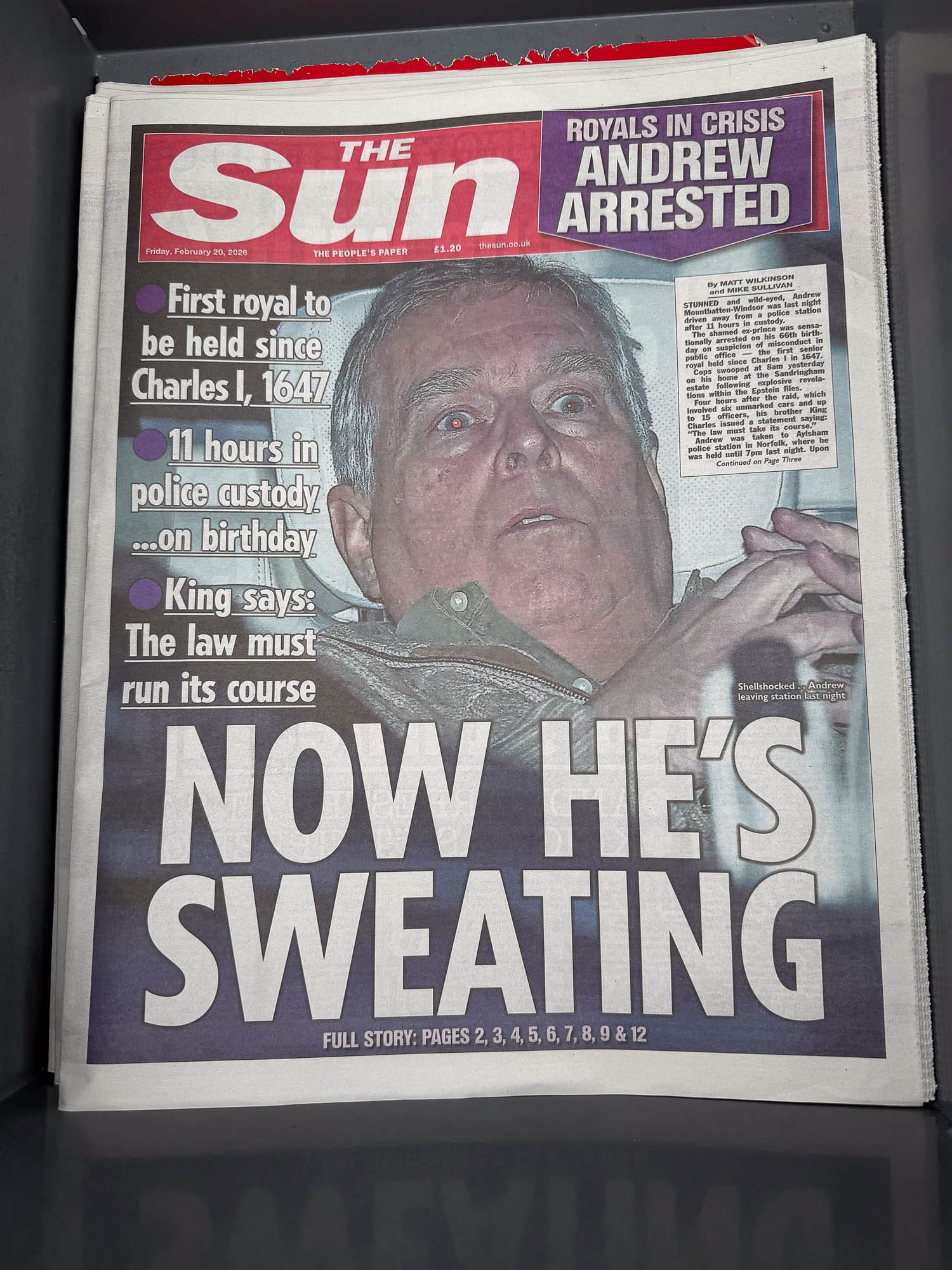 For decades the royal institution underestimated Andrew’s various liabilities and while, sure, some of that responsibility rests with the late queen who shielded him from accountability, it’s not like King Charles and William can wash their hands of him entirely. Though they have been trying to distance themselves from him, recently, we’ve seen them and their comms teams over the last several years devote much more energy to undermining, ahem, other members of their family, even appearing to use them as a way to deflect from Andrew’s messes. And now the catastrophe has landed, Just Andrew arrested and on the front page – here’s my favourite tabloid cover from the last few days…