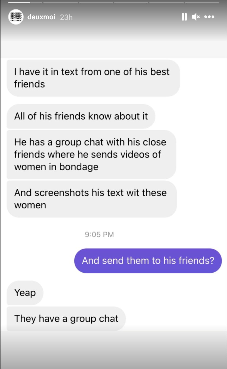 Also on DeuxMoi is an allegation that he has a text group in which he sends pictures and talks about his sexual exploits. Who doesn’t talk about sex with their friends? That’s pretty normal. What would not be cool is if he was sending nudes to his friends without the explicit permission of his partners, even more so if they are engaging in sensitive, trust-based dom-sub relationships.