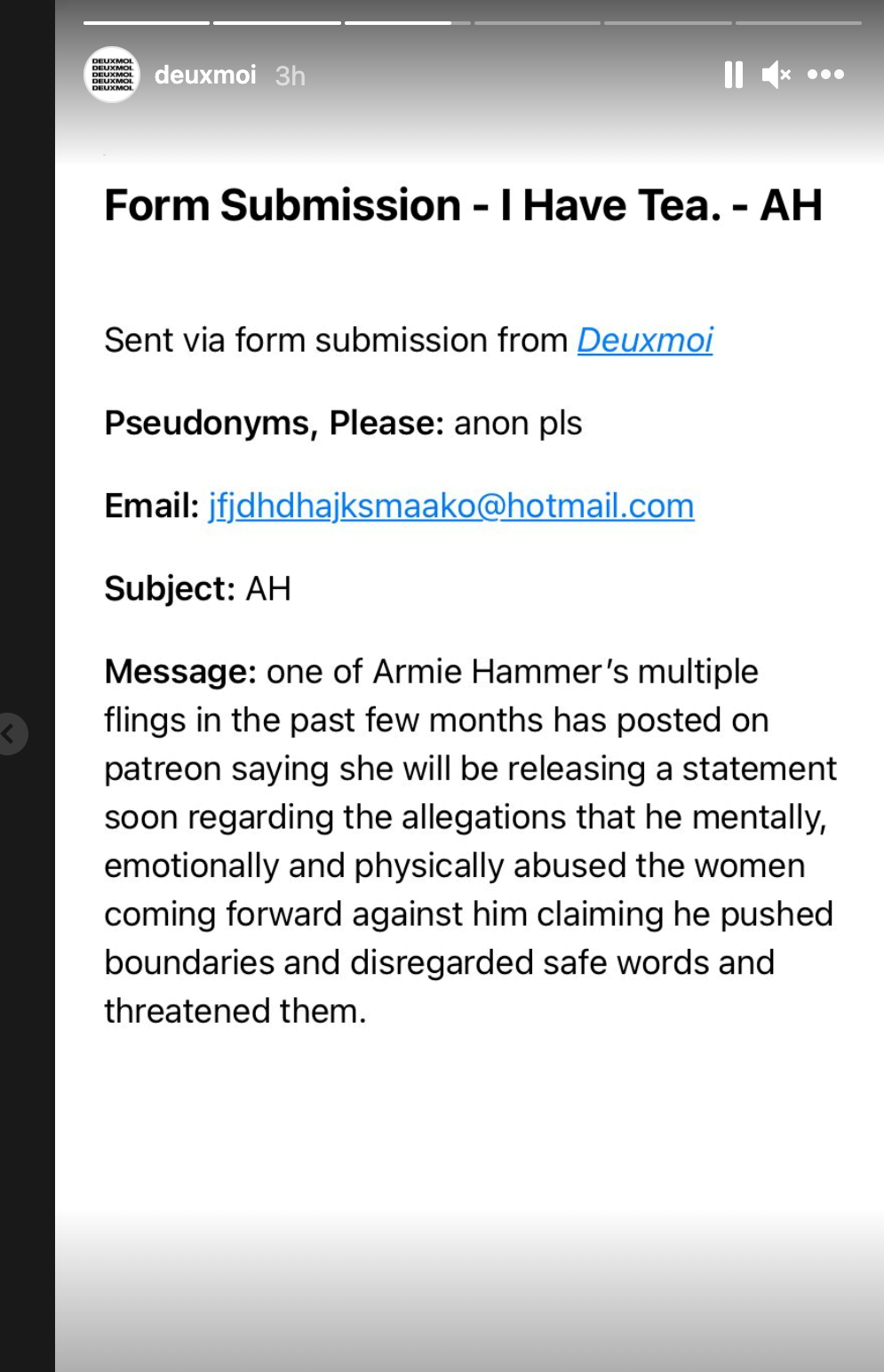 Some tweets I’ve seen point out that, based on the DMs, Armie isn’t practicing his kink in a safe and consensual way. Again, I would defer to his partners on that. Writer Jessica Ciencin Hernandez, who dated him back in September, is private on Twitter (at the time of writing this) but before she locked her account, she had a tweet that read, “If you are still questioning whether or not those Armie Hammer DMs are real (and they are) maybe you should start questioning why we live in a culture willing to give abusers the benefit of the doubt instead of victims." There is a screenshot of it here.