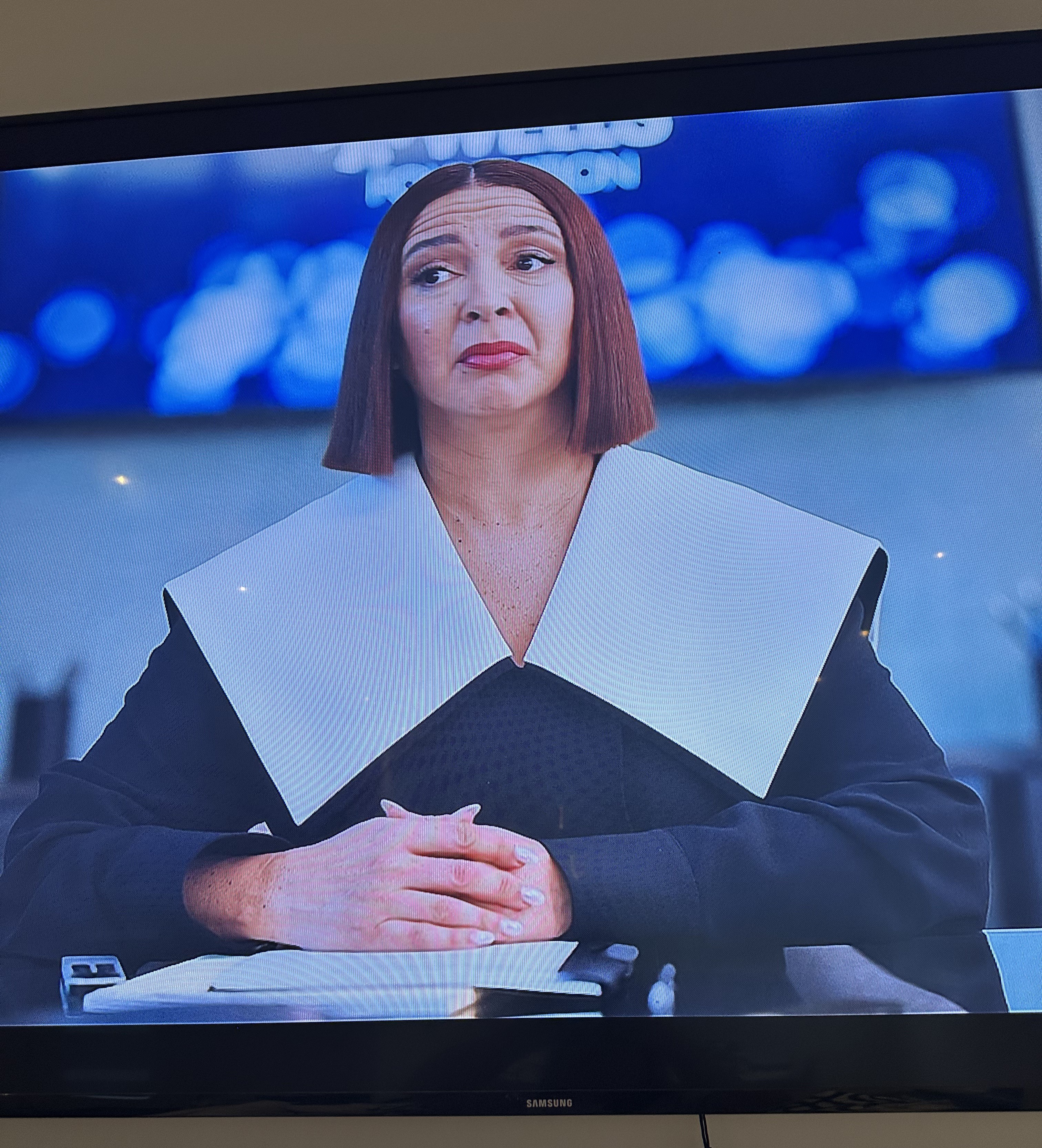 We’ve talked about Loot before because Maya Rudolph playing a billionaire has yielded so many great looks. Costume designer Kirston Mann talked to Town & Country about it and T&C calls the looks flamboyant – that’s exactly the right word. Lots of big prints, over-the-top costume jewelry, head pieces, accessories, ruffles, bows etc. It’s wonderful. A reader wrote in and asked me about “the top that looks like a nun’s habit” and I knew exactly what she was talking about.