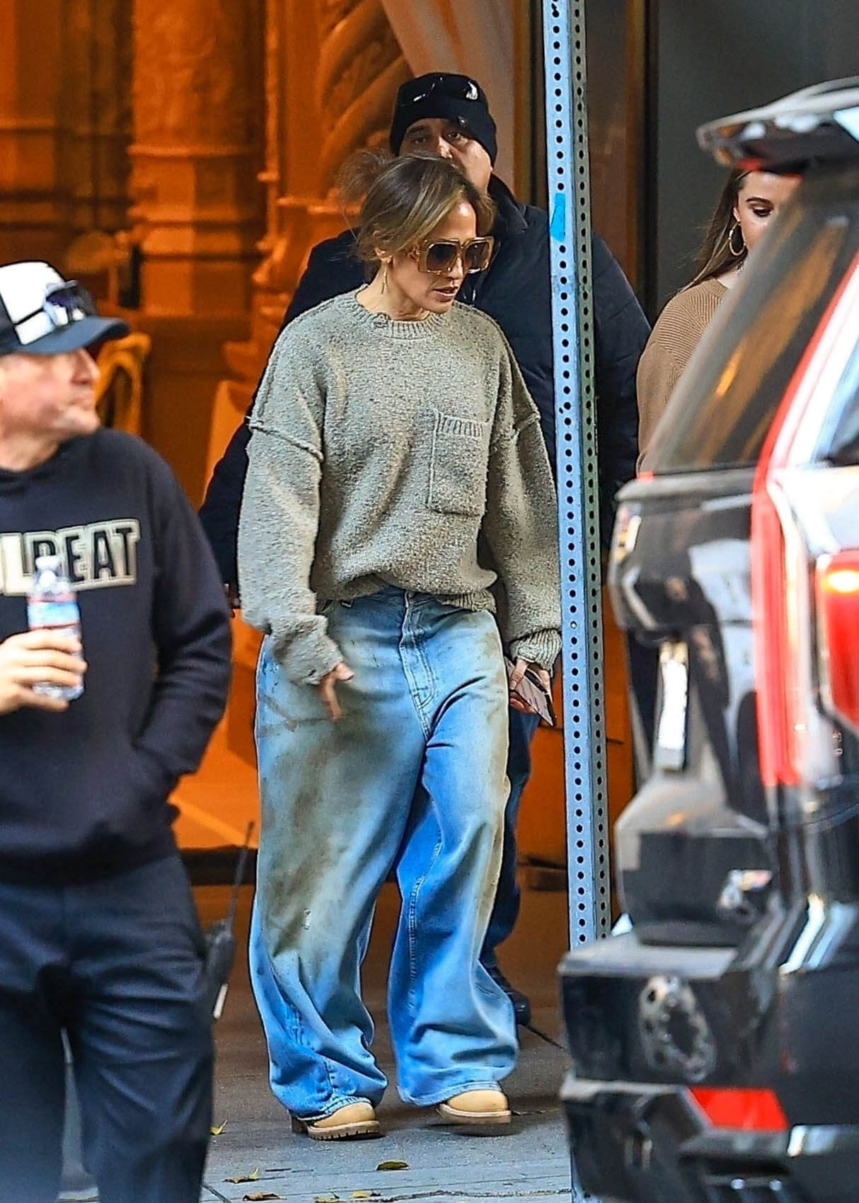 Jennifer Lopez has been dressing up for the holidays (in green, much to Lainey’s chagrin) but this is a photo of her from set. The specific request is for this sweater which appears to be from Hudson’s men’s line. This particular shade of grey is no longer available but there is a charcoal colour available – one size left.