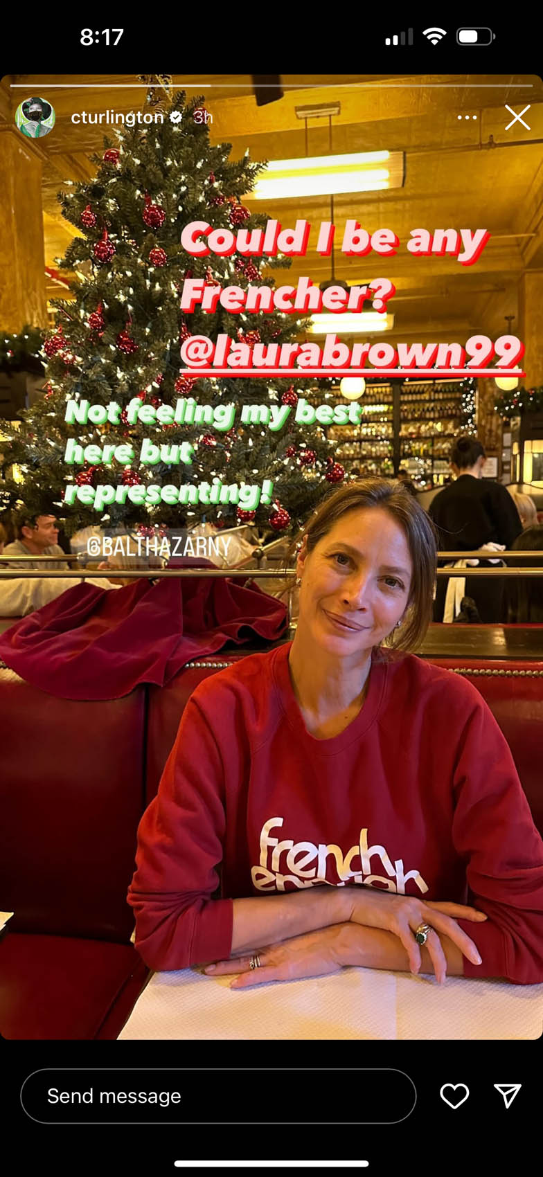 Christy Turlington posted this photo and she said she’s not at her best and this picture could be in Vogue. Like, this is her under the weather?! I was asked about the sweatshirt, it’s Sezane. $120, acceptable splurge territory but sizes are really limited.