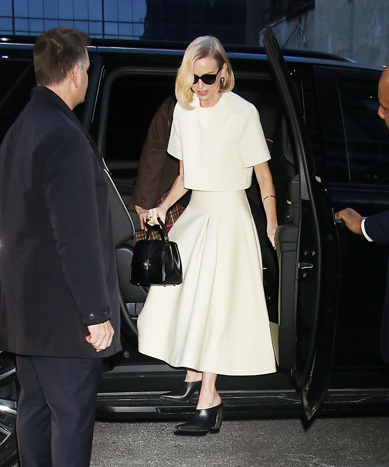 Naomi Watts is doing press for Feud: Capote Vs. The Swans so don’t tell me fashion doesn’t matter. It’s about New York socialites stabbing each other in the back, of course it matters! A reader asked for her boxy top and matching skirt – it’s Bottega Veneta. You can see it in the fourth photo in this carousel. Bottega sells the entire look here and there’s still a few left (very limited sizing).