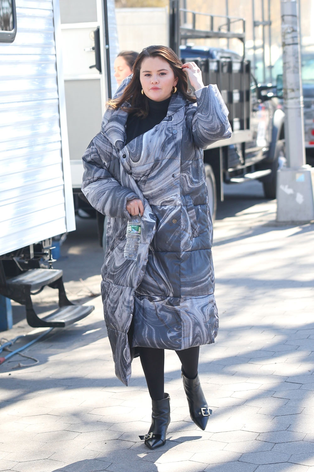 Here’s Selena’s on set in a coat she’s worn several times, the UGG Catherina long puffer. Not available this season, sorry! No luck here but we know we are getting another round of excellent Mabel sweaters, coats and shackets coming soon.