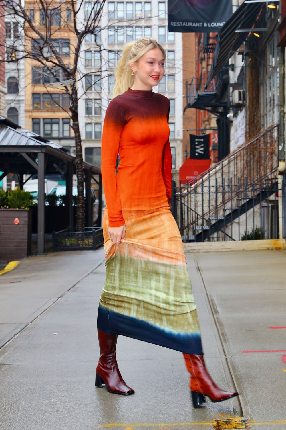 This dropped in my inbox right as I was filing but the dress is so good, I didn’t want to wait until next week. It’s Gigi Hadid in a reddish-orange ombre dress (see photos here and attached below). Yes she’s a supermodel and looks amazing in anything but this dress is definitely special. It’s Altazurra Fall Winter 2023 and I fully expect to see it everywhere soon.