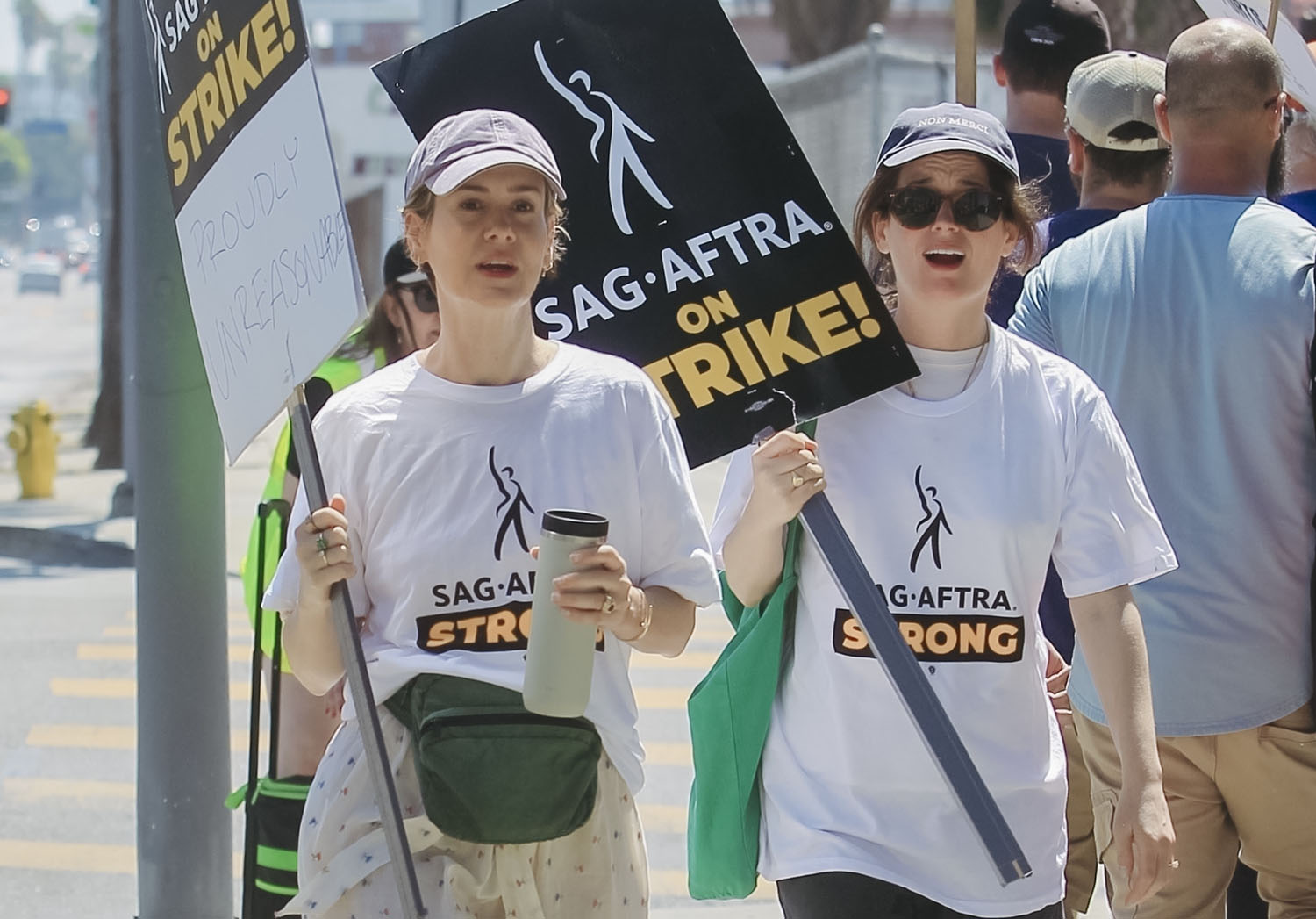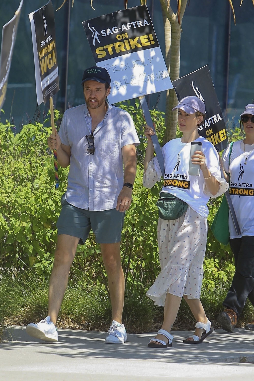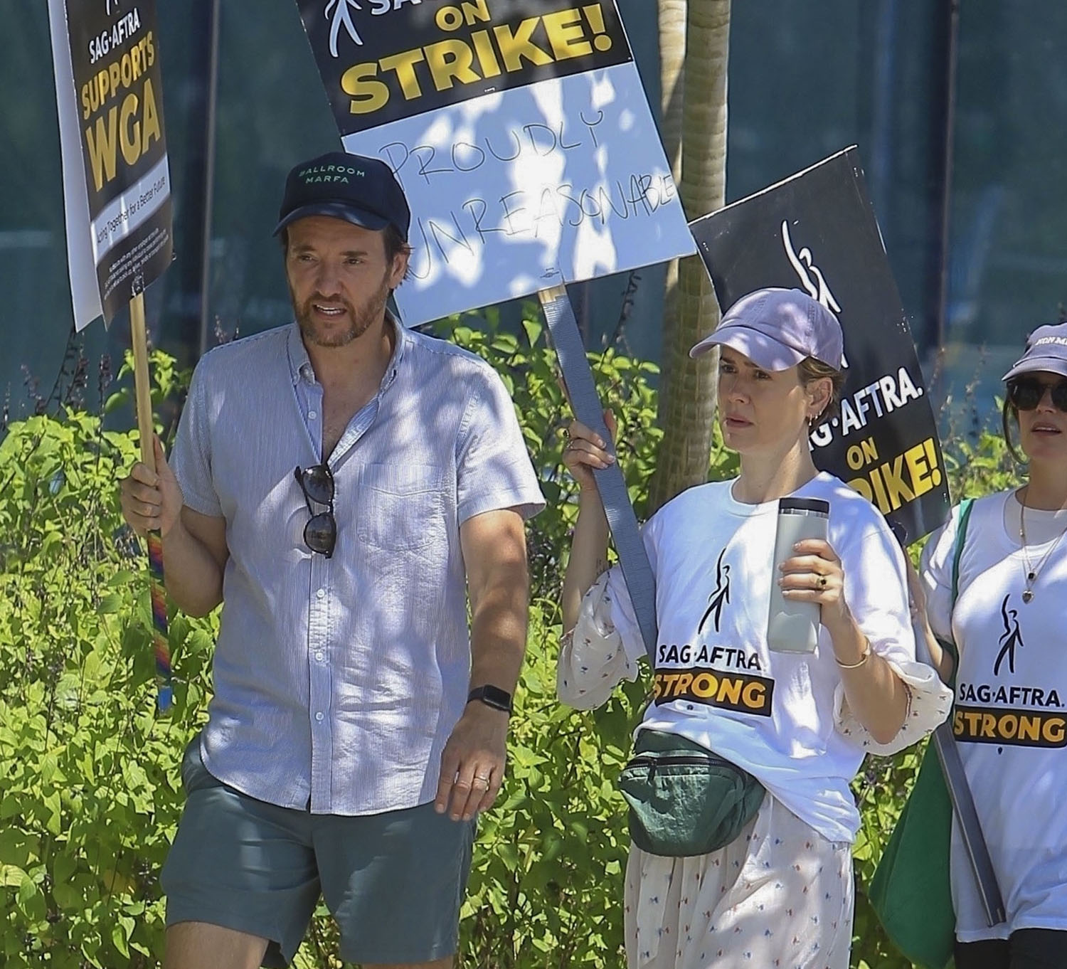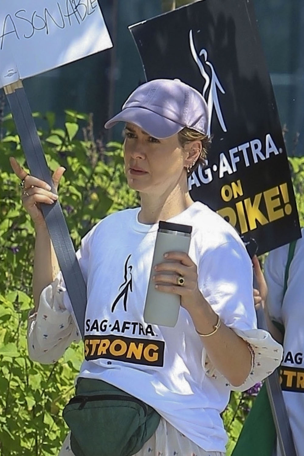 Attached - Sarah Paulson in a hat and fanny pack on the picket line yesterday in LA.