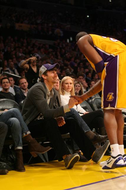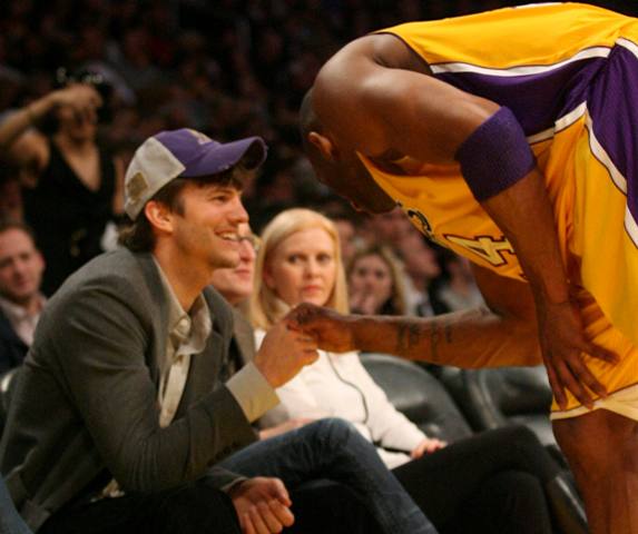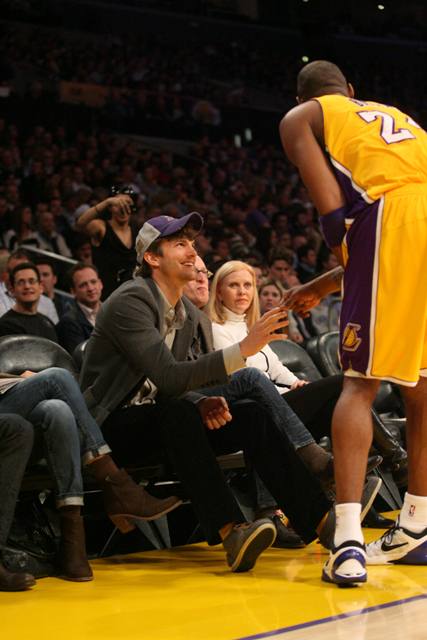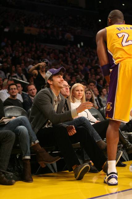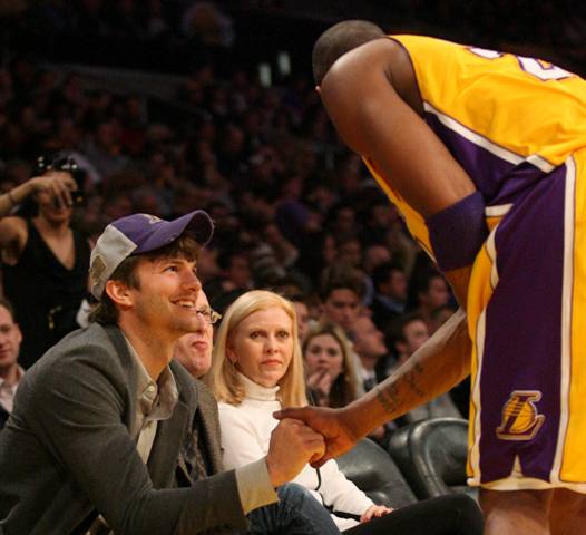 I had to post these shots of Ashton Kutcher and Kobe Bryant at the Laker game last night. Do you think in the Cheaters Club there is a hierarchy? Like...would they be fist-pumping Jesse James? Or is he a lower level cheater? Tiger Woods, obviously, has a lifetime membership in the A List secret chamber even though they secretly talk about him behind his back for nailing the Perkins waitress with a tampon in the back of the car.