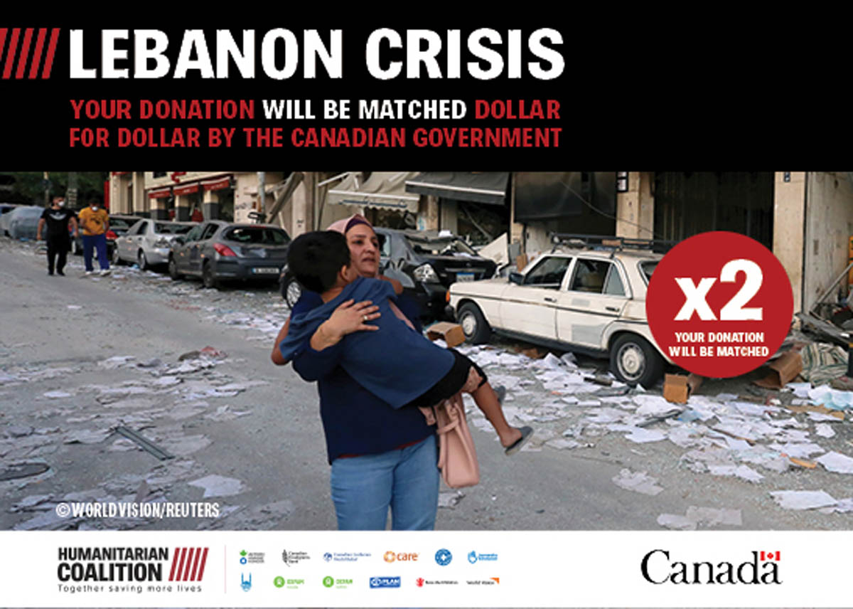 “The Humanitarian Coalition launched an emergency appeal on the weekend for the Lebanon Crisis. The explosion on August 4 in Beirut killed hundreds, wounded thousands and left 300,000 homeless. The Canadian government has stepped up by matching all eligible donations made by August 24 to the Humanitarian Coalition and [its] members, dollar for dollar up to a maximum of $5M. Please click here if you are able to help.”