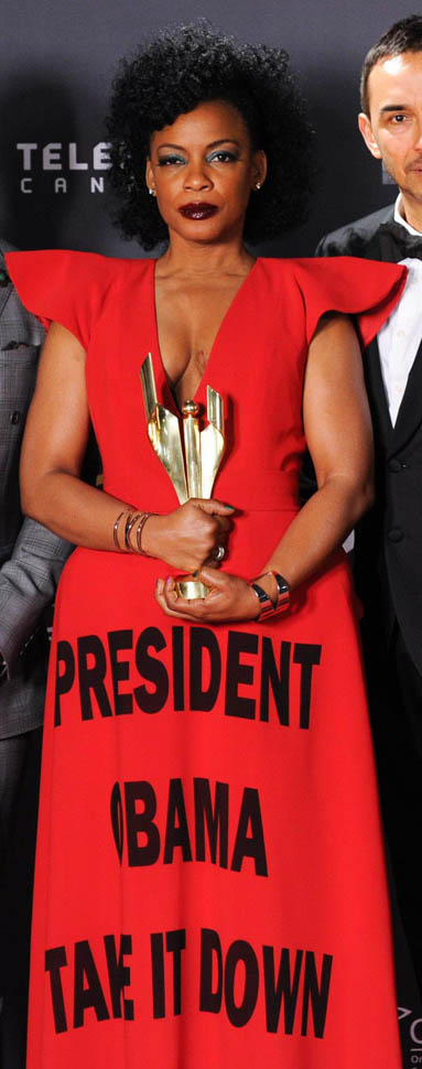 Aunjanue attended the event in red dress with the message “President Obama Take It Down” emblazoned over the skirt. She’s worn similar dresses at previous events, most recently at the NAACP Image Awards in February: