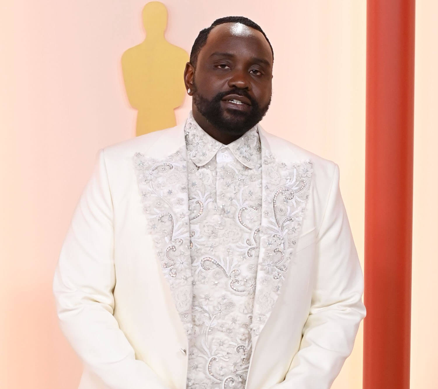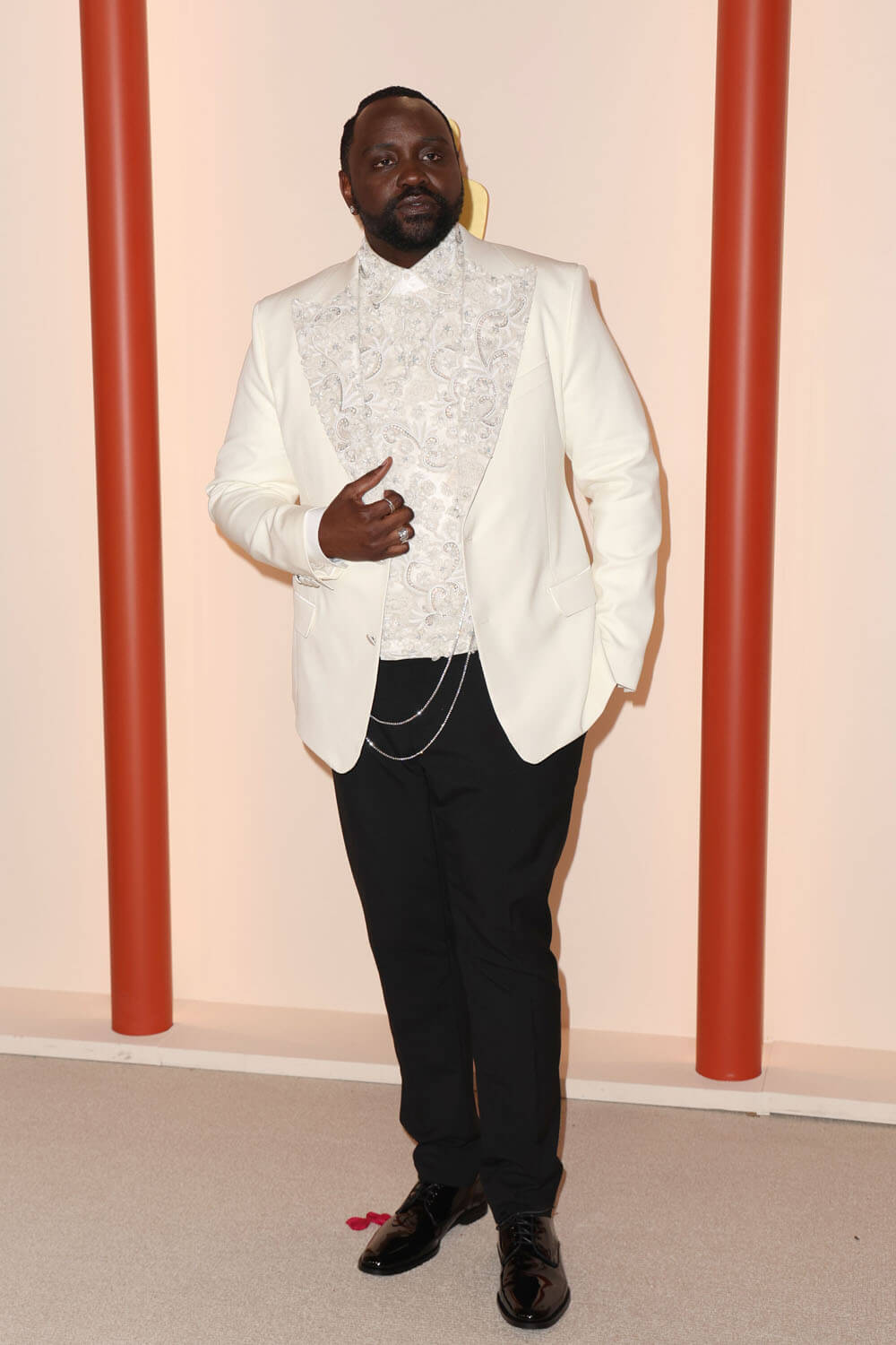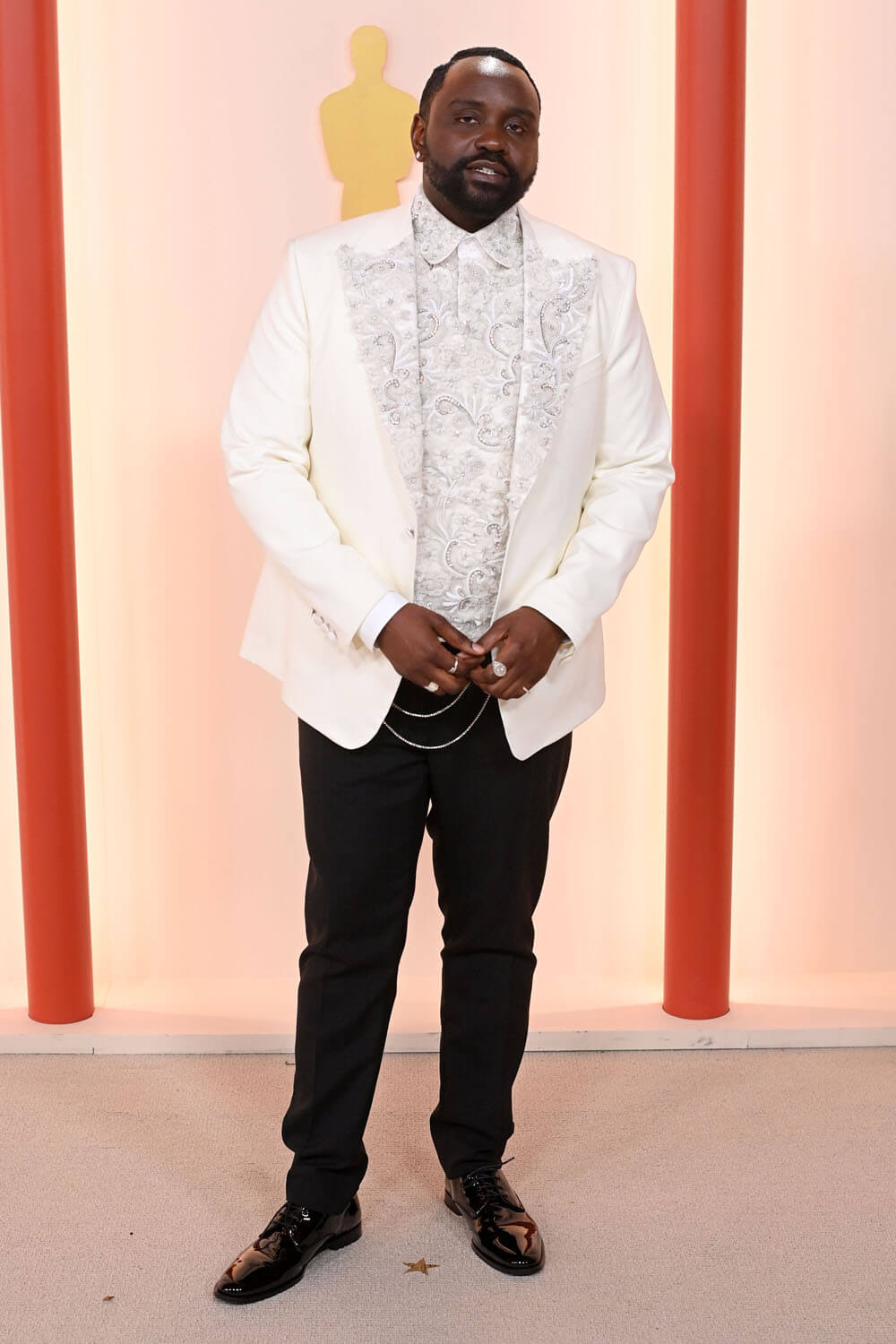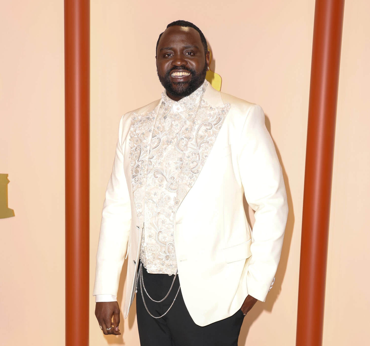 I was expecting Brian in colour last night because he’d recently talked about his affinity for bold colours but all that colour leading up to the Oscars turned out to work for the contrast, as he showed up in a white embroidered jacket, with a patterned shirt to match, and two chains hanging from the inside. I love it. But I also love the gold choice for Vanity Fair. And the fact that he had options. Brian, clearly, loves the clothing part of award season – and this won’t be his first time. The industry is big on him. He will be back.