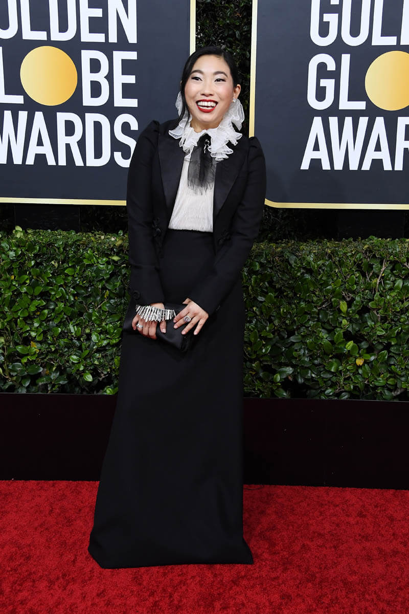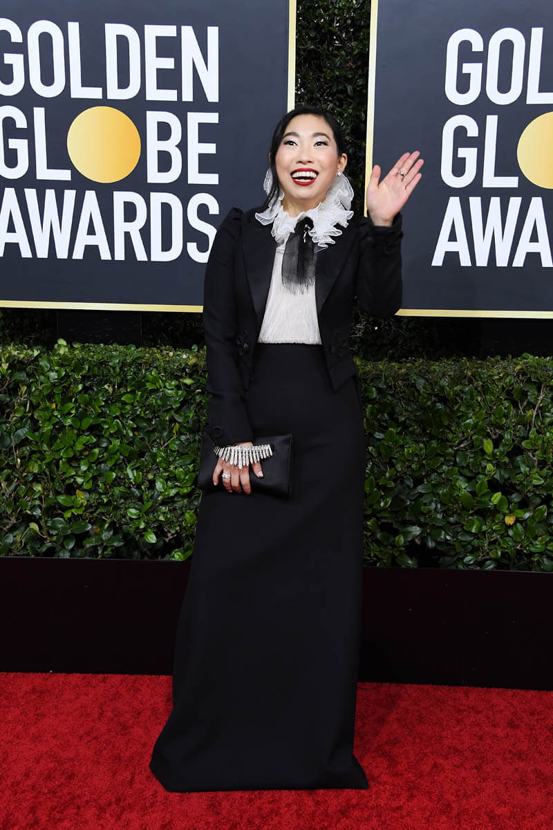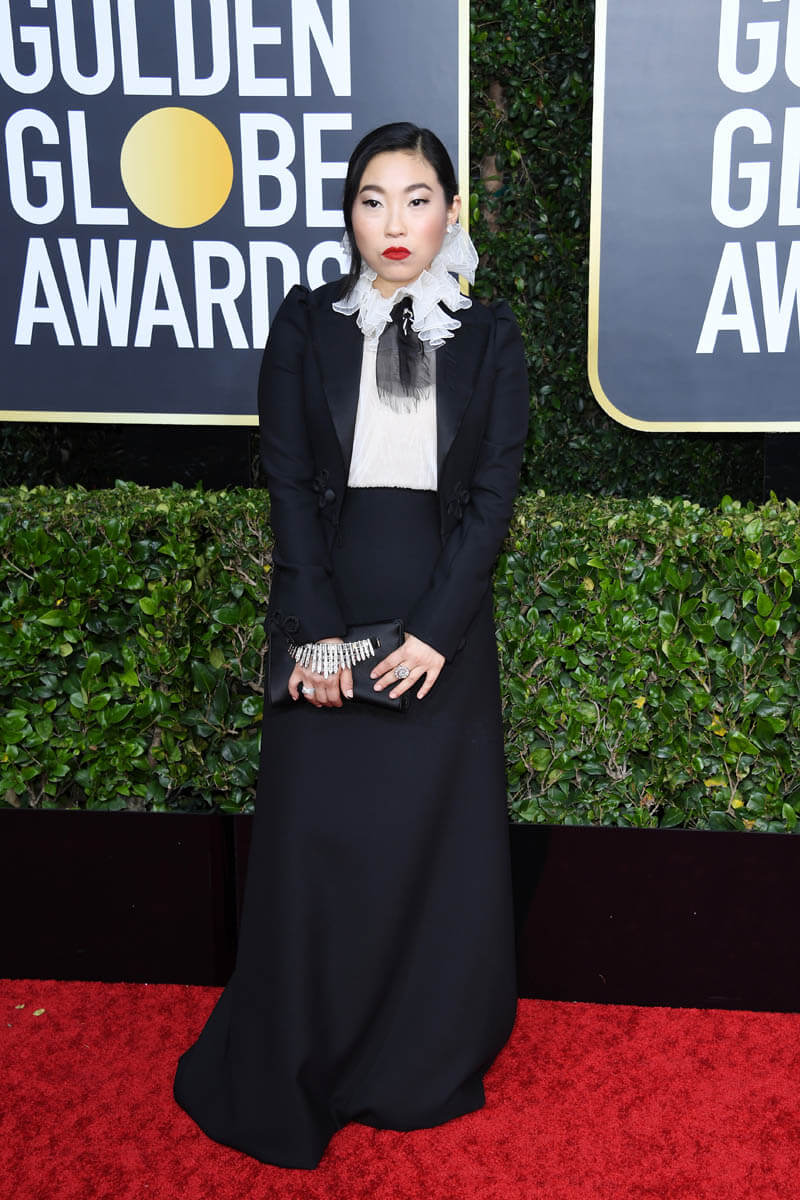 First of all… see The Farewell. I know I’ve been nagging you about this since the summer but now it’s actual homework because with this win, Awkwafina’s Oscar nomination chances just got way better. Remember, Oscar nomination voting ends on Tuesday. And while the Globes don’t often predict eventual Oscar winners, they can 100% influence who gets nominated. This is where people audition their speeches and make their cases for the Academy. Awkwafina, in this respect, did beautifully. She was irreverent but not rude, she was heartfelt in her thanks and appreciation for her cast-mates and director Lulu Wang, and she brought the emotion when shouting out her parents. At this point, at least for me, if her name isn’t called on Oscar nomination morning, it’s a straight up snub. Also… I loved her outfit. But I’m partial to that high collar sh-t, black and white with a strong red lip. What Awkwafina wore is more my jam than a strapless gown. Or a sloppy beach dress – see Sienna Miller.