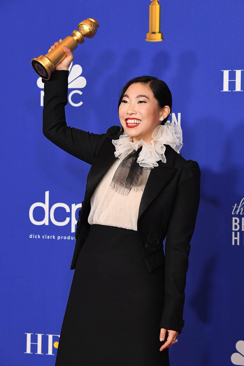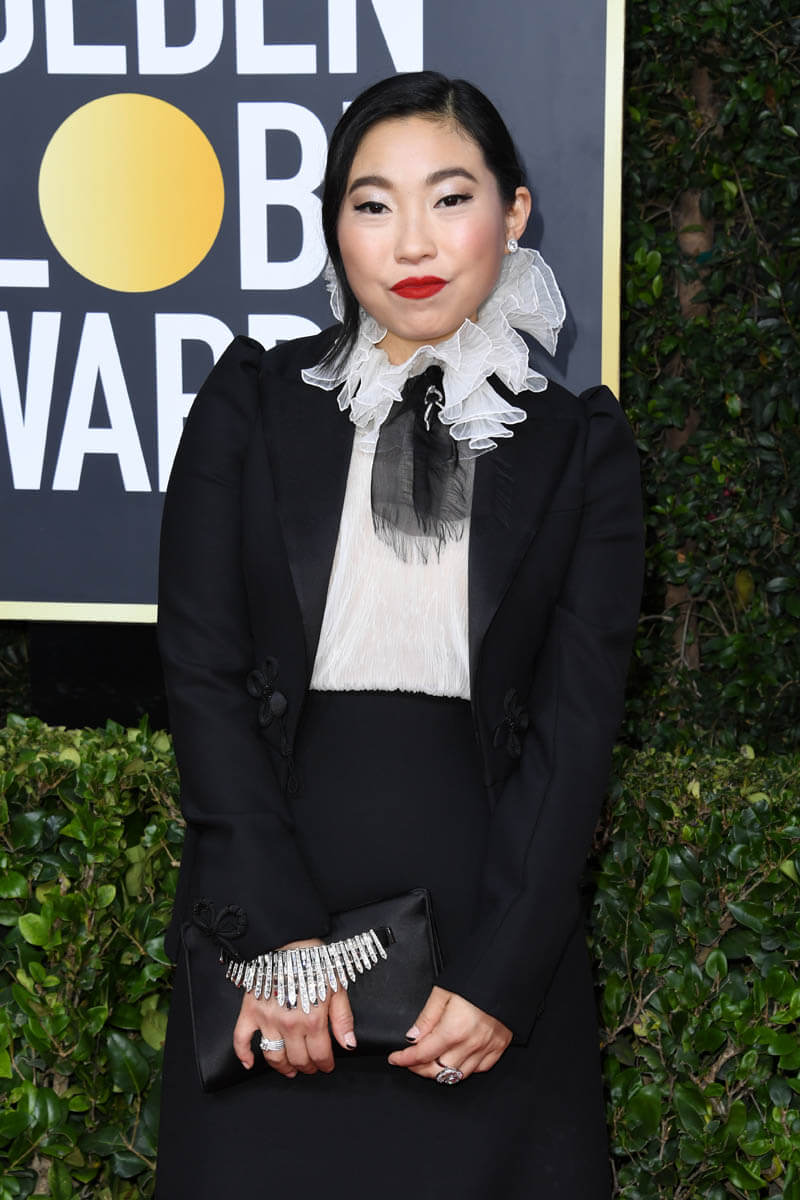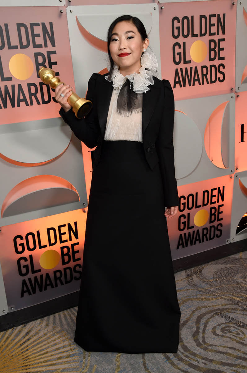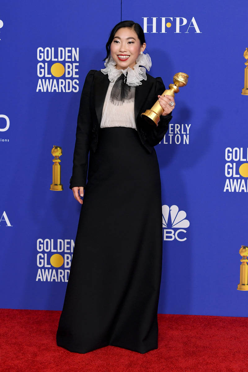 First of all… see The Farewell. I know I’ve been nagging you about this since the summer but now it’s actual homework because with this win, Awkwafina’s Oscar nomination chances just got way better. Remember, Oscar nomination voting ends on Tuesday. And while the Globes don’t often predict eventual Oscar winners, they can 100% influence who gets nominated. This is where people audition their speeches and make their cases for the Academy. Awkwafina, in this respect, did beautifully. She was irreverent but not rude, she was heartfelt in her thanks and appreciation for her cast-mates and director Lulu Wang, and she brought the emotion when shouting out her parents. At this point, at least for me, if her name isn’t called on Oscar nomination morning, it’s a straight up snub. Also… I loved her outfit. But I’m partial to that high collar sh-t, black and white with a strong red lip. What Awkwafina wore is more my jam than a strapless gown. Or a sloppy beach dress – see Sienna Miller.