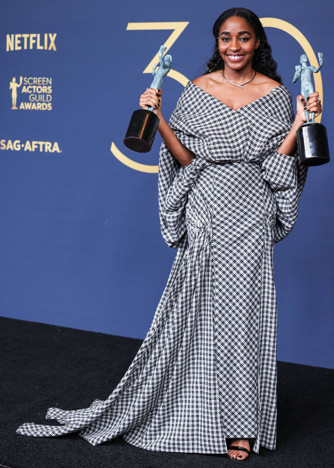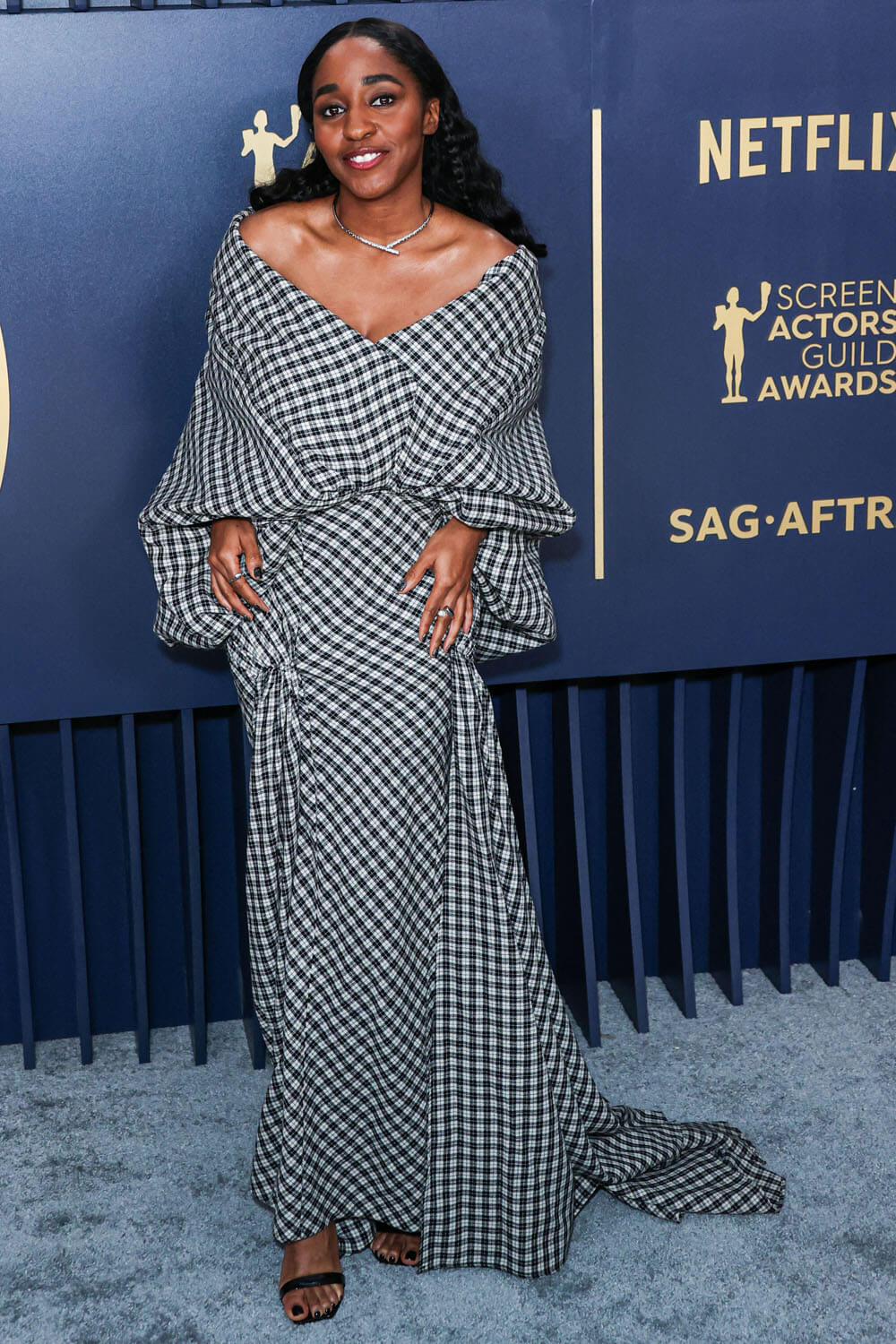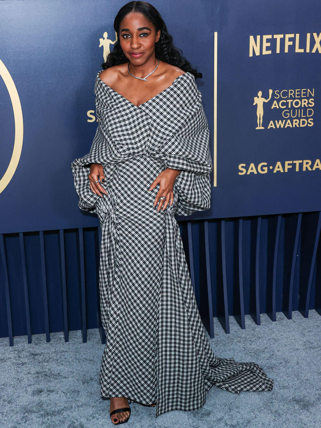 Ayo and her stylist went in a totally different direction for the SAGs. This is Luar – a checked hooded gown, I f-cking love it so much. Because it’s fresh, it’s unlike anything else we’ve seen on her, and on anyone else there. checked, open neck, draped and bloused and caping at the back. It’s streetwear but make it red carpet, cool and funky fresh.