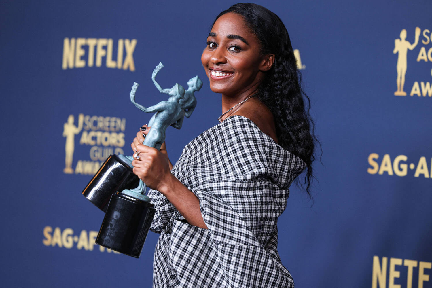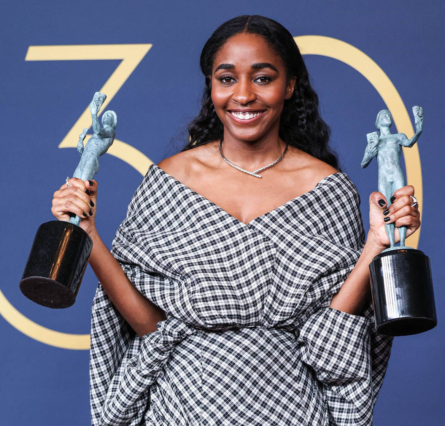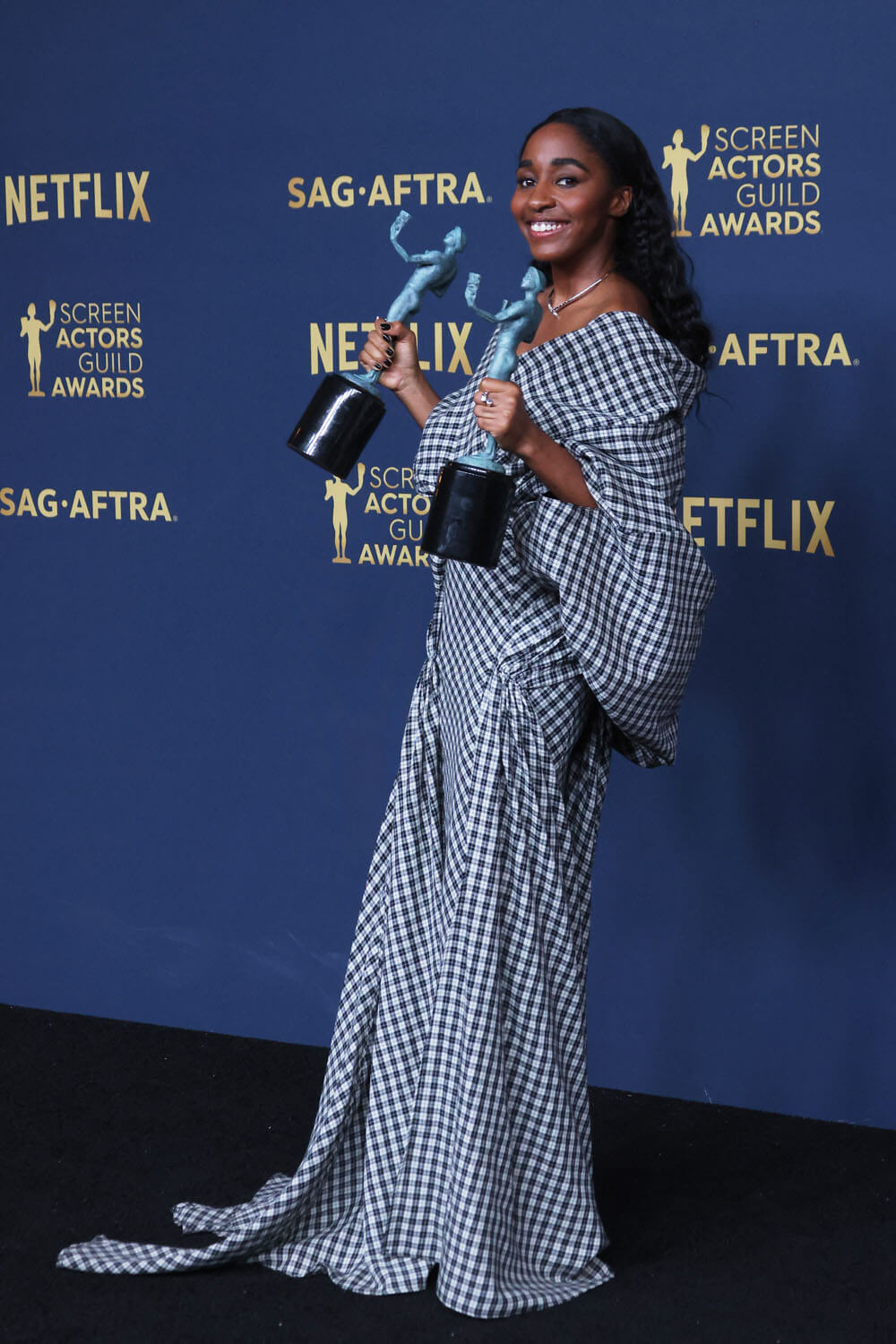 Ayo and her stylist went in a totally different direction for the SAGs. This is Luar – a checked hooded gown, I f-cking love it so much. Because it’s fresh, it’s unlike anything else we’ve seen on her, and on anyone else there. checked, open neck, draped and bloused and caping at the back. It’s streetwear but make it red carpet, cool and funky fresh.