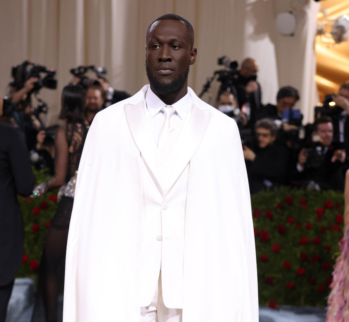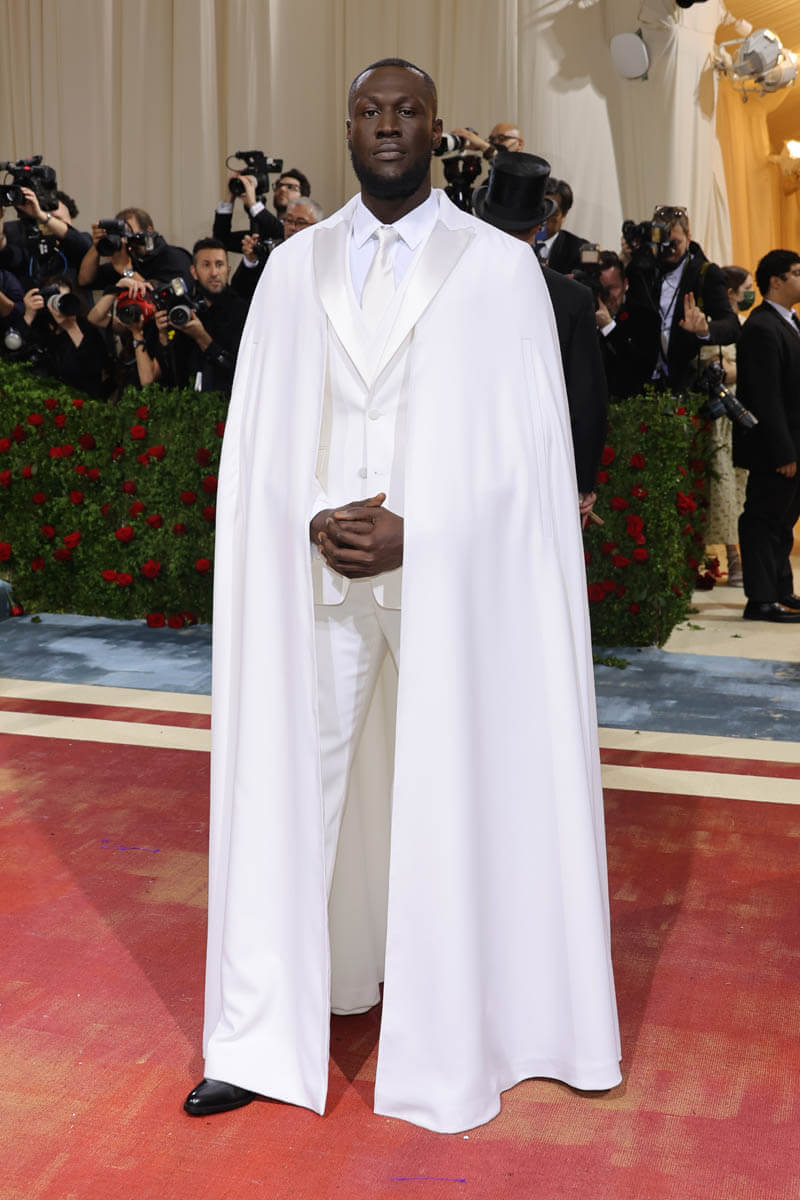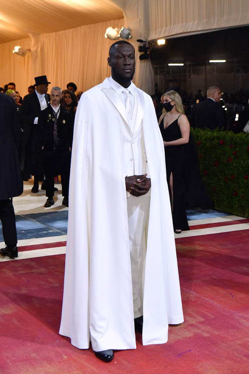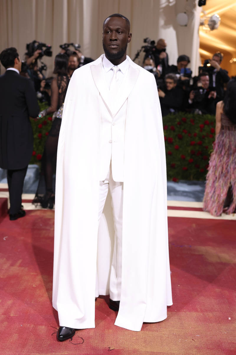Burberry and Riccardo Tisci also dressed Stormzy for his Met Gala premiere. Two different artists, two entirely different vibes. No one did “white tie” better than Stormzy last night. This white cape is exquisite. The tuxedo is exquisite. Those white lapels! What could possibly be more elegant than those beautiful white lapels?! On theme? So on theme. They were all about capes and cloaks during the Gilded Age. And I’m sure it’s not lost on anyone that white tie, considered the most formal of dress codes for the upper class, is being modelled in its highest form, on a Black man. In my opinion Stormzy is one of the best dressed at the Met Gala of all time.