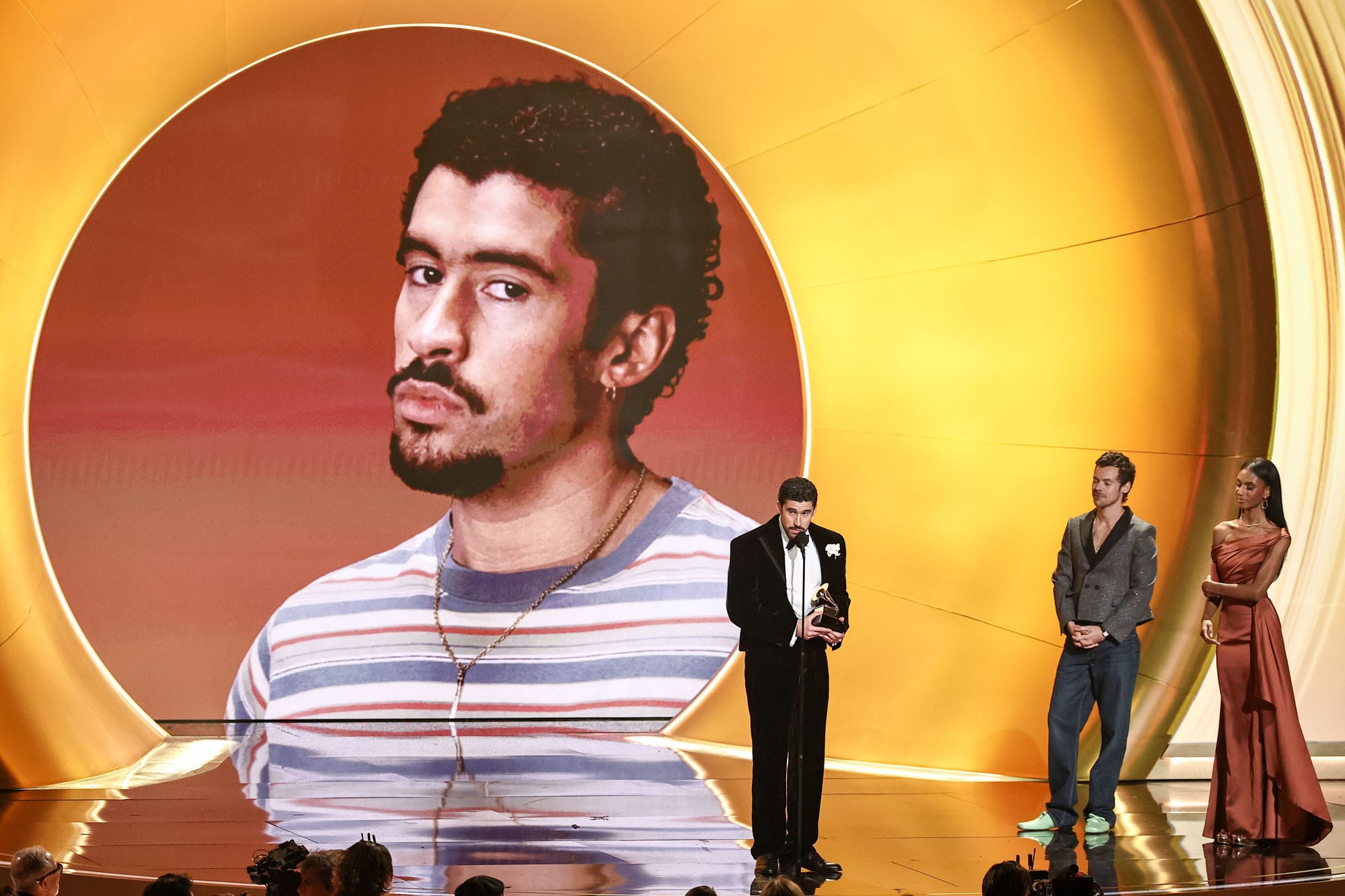 Bad Bunny with the three #GRAMMYs he won today, including "Album of the Year". pic.twitter.com/okhSge7E5i