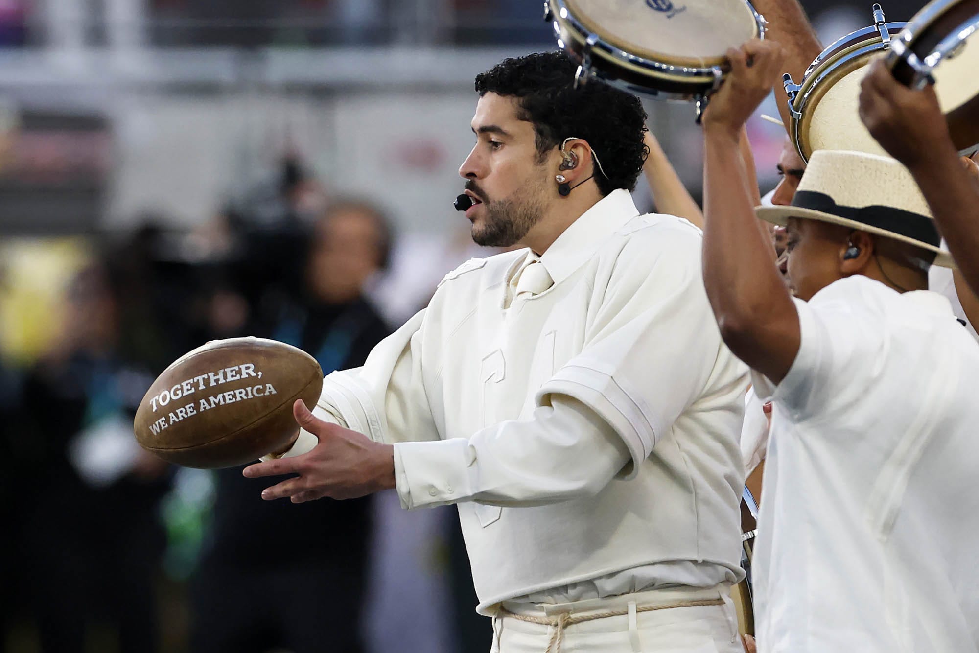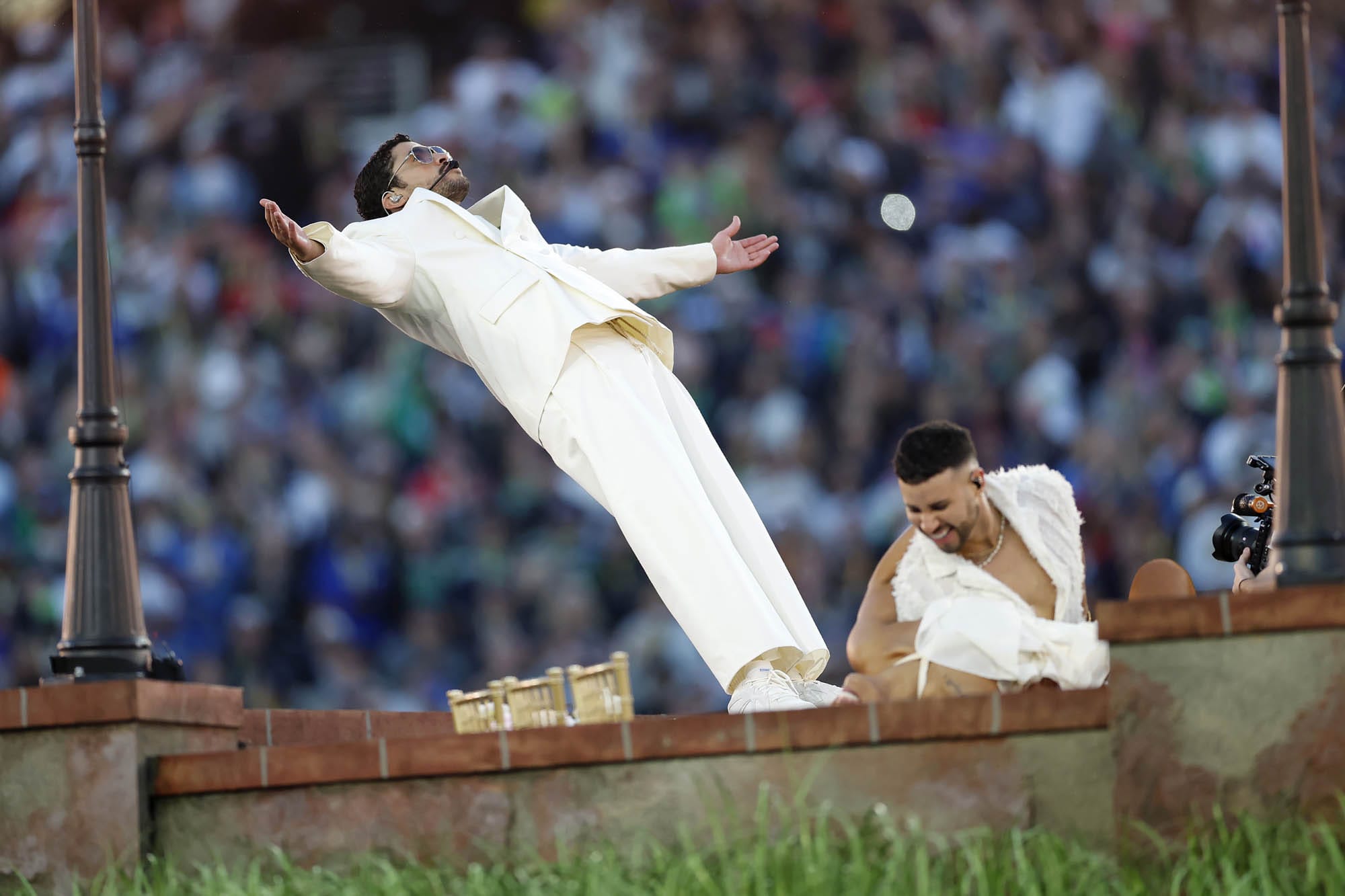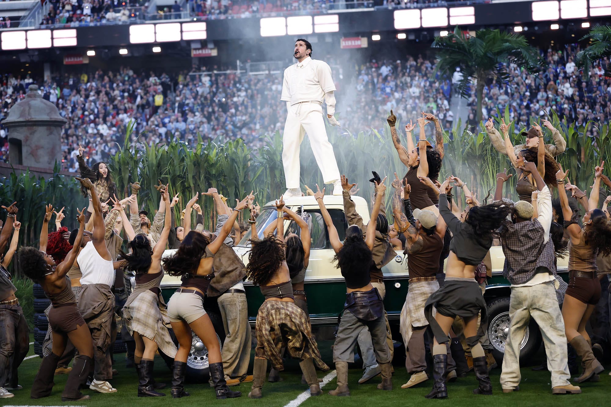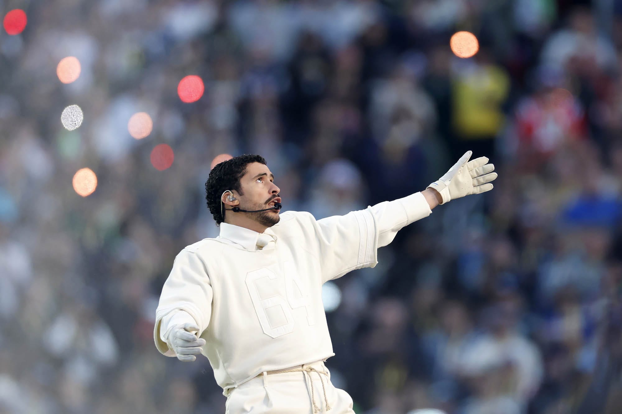 Bad Bunny performs during the Apple Music halftime show at Super Bowl LX between the Seattle Seahawks and New England Patriots, Levi Stadium, Santa Clara, California
