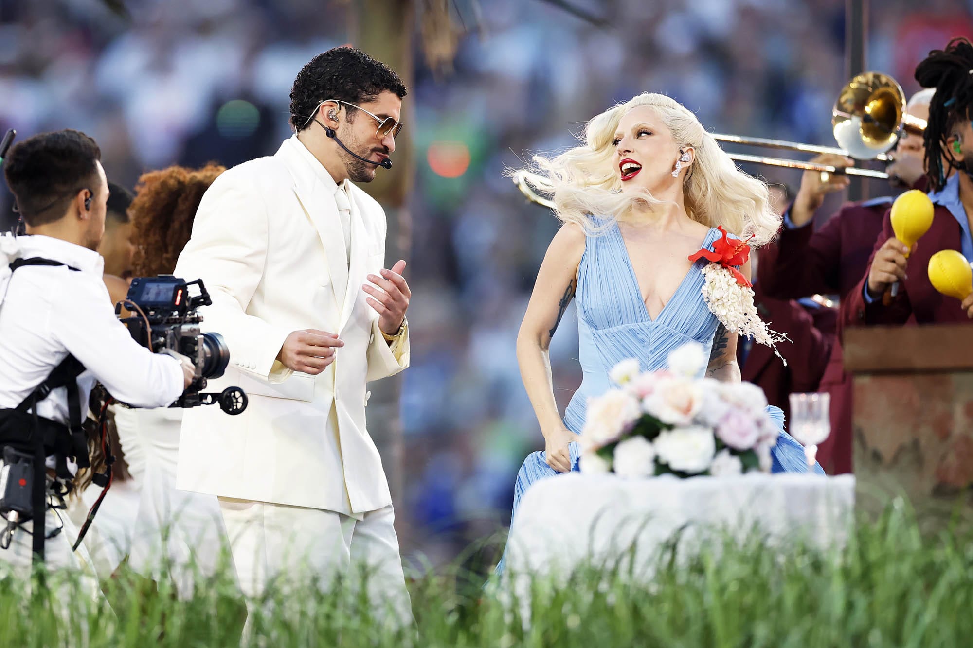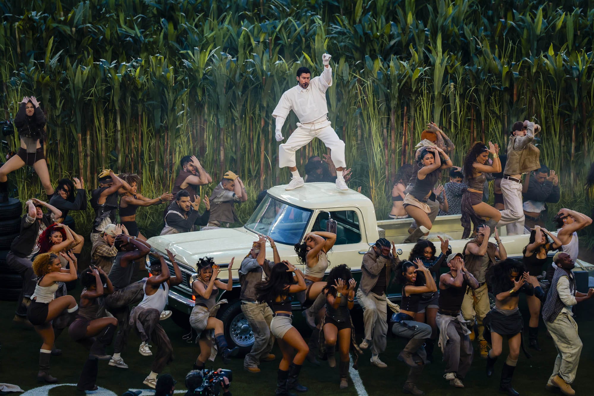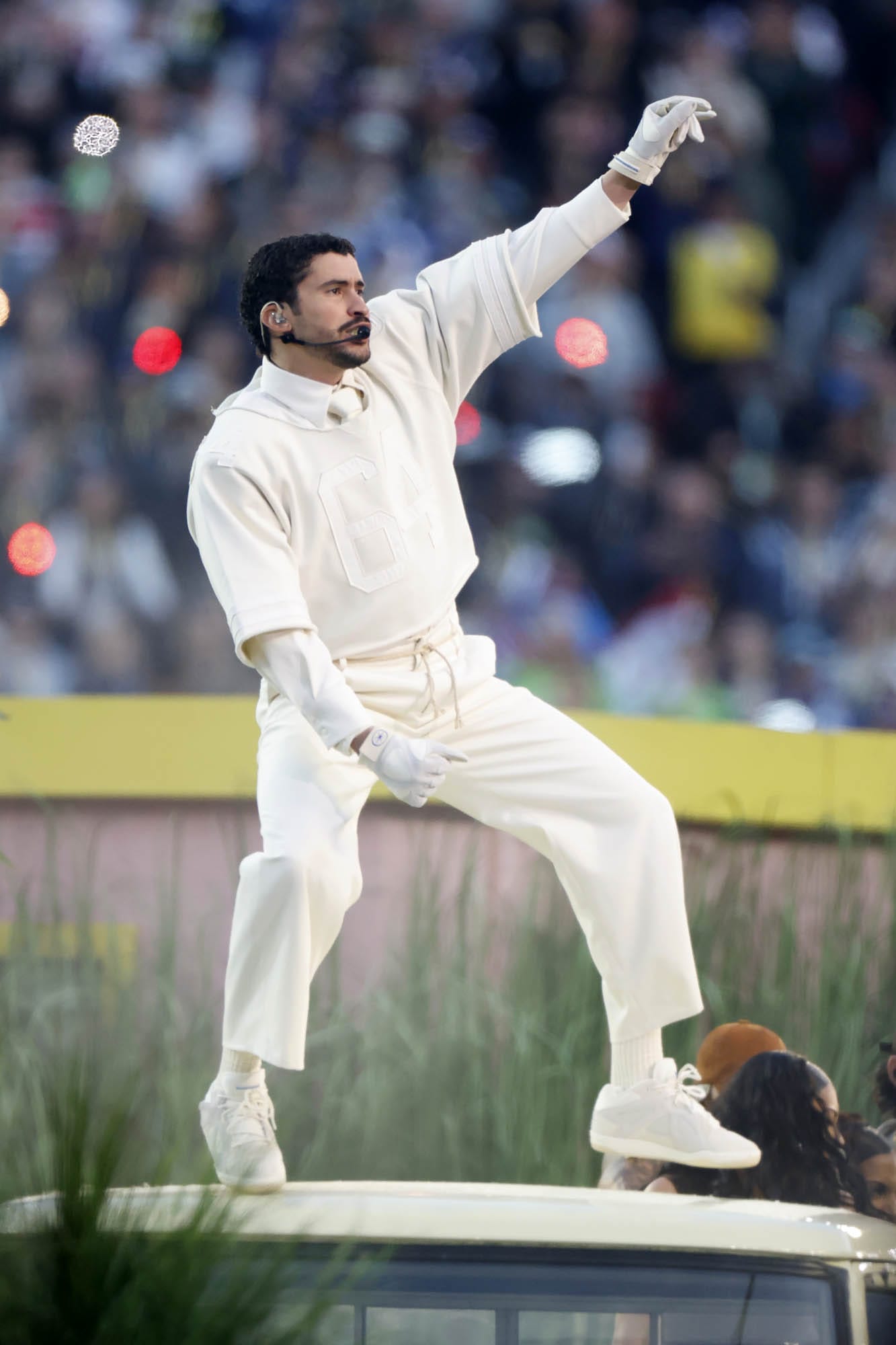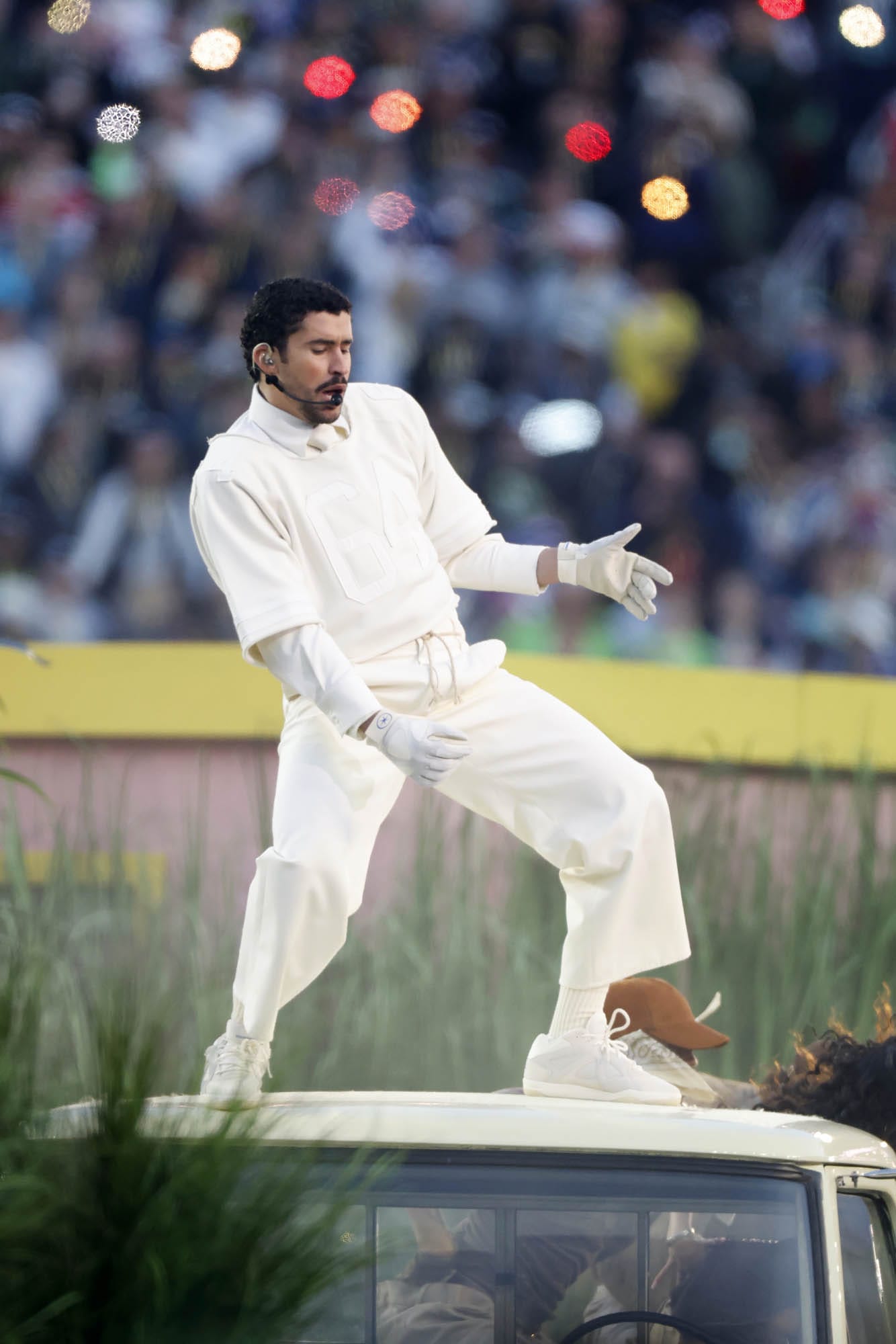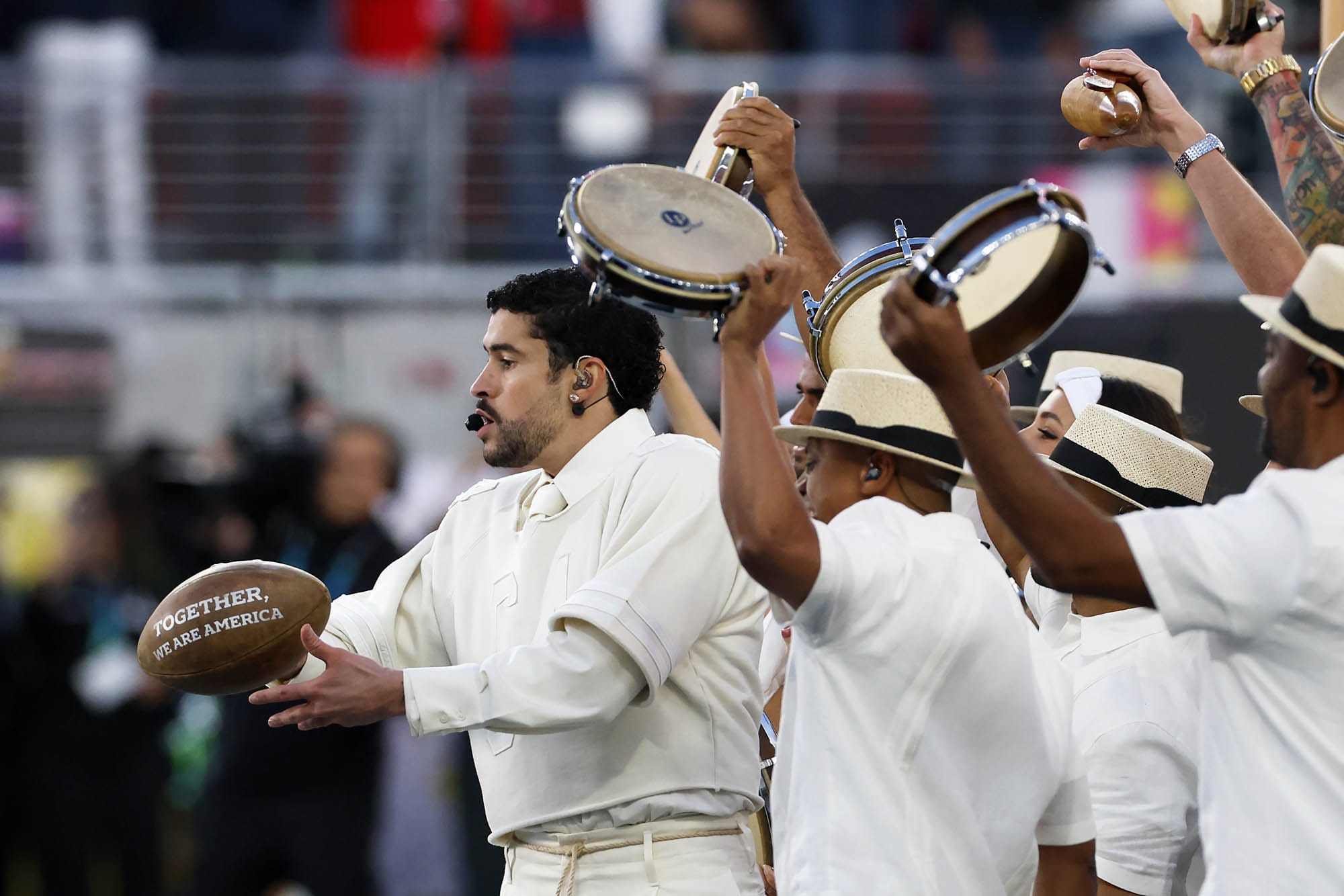 Bad Bunny performs during the Apple Music halftime show at Super Bowl LX between the Seattle Seahawks and New England Patriots, Levi Stadium, Santa Clara, California