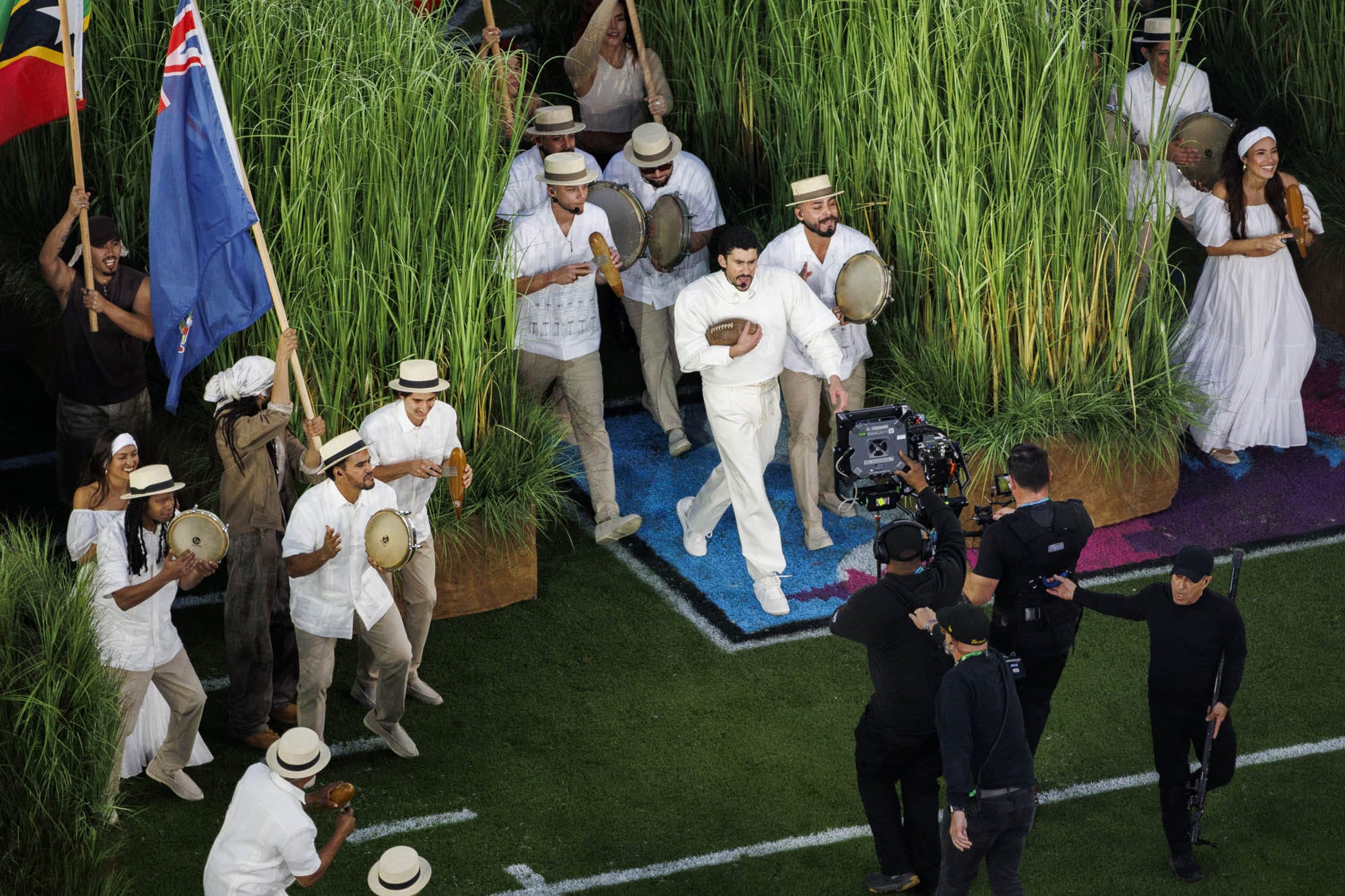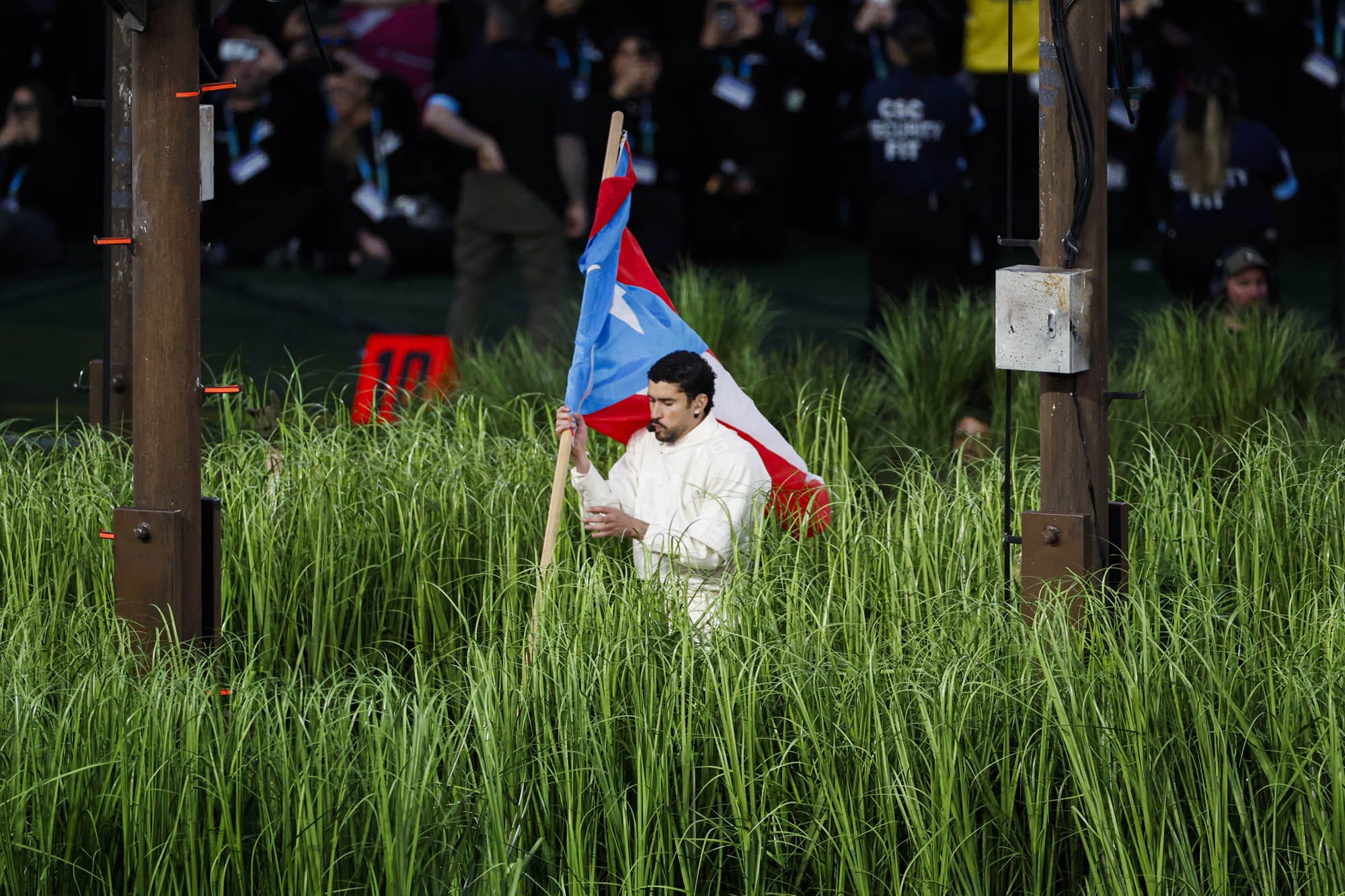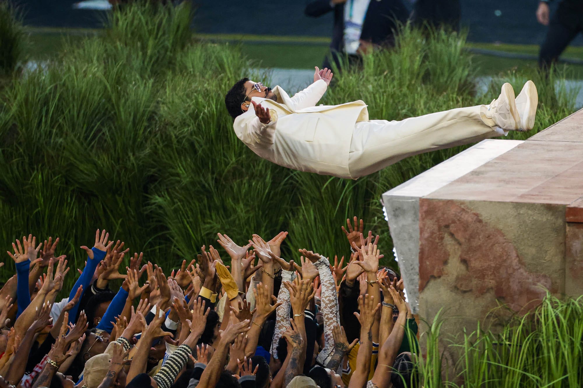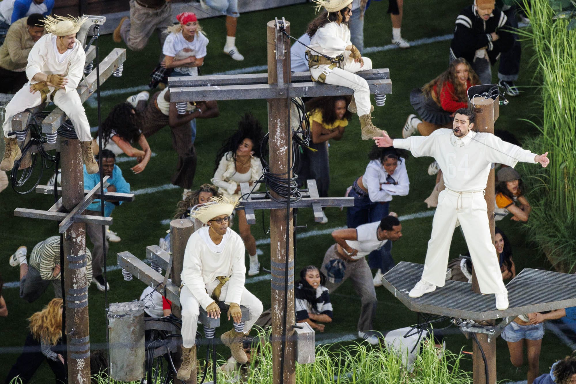 Bad Bunny performs during the Apple Music halftime show at Super Bowl LX between the Seattle Seahawks and New England Patriots, Levi Stadium, Santa Clara, California