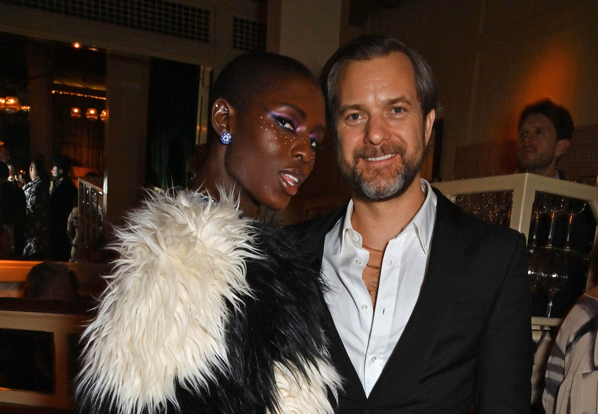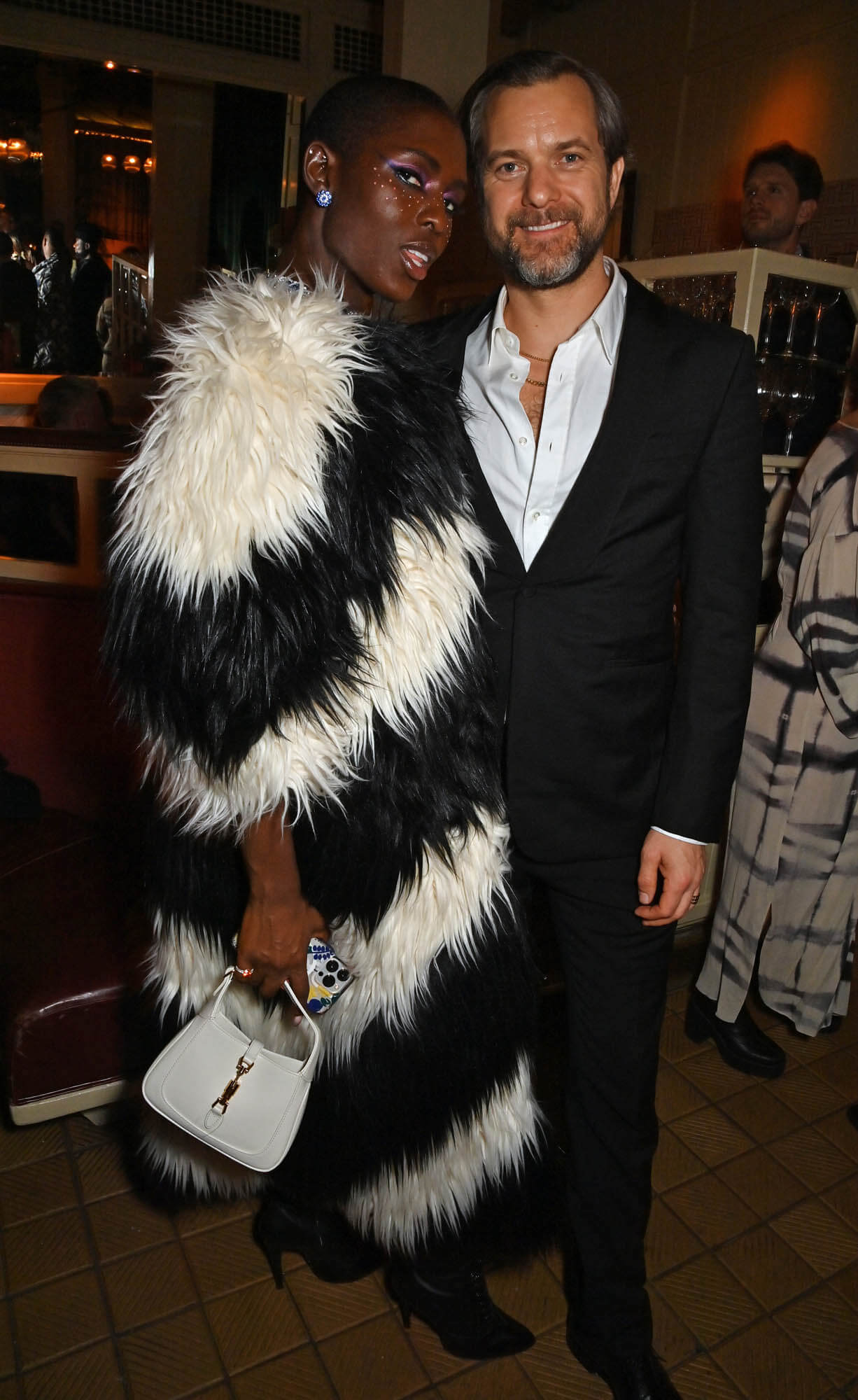 Jodie stayed in purple for the after-party but switched it up in a slip dress under a black and white fur coat with tall black boots. And added her husband to the wardrobe.