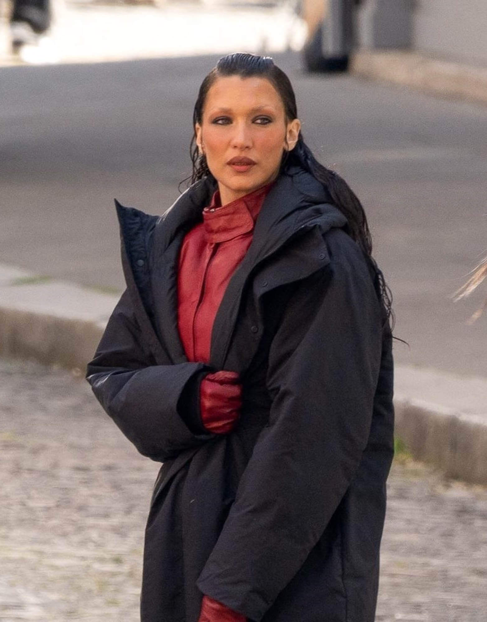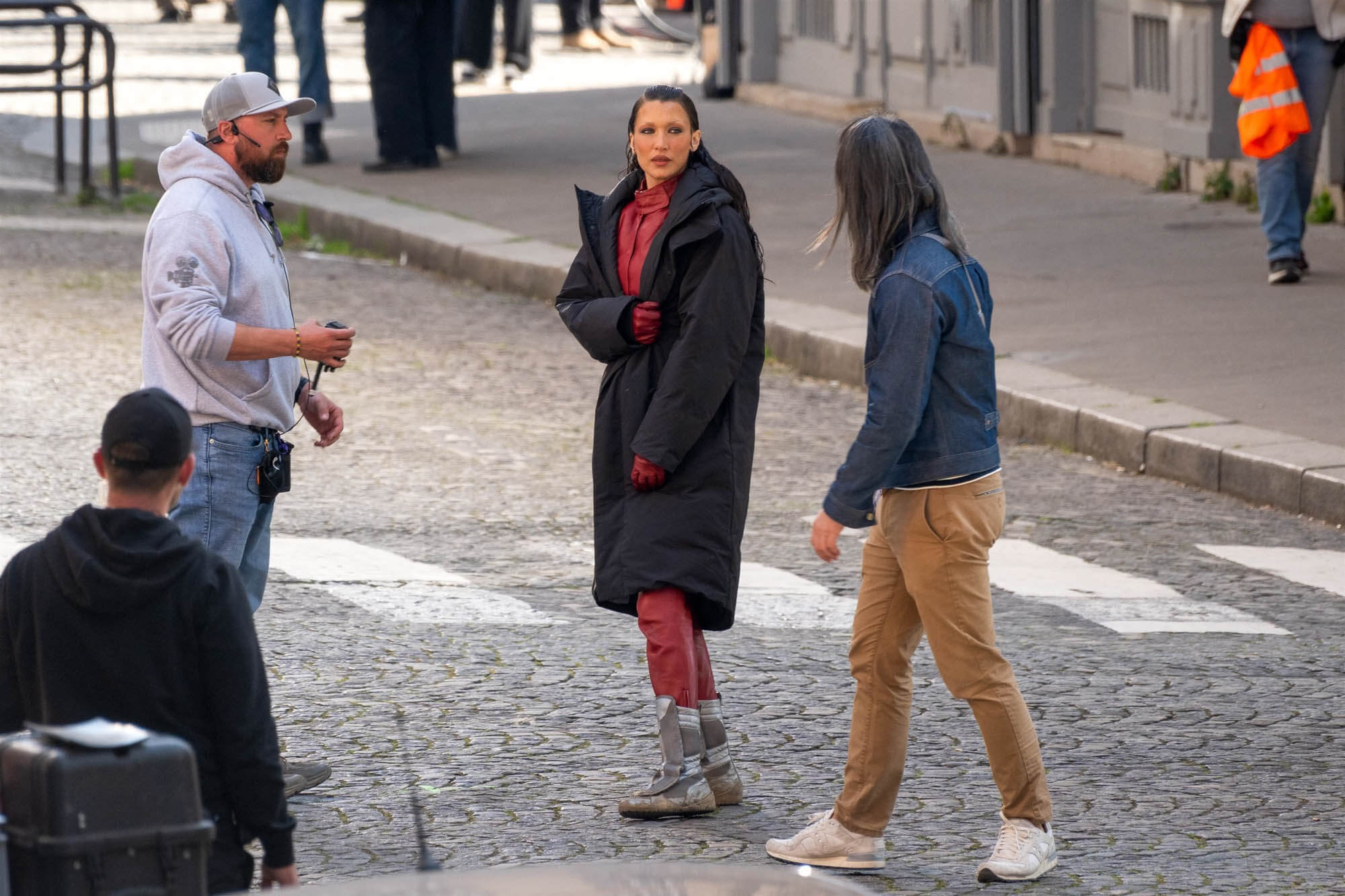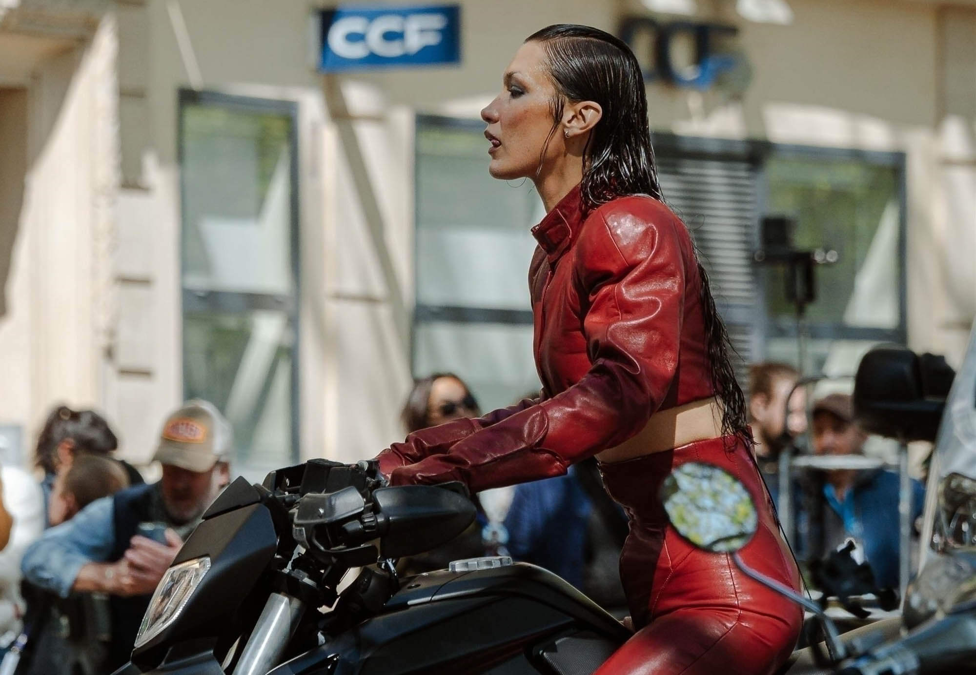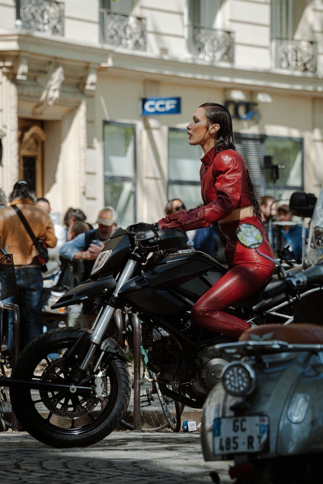 Bella Hadid was photographed in Paris today filming scenes for Ryan Murphy’s The Beauty. As you can see, she is heavily made up, in a two-piece jumpsuit, riding a bike, and the scene involves some kind of accident.