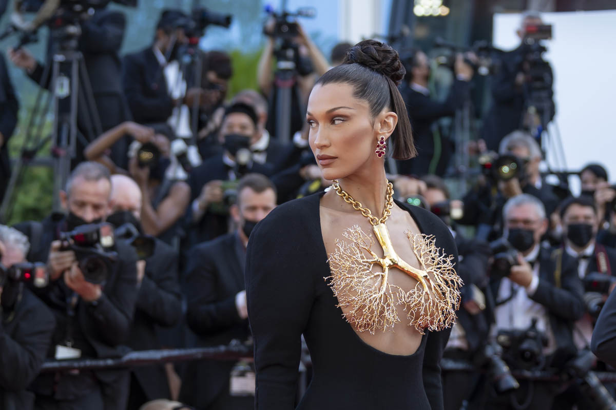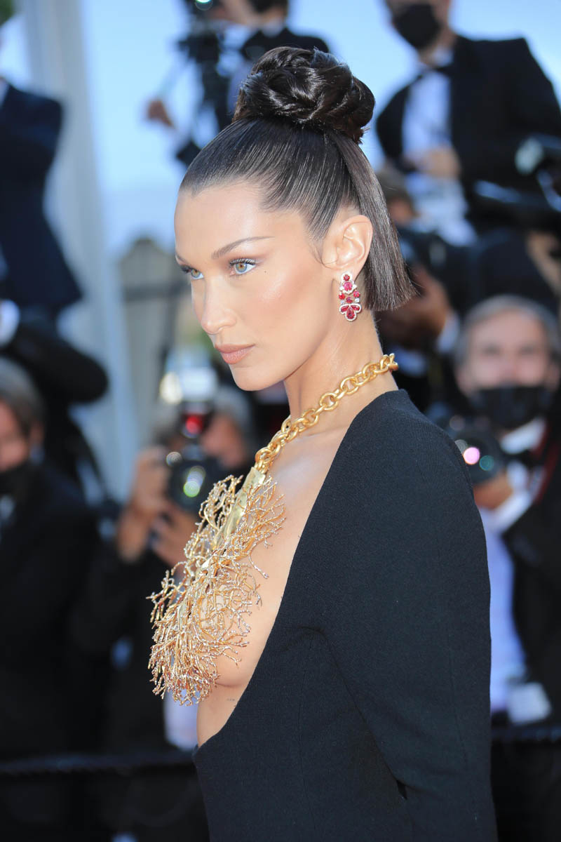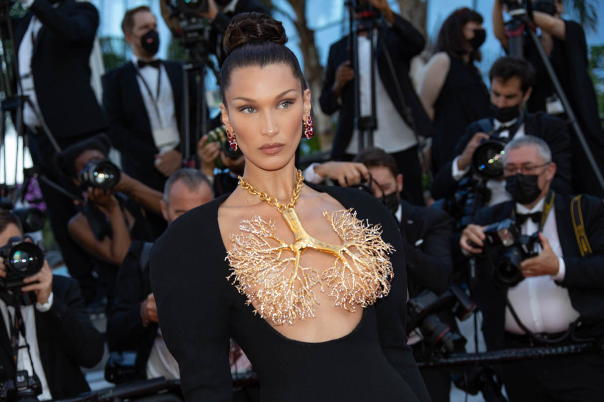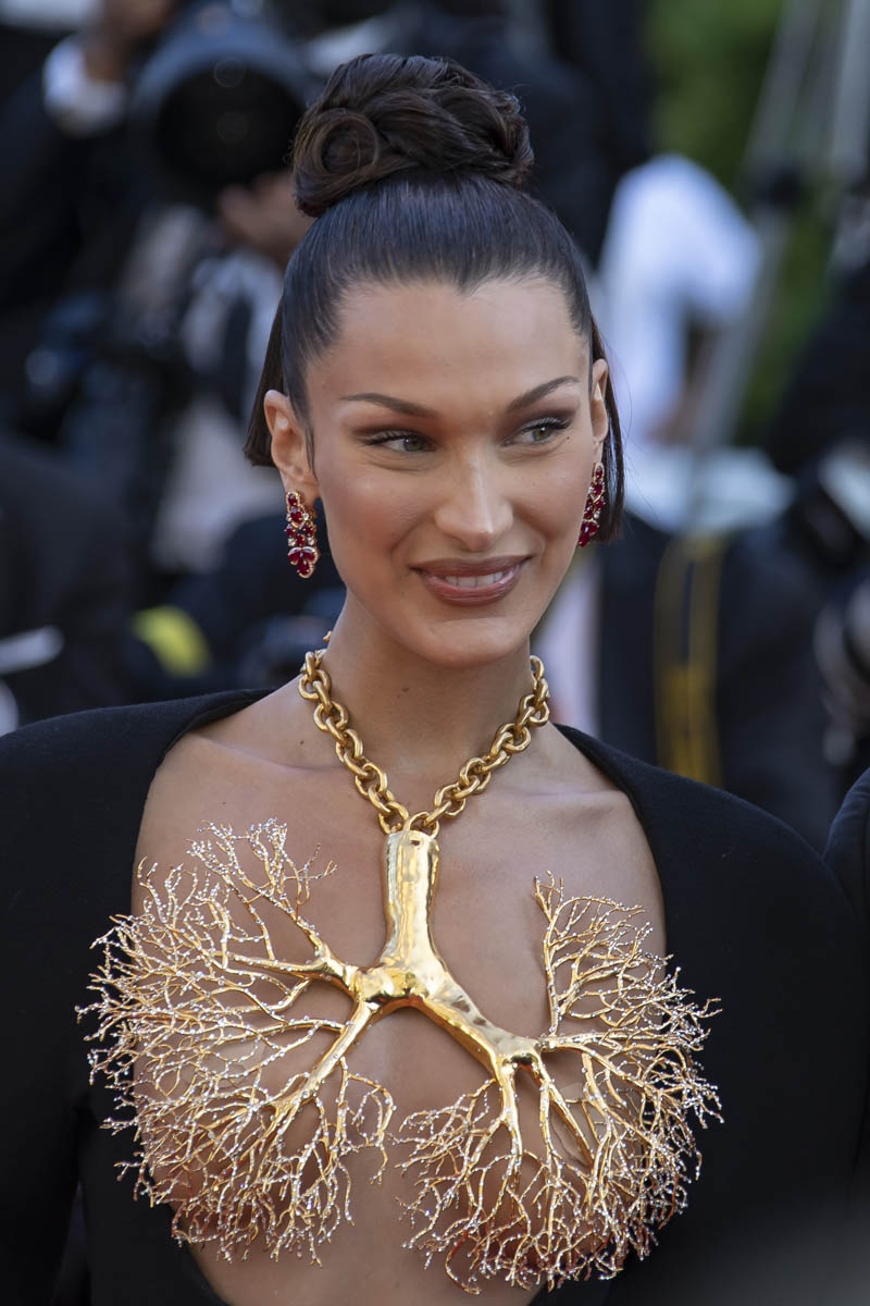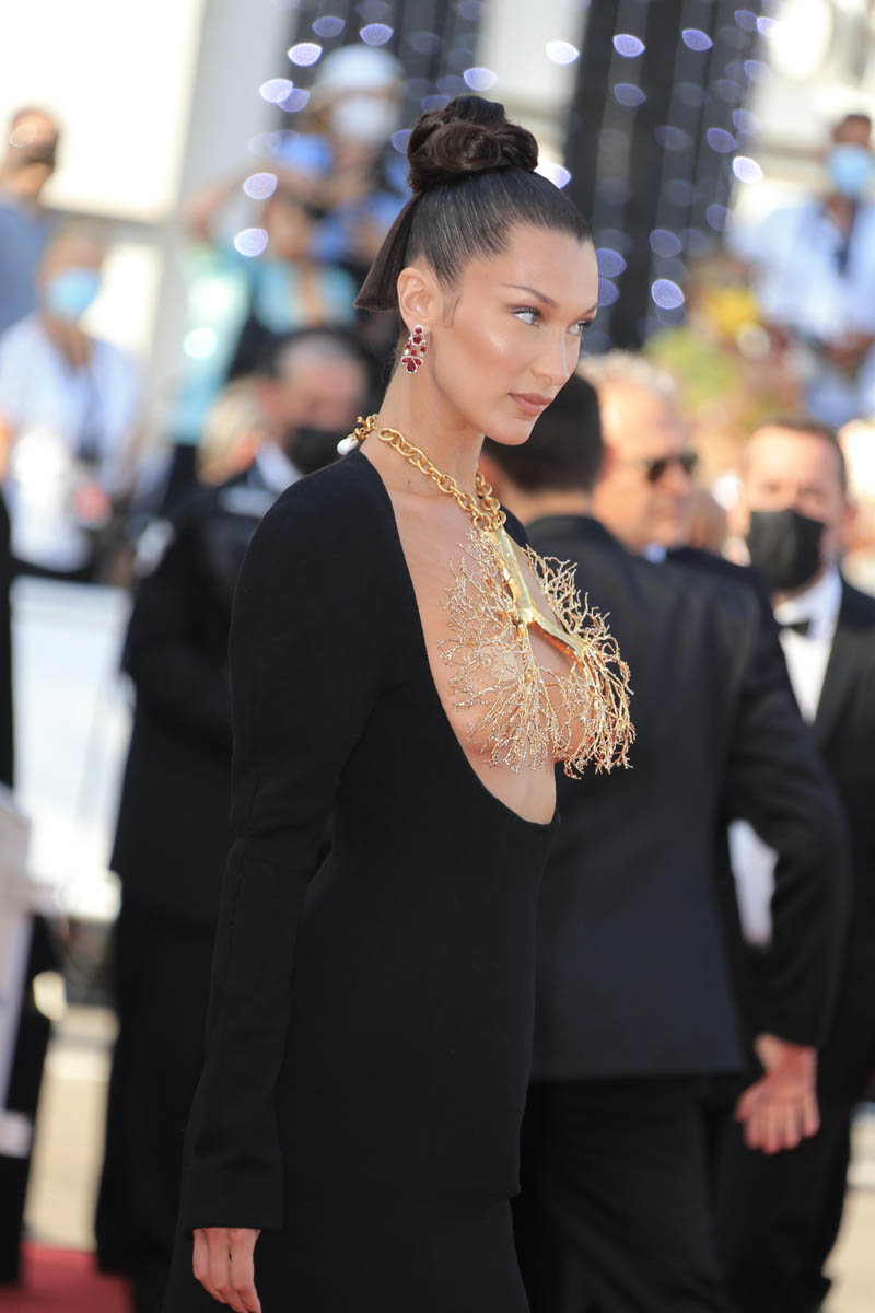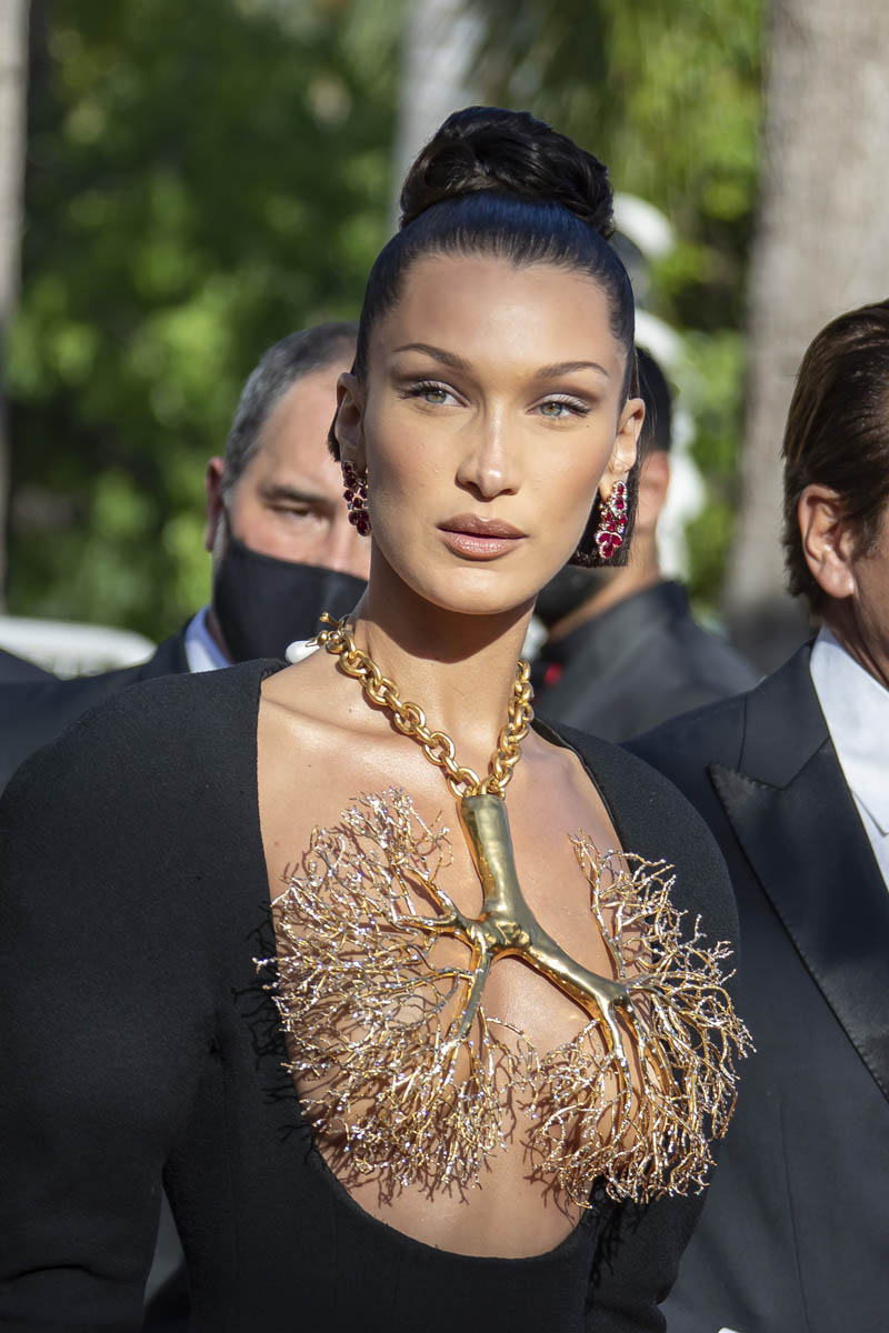 Models have always been a regular feature of the Cannes Film Festival. Cannes is the festival of unapologetic glamour and excess. Everything has eight layers of adornment on it. And part of a model’s job is to adorn. This year, marking the return of Cannes after a COVID pause, the most high-profile model of Cannes 2021 has been Bella Hadid. And yesterday she served the most spectacular look that we’ve seen so far on the Croisette. It’s Schiaparelli: