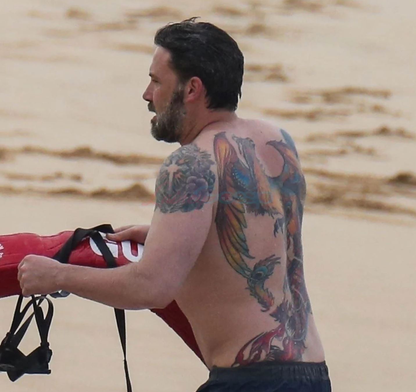 Everyone has been passing around Naomi Fry’s essay at The New Yorker this week, The Great Sadness of Ben Affleck, inspired by those shots of him in Hawaii. Or, rather, those shots of his rising phoenix back tattoo in Hawaii. You know the ones. But, just in case you forgot, although I’m not sure how you could, because that tattoo has now made it into the Gossip Smithsonian at this point, have another look: