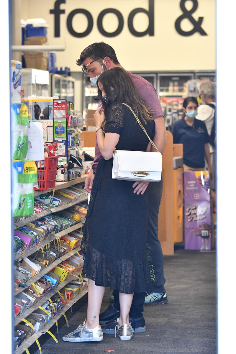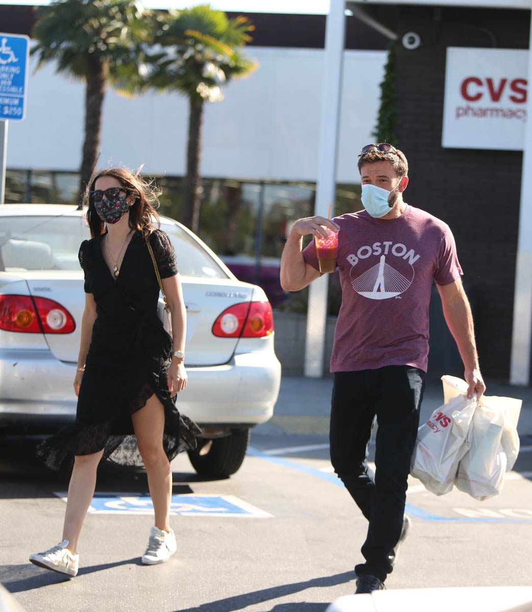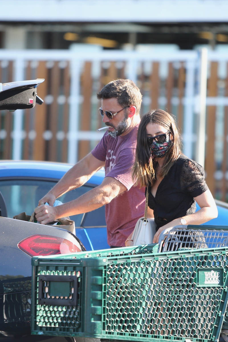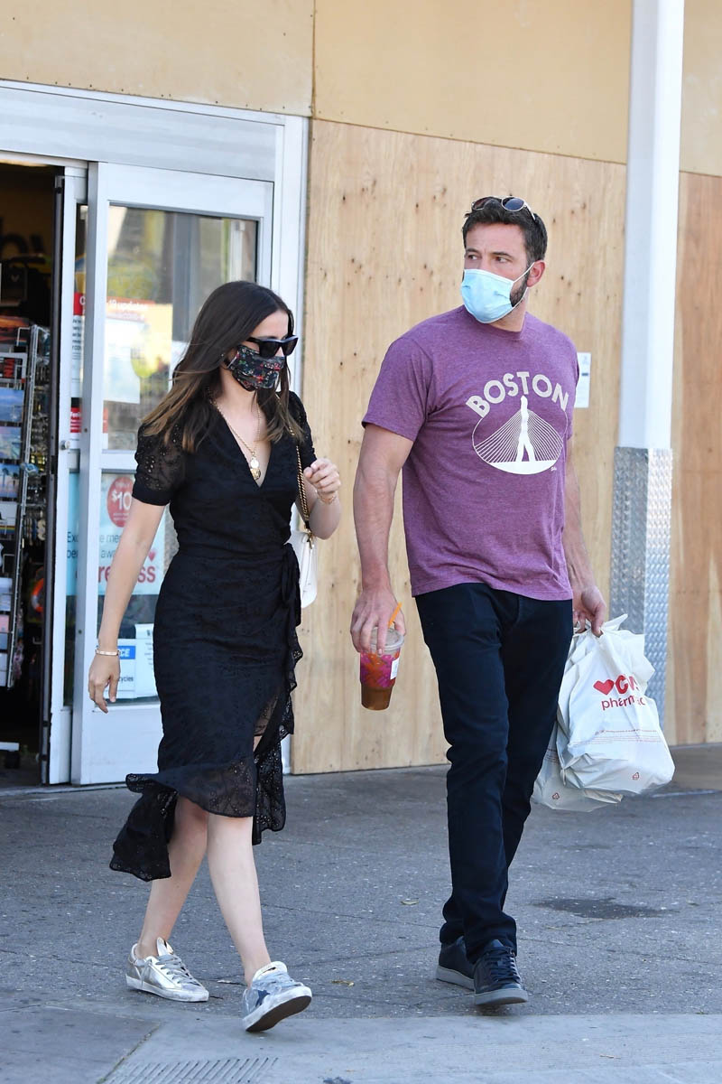 This time, they’re not dog walking, they’re shopping for groceries and other supplies. Here are Ben and Ana at CVS and Whole Foods yesterday, getting domestic. Not that they haven’t been domestic now for months. Looks like they left with quite a haul at both places. I mean it’s not stockpiling, but it is two carts between them full of groceries. Which in these times makes sense because not that many people are going out for dinner. A lot of us are still eating every meal at home, so cooking almost every meal at home. And I guess that applies to Ben and Ana too? Also, maybe they’re loading up on all that food for the kids too. Ben’s children have been spending time at his place with Ana. I don’t have kids but I have seen how kids can go through food. It’s astonishing.