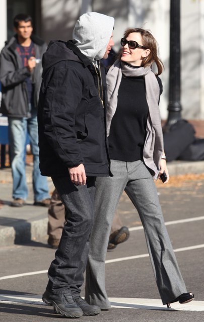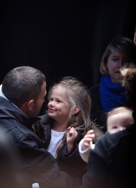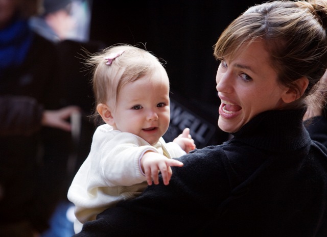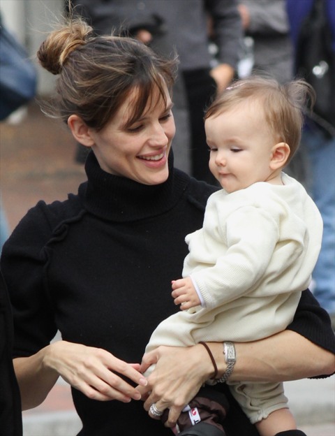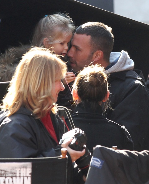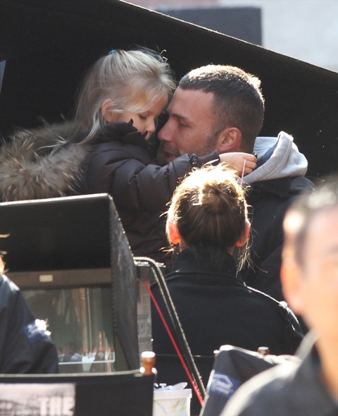 So this is the family Affleck today on set in Boston. Jennifer Garner brought the girls to see daddy on break, and daddy’s face lit up. Ben and Jen were also spotted sharing a loving moment together. She put on some high heels for the occasions so their heads could be framed properly in the shot. Smart and strategic.