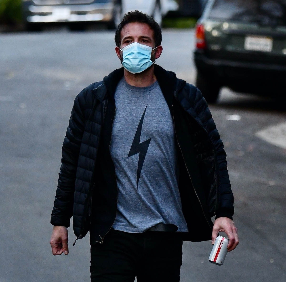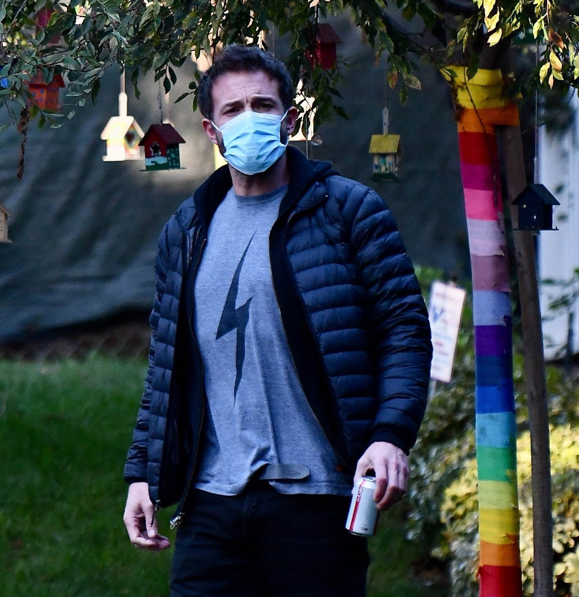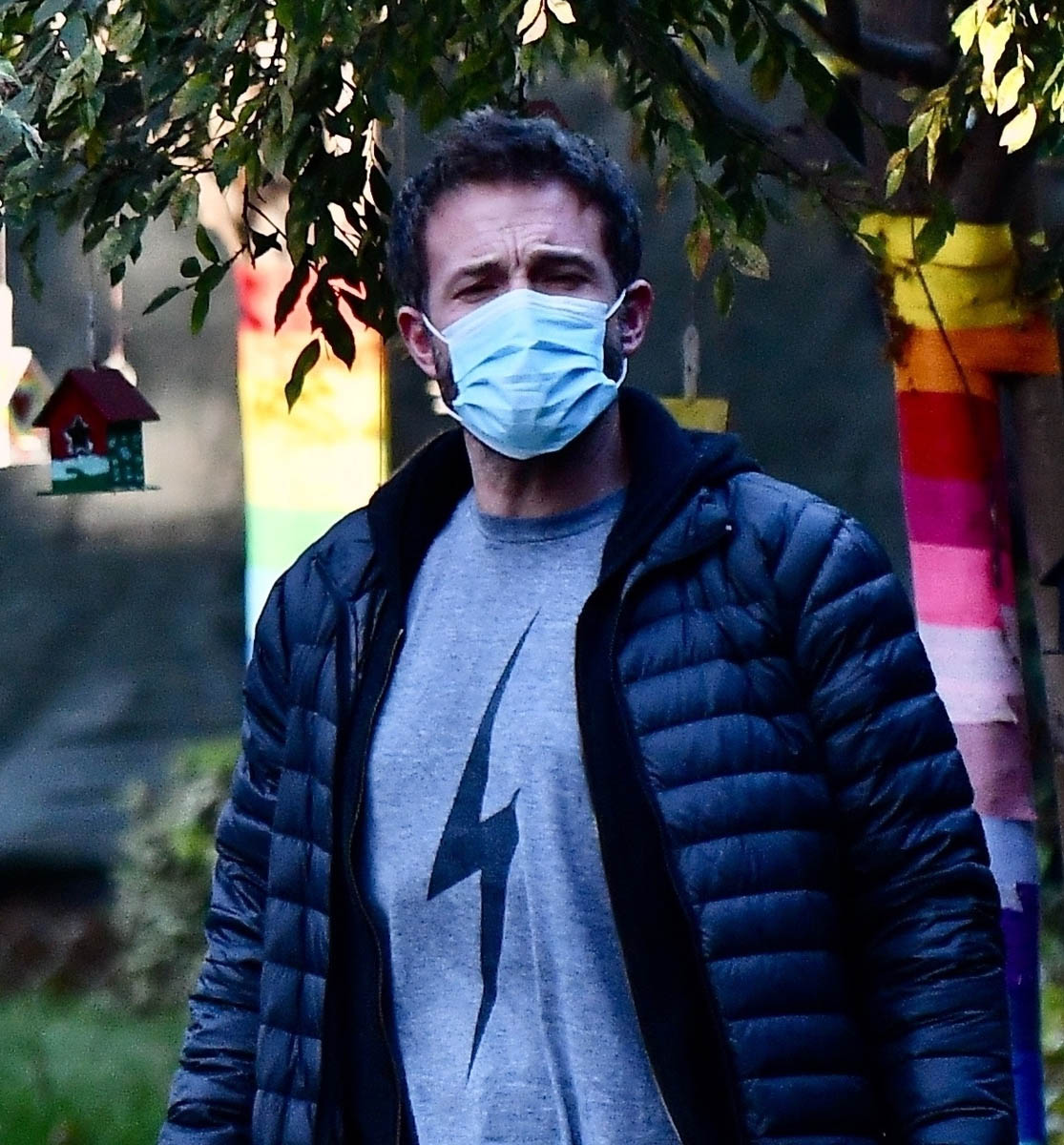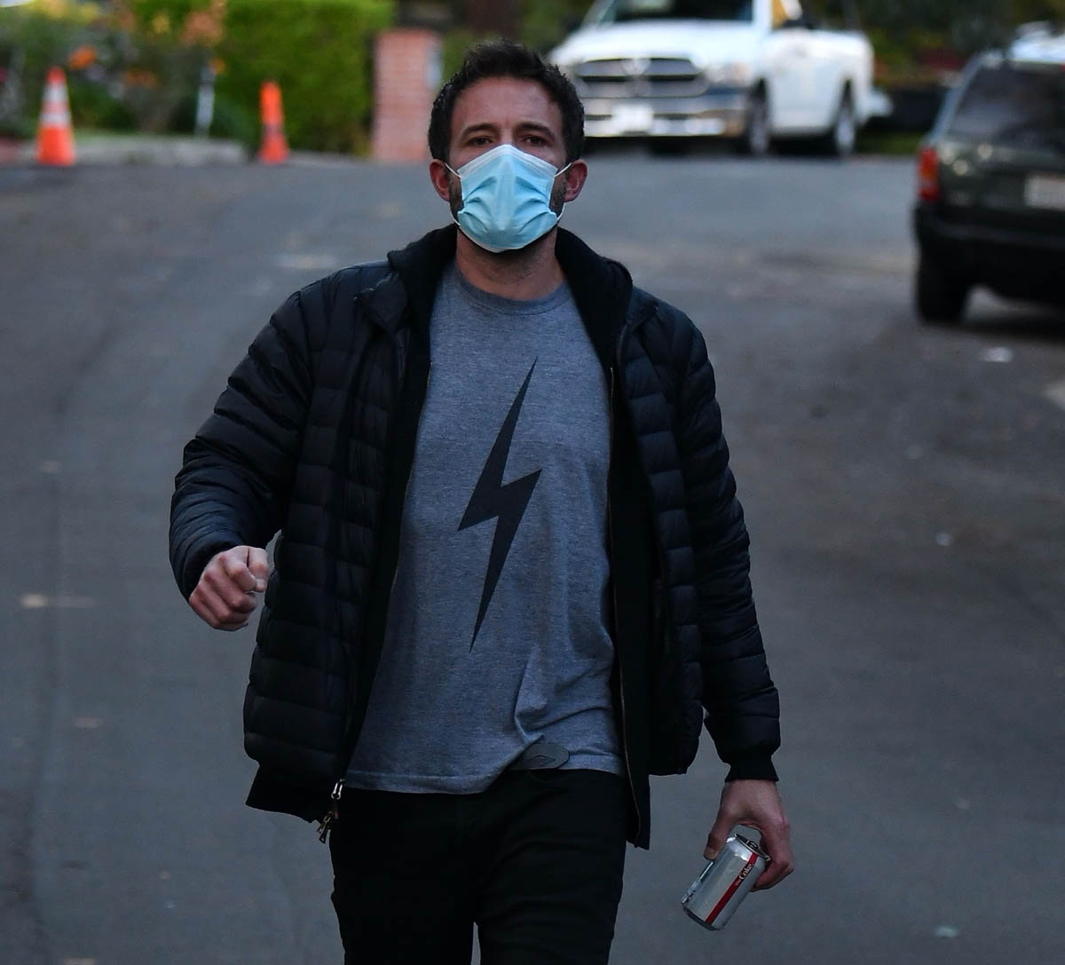 As you can see, Ben’s wearing what may be his favourite t-shirt. And he apparently has several of them. We’ve seen him in a darker one with a white lightning bolt and here he is in the grey version with a black lightning bolt. Nerd internet tells me this is about The Flash which of course makes sense since he was Batman. But my mind immediately goes to Harry Potter because Ben is a Harry Potter fan. And at least one of his children is a Harry Potter fan. He’s said before that oldest daughter Violet is a “super Harry Potter nut” and she wanted him to be part of the movies. Well, um, I hear there’s a vacancy in the Fantastic Beasts franchise. You think Ben would make a good Grindelwald? More on that situation later.