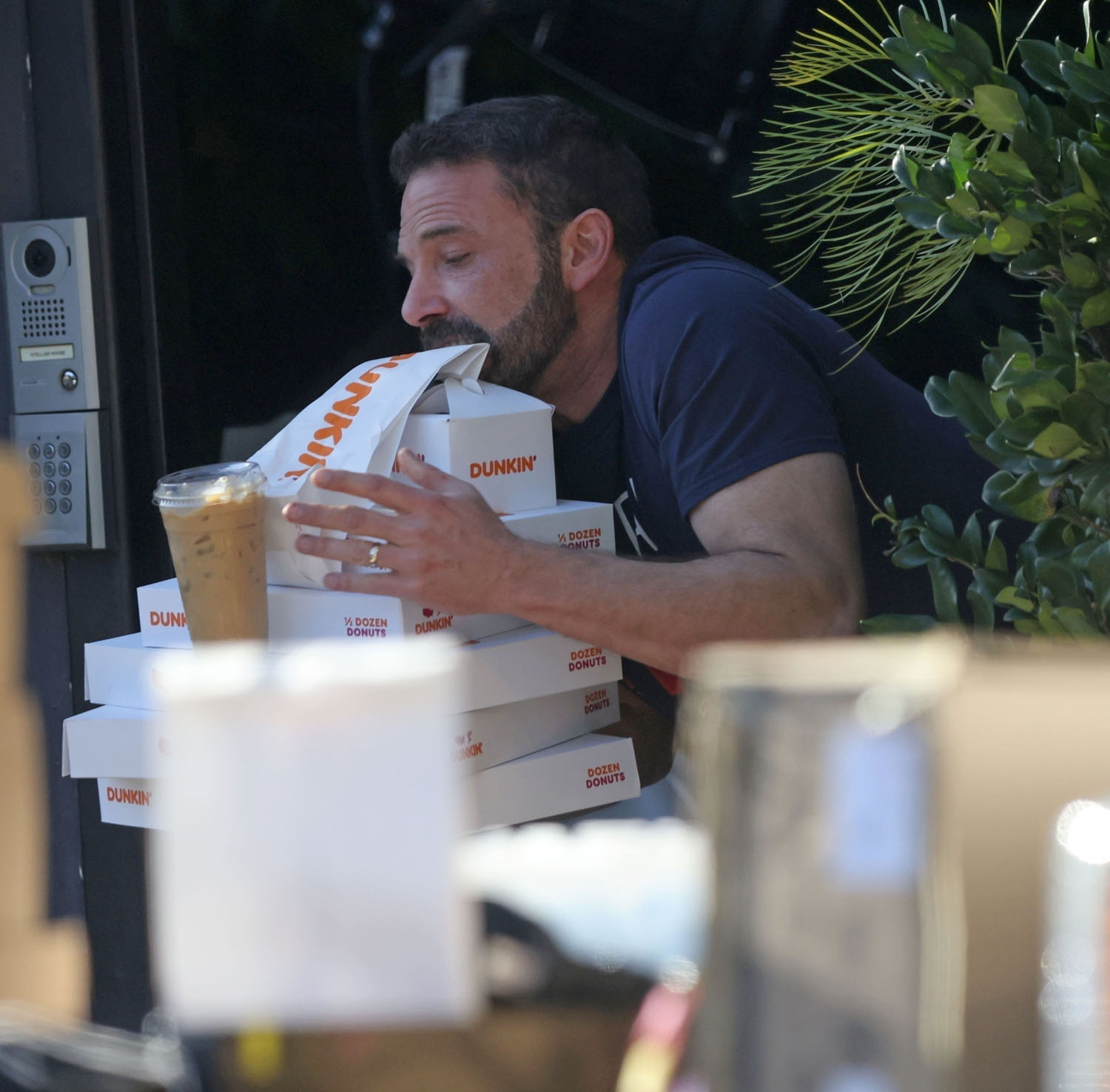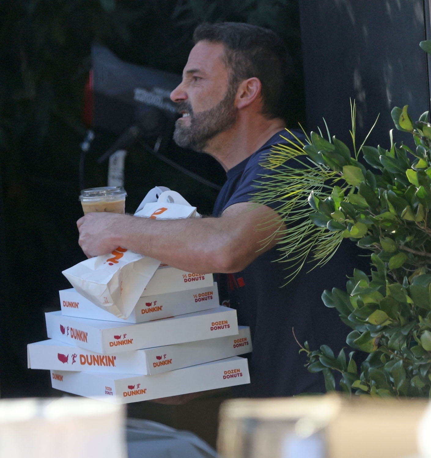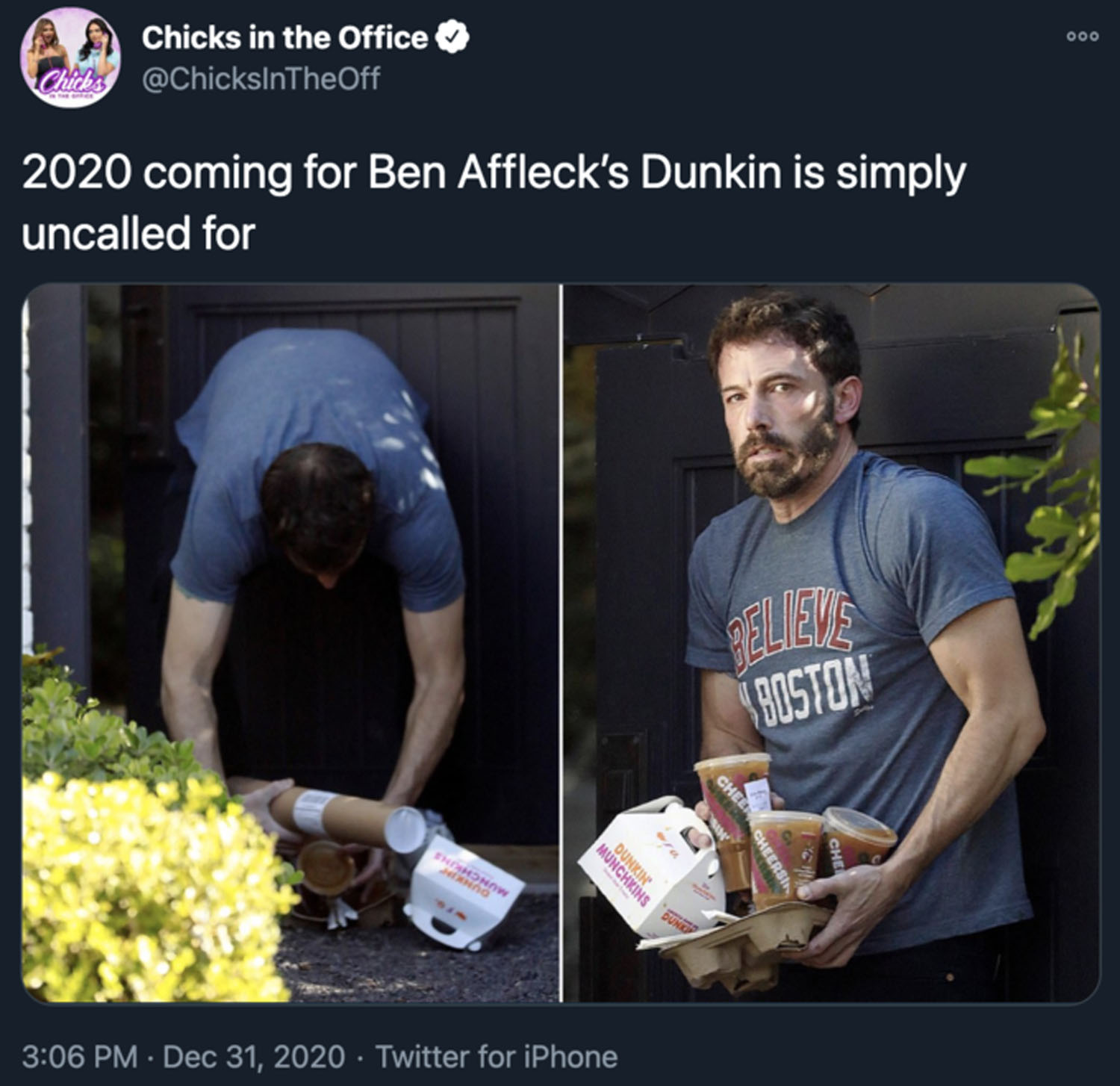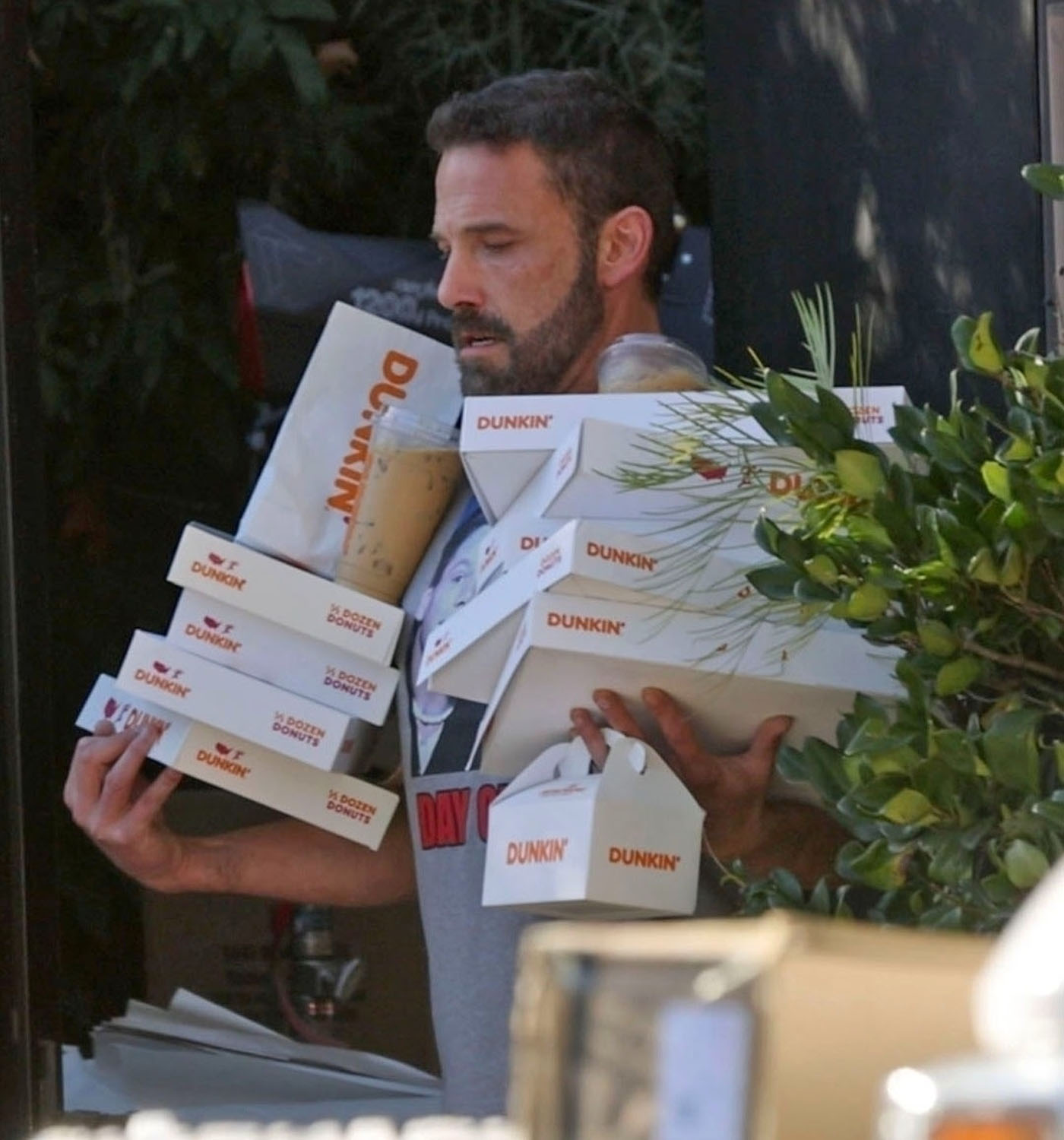 The other backstory, however, and a much funnier one is that Ben is recreating his meme. You remember it, I know you do. Because back then we were all stuck at home. It was 2020. It was lockdown. And Ben was getting Dunkin’ delivered to the door and the paps were always shooting him in various stages of sloppy and … well… Ben and Dunkin’ became a meme.