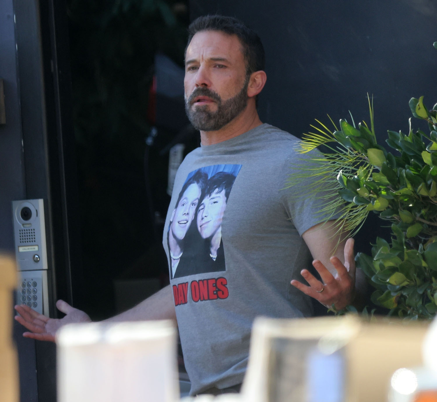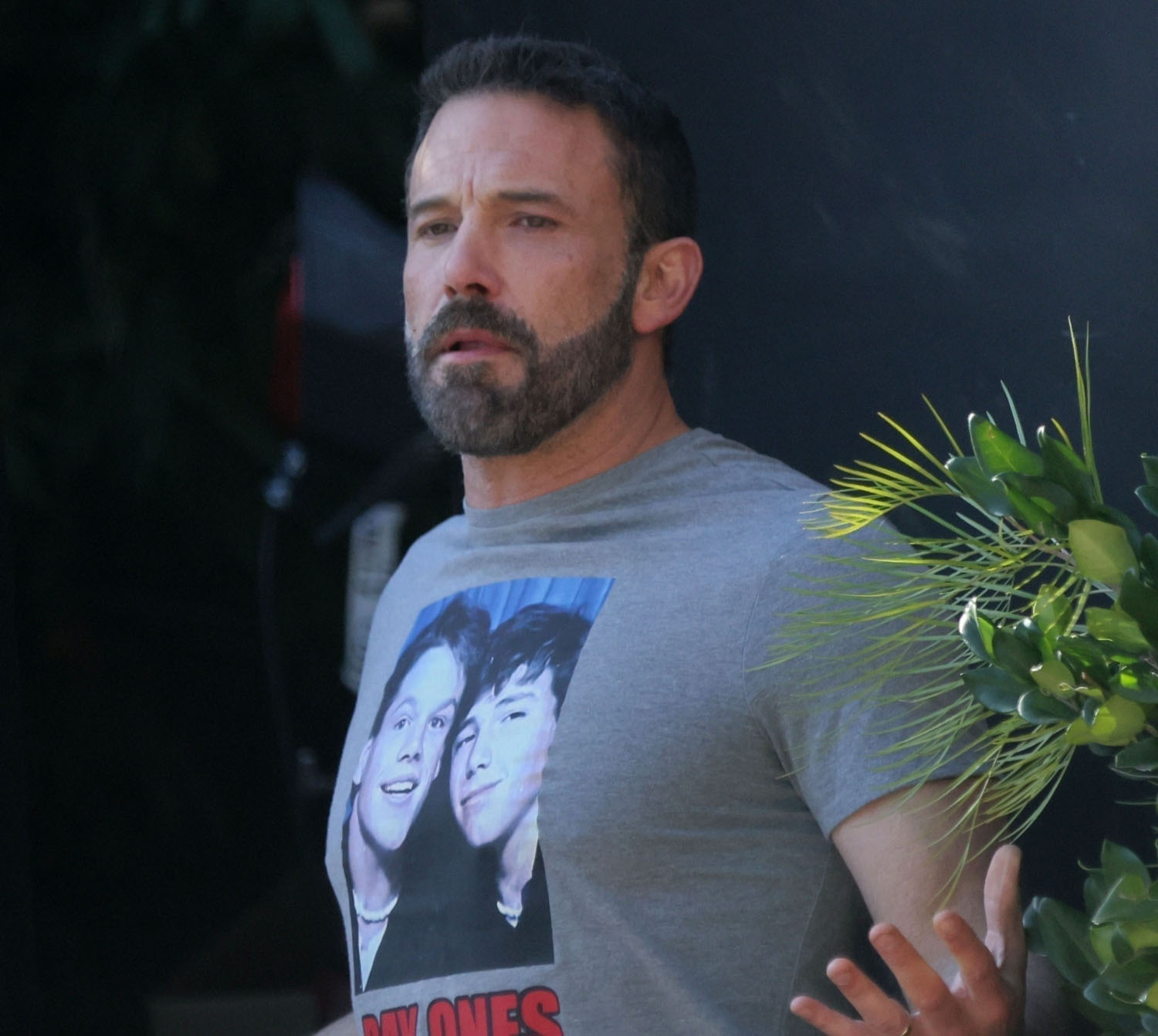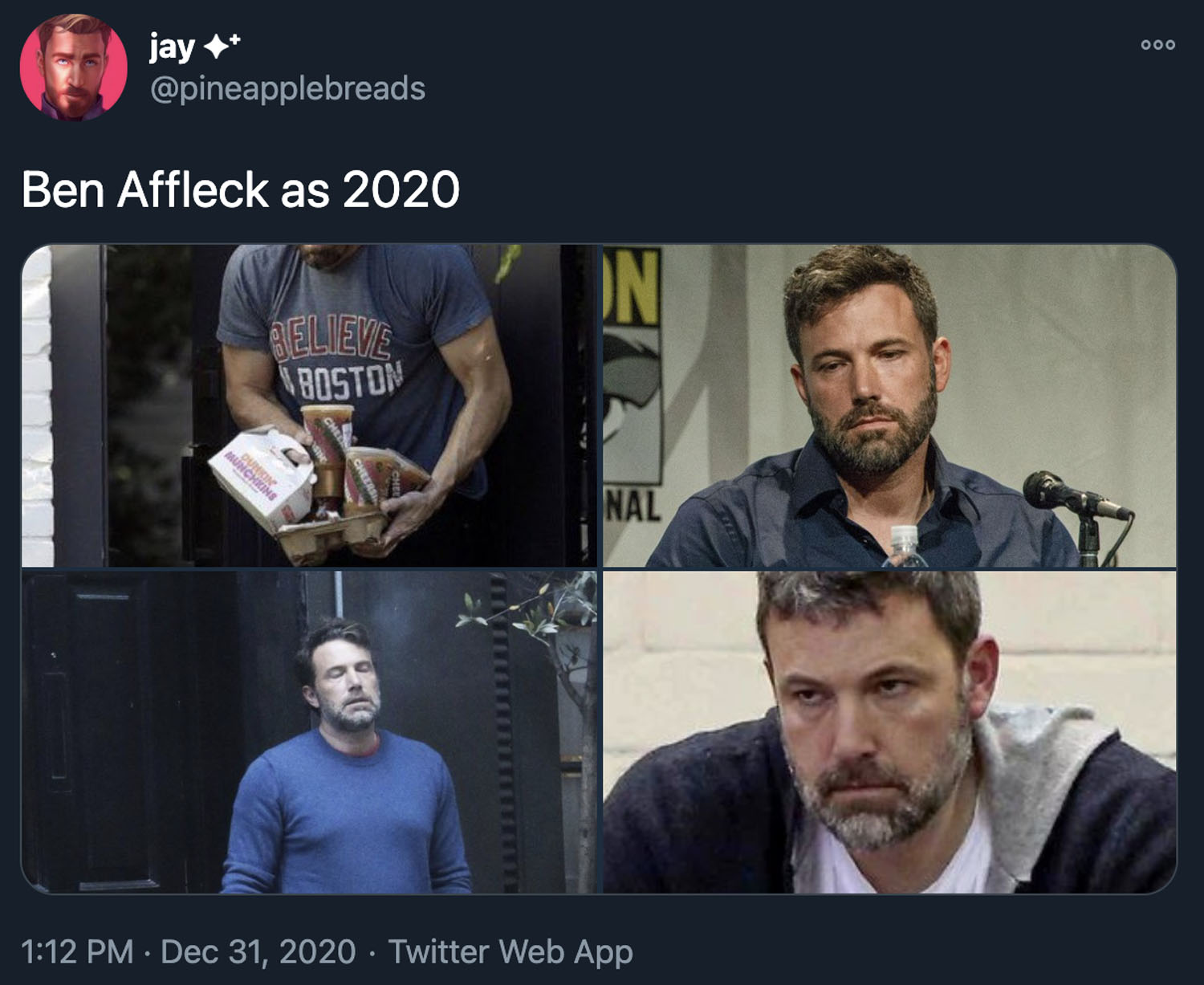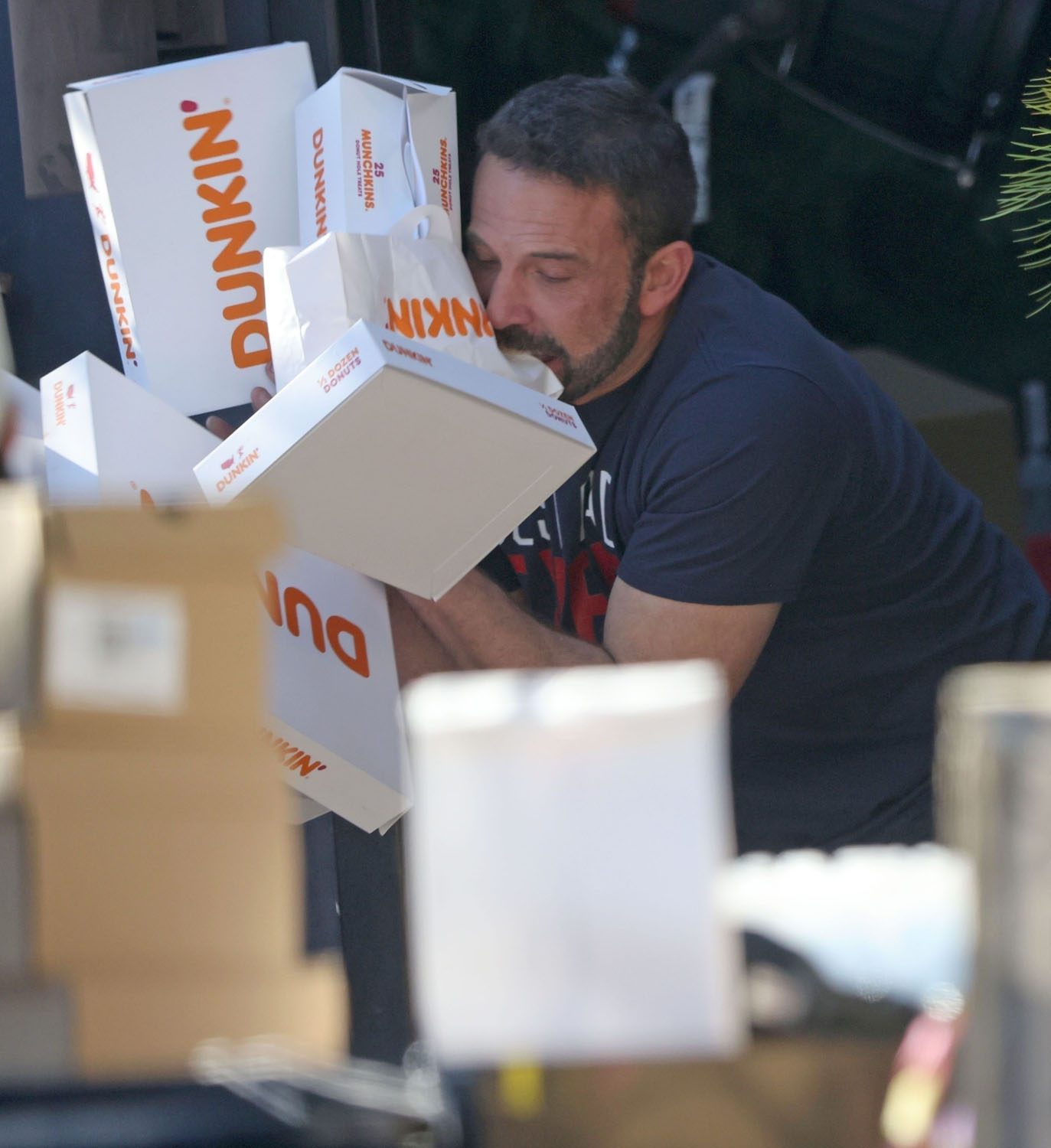 The other backstory, however, and a much funnier one is that Ben is recreating his meme. You remember it, I know you do. Because back then we were all stuck at home. It was 2020. It was lockdown. And Ben was getting Dunkin’ delivered to the door and the paps were always shooting him in various stages of sloppy and … well… Ben and Dunkin’ became a meme.