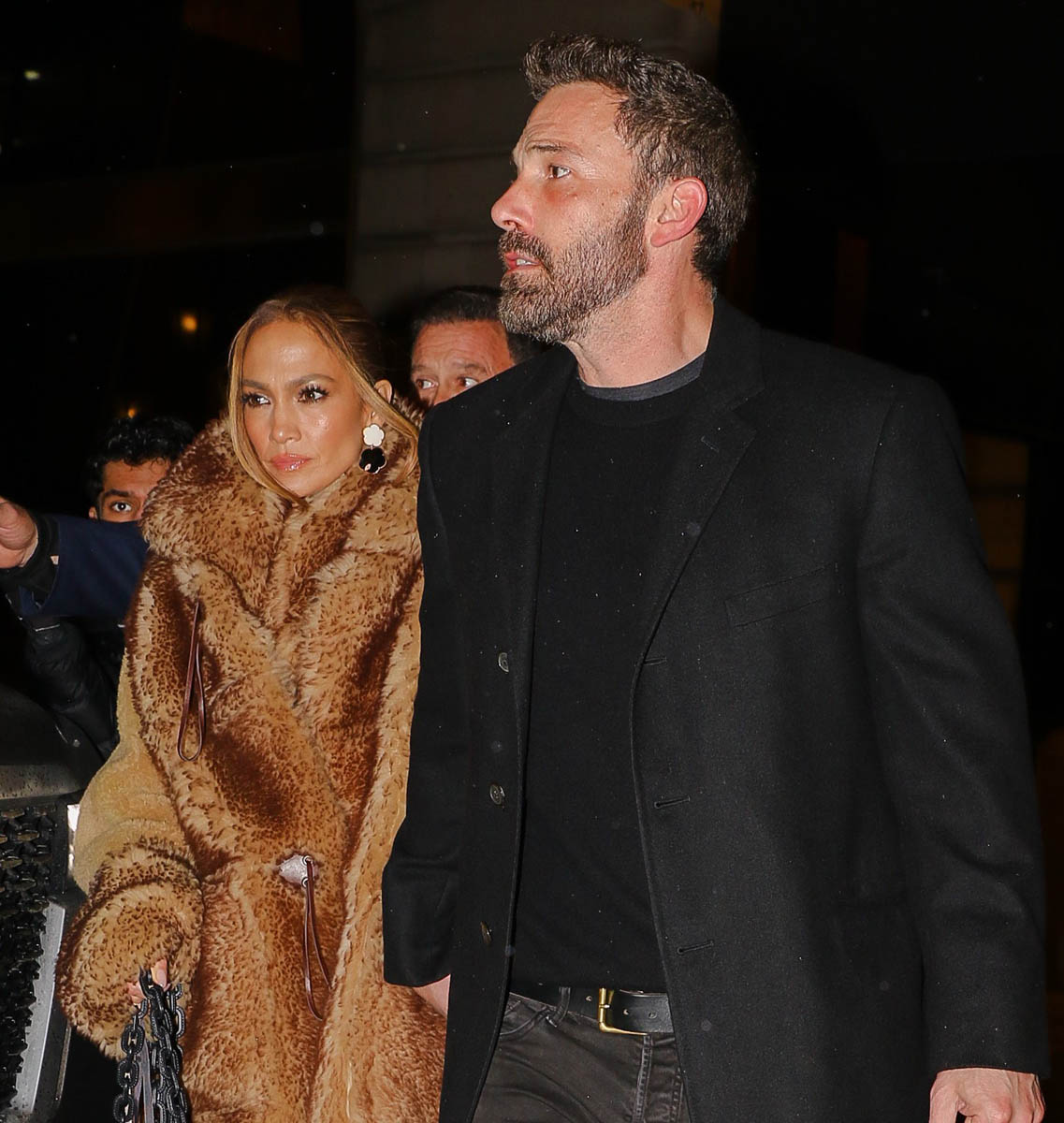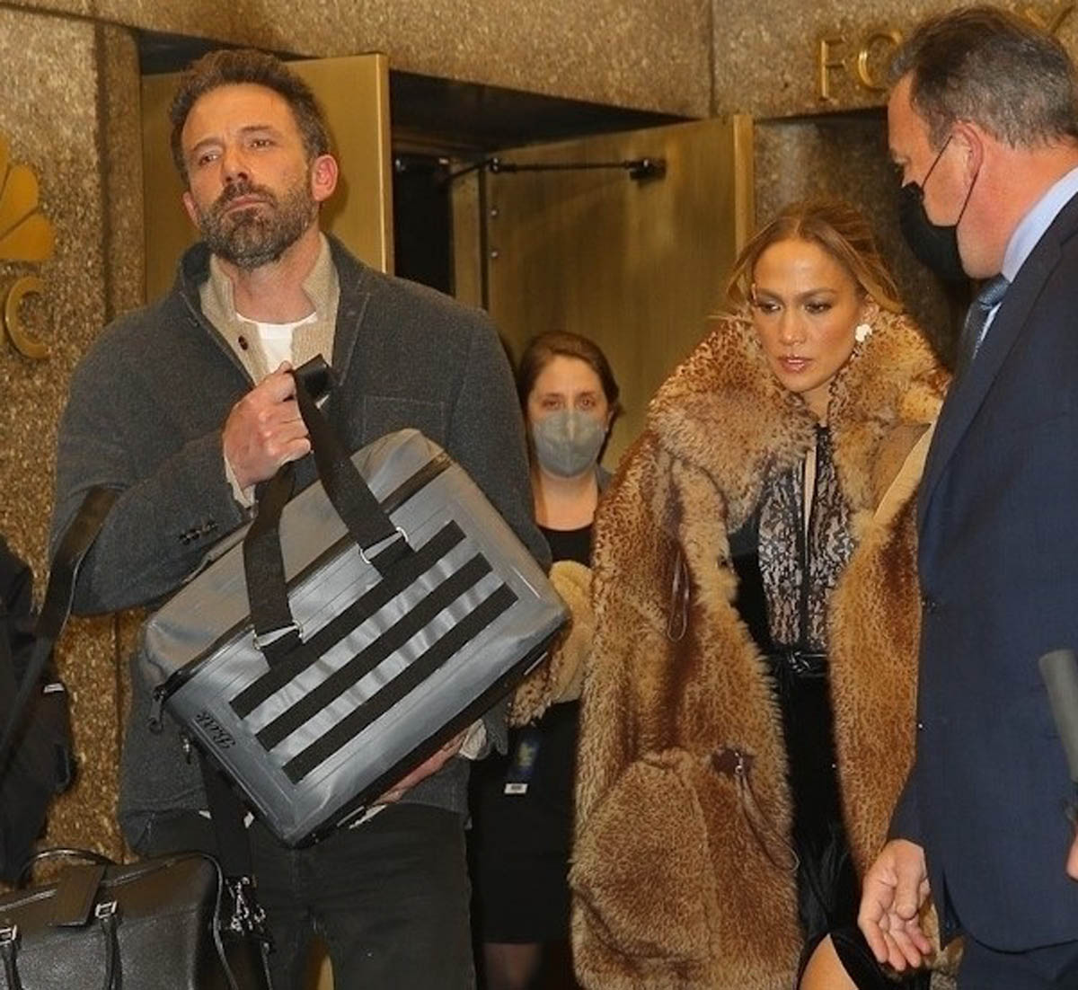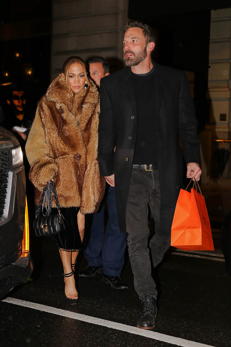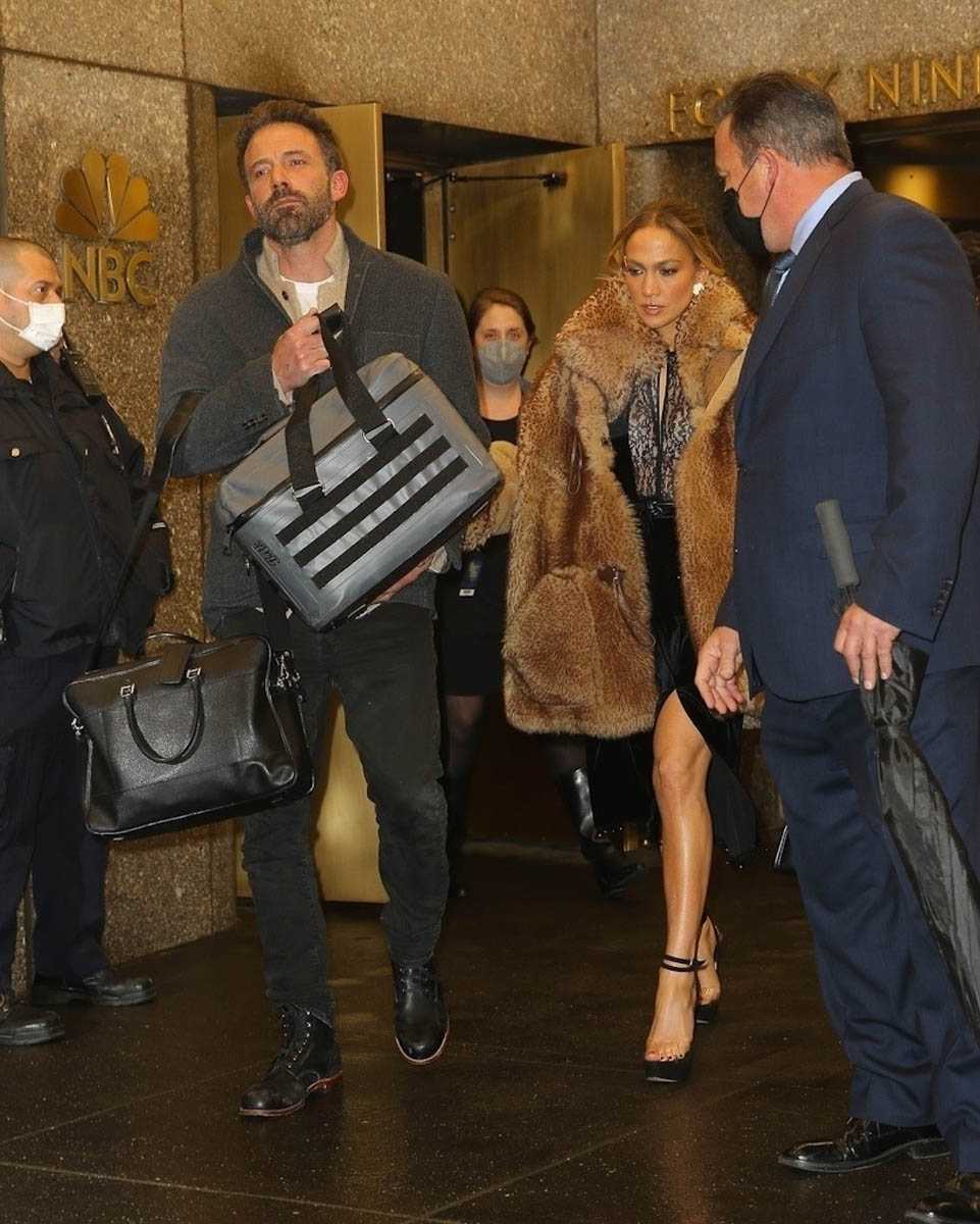 Here’s Bennifer last night in Manhattan. JLo was seen at The Tonight Show Starring Jimmy Fallon pre-taping an appearance for tonight. Ben was holding a cooler bag on their way out. The bag was then carried by a bodyguard at the end of the evening after dinner when they returned to their hotel. Curious to know what’s in there. My guess is something hair and makeup related. It has the shape of an artist kit. He also changed at one point between The Tonight Show and dinner – these are the logistics questions that keep me up at night. Did he change in the car? Did they got back to the hotel and he changed but she didn’t? That would be so hard for me, not the changing part but the going back out part. When I’m out, I can stay out. But if you get me back inside where there’s a bed and I can take my shoes off, my enthusiasm for leaving again is drastically decreased. Then again, if I had access to the kind of service that Bennifer gets when they go out, it might be a different story.