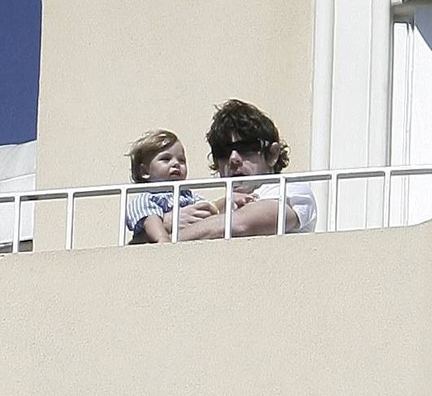 The new golddigger by the way, as reported by Us Weekly, is called Damon. Here he is on the balcony of their hotel holding Sean Preston. Or is that JJ? My womb is wired shut, I can’t tell children apart.