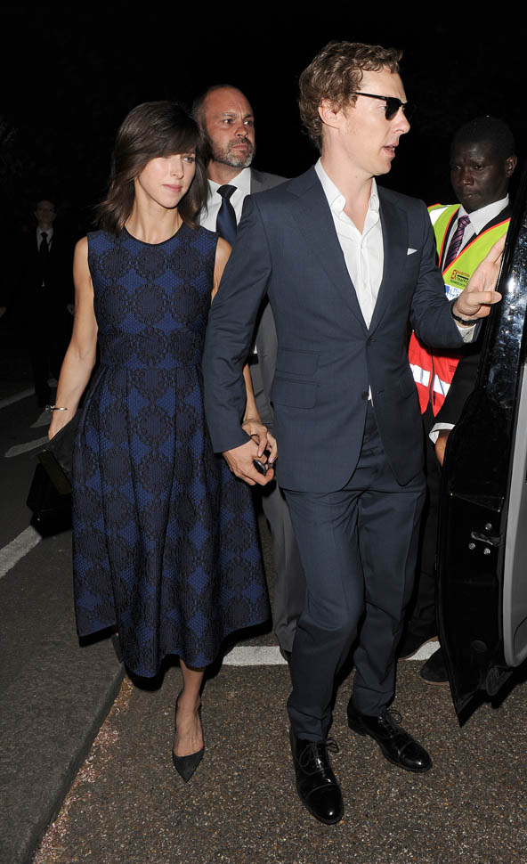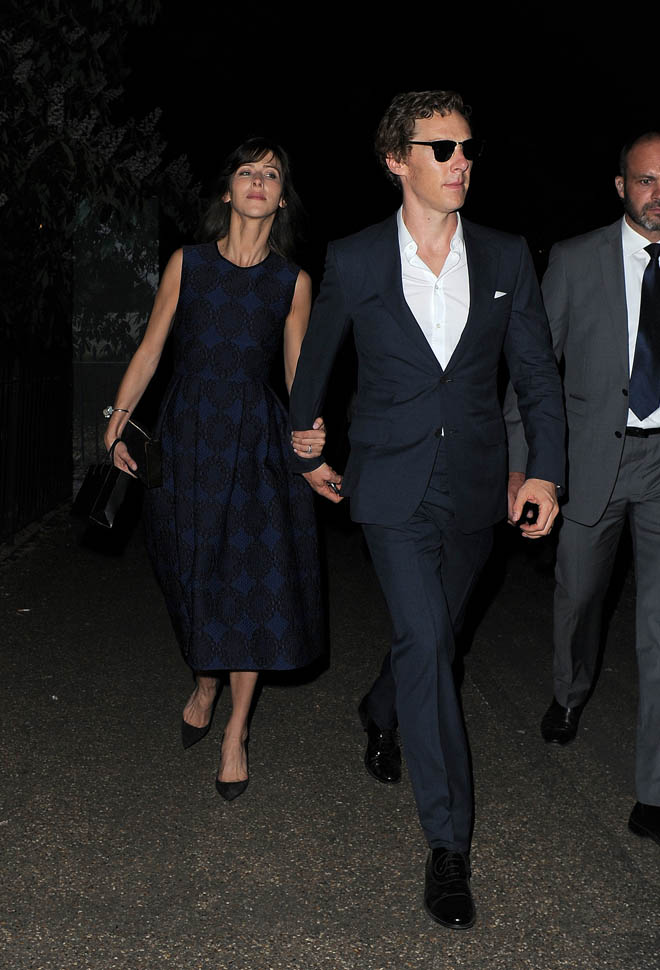 Aw, check out Benedict Cumberbatch looking lovingly at his wife Sophie Hunter last night in London at the Serpentine Gallery summer party. It’s the first time the two have been out in public since the birth of their son was announced in June. His exact birthday is not known. His name is not known. Just like Keira Knightley’s daughter’s name is not known. Or Evan Rachel Wood’s son. So, in not releasing the name of Baby Cumby, Benedict, essentially, is not introducing you to his child.