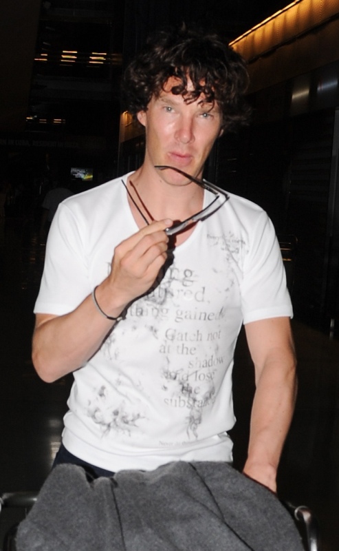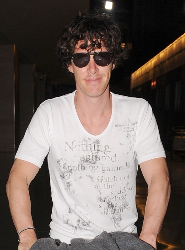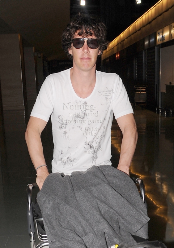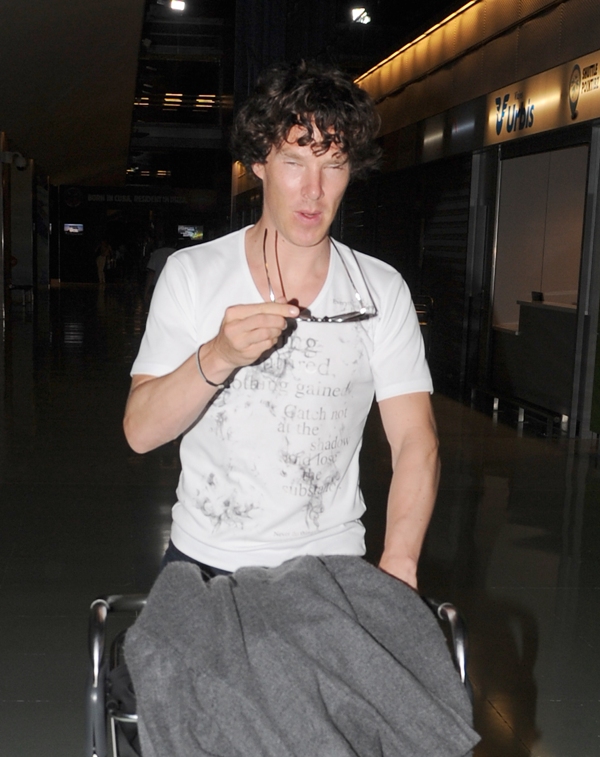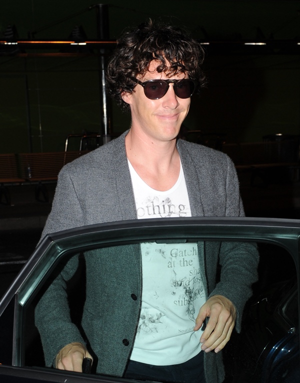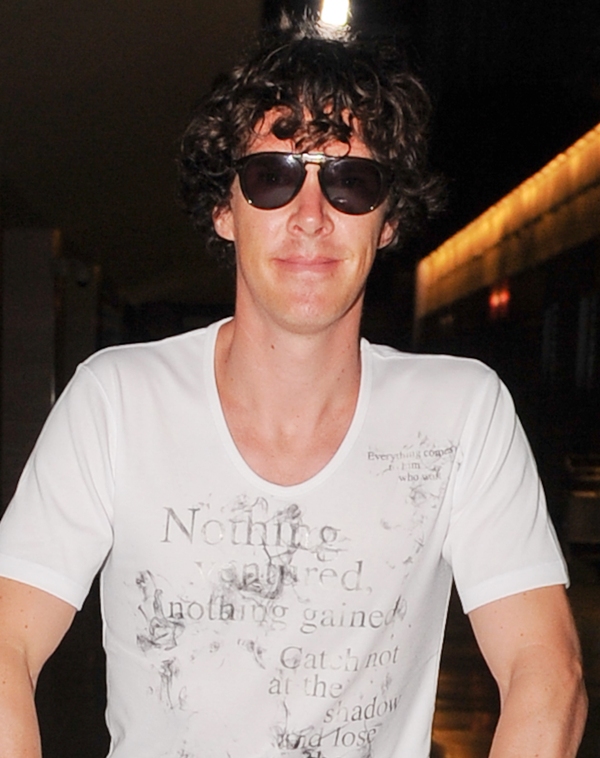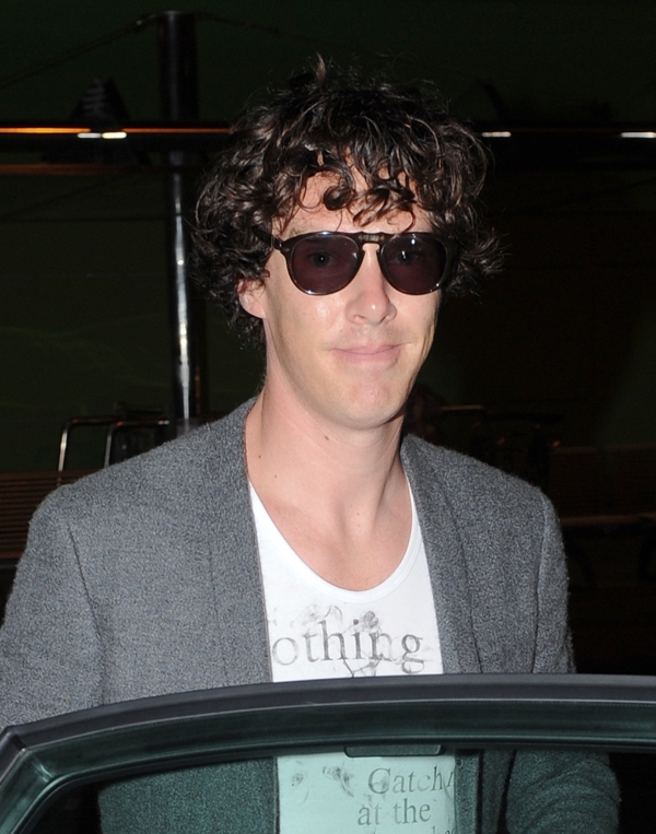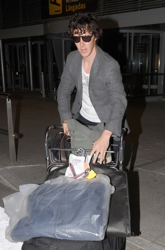 (Lainey: Cumberbatch mentions in the interview with Vulture, fresh off his Emmy nomination, that he’ll be officiating a friend’s wedding in Ibiza this weekend. Here he is arriving at the airport. Please…I can’t look at him in shorts or capris or flip-flops anymore.)