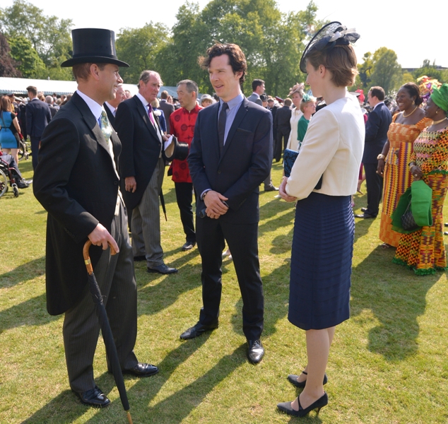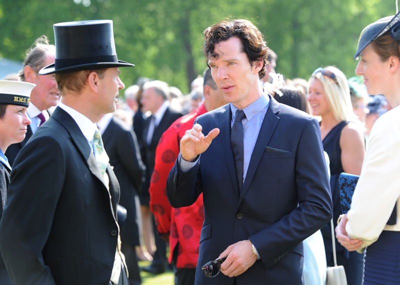 I’ve had a very long week. Travel, business trip, long days, more travel. It’s a bit exhausting. But, as if sensing my need, my Five list has risen to the occasion and they’ve been getting photographed all week, from Timothy Olyphant to Jake G to RDJ and his swoopy hair on a seemingly daily parade in Boston—even Idris Elba got photographed twice in one week. And now Benedict Cumberbatch has made an appearance, attending Queen Elizabeth’s annual Garden Party at Buckingham Palace in a dapper blue suit.