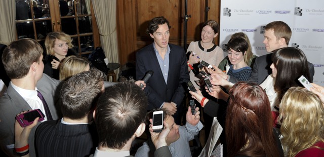 After the fright wig situation Benedict Cumberbatch sported while filming the Julian Assange biopic The Fifth Estate just a couple months ago, he is back now the way I prefer him—with Sherlock Holmes’ longer, darker hair. This is Cumberbatch at the South Bank Sky Arts Awards in London, doing a lot to erase the horrors of the Assange look from my mind. Sigh of relief.