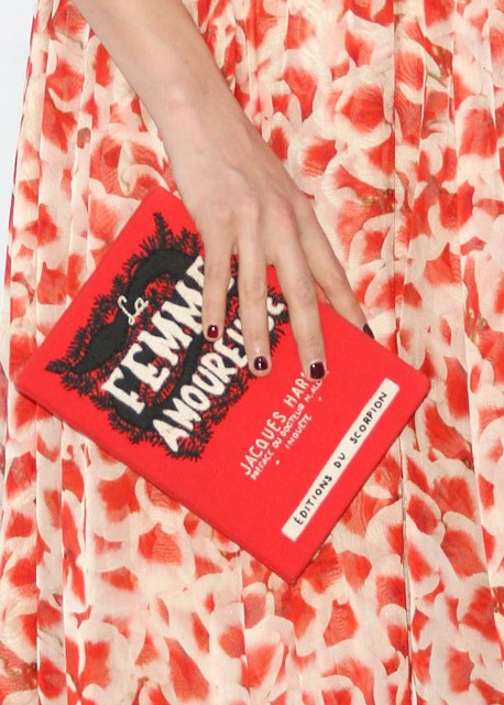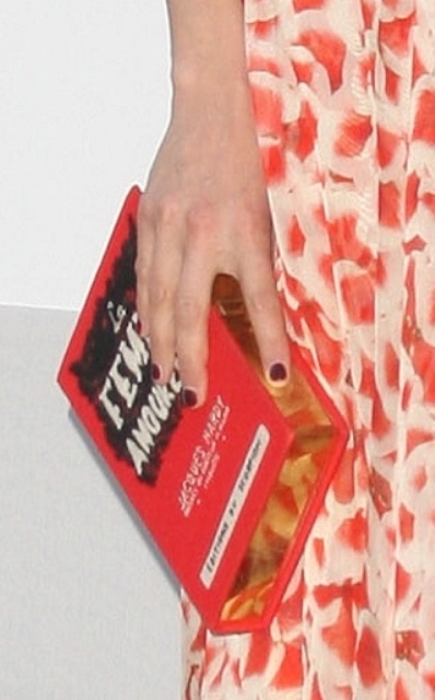 Michelle Williams did this a few times during her run for My Week With Marilyn – carrying around a clutch in the shape of a book. Berenice Bejo’s La Femme Amoureuse by Olympia Le Tan, made in very limited edition, sells for $1500. I’m partial to La Peste. Wouldn’t it be funny showing up to a dinner party with that in your hand?