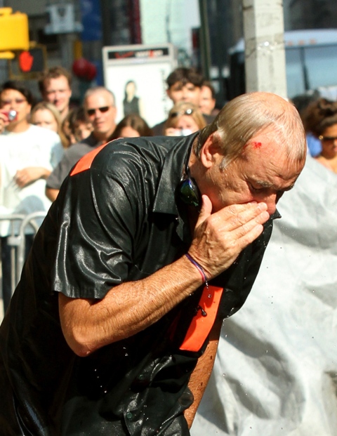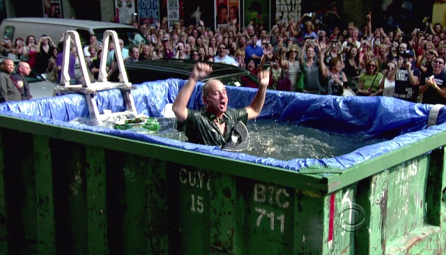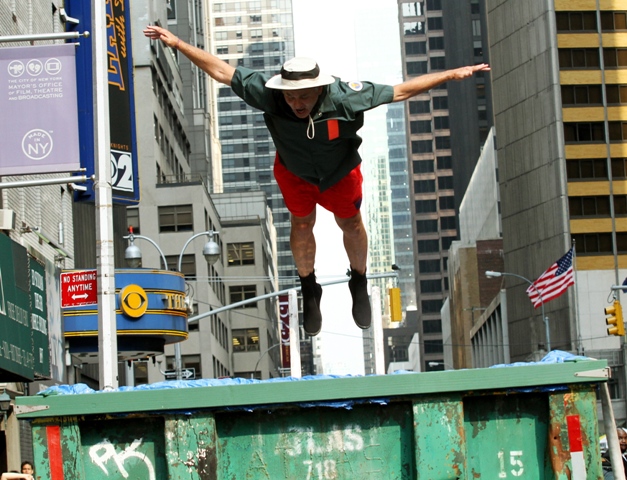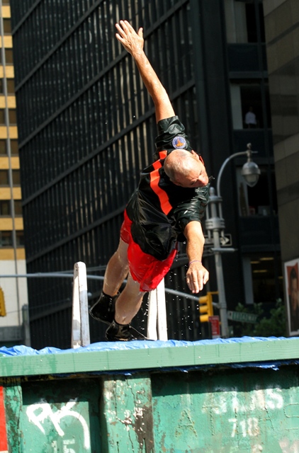 Photos attached – Bill at Letterman in July diving into a dumpster.