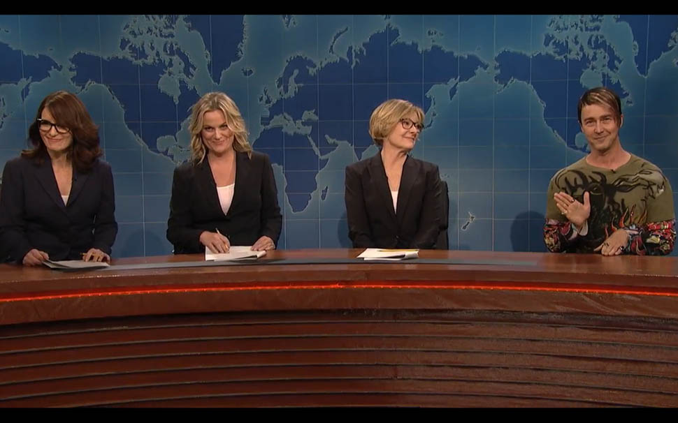 Three iconic “Weekend Update” anchors took the desk for a live sketch: Amy Poehler, Tina Fey, and Jane Curtain. This was not a flawless segment, but these three comediennes together were. An appearance by Land Shark (before there was #LeftSharkthere was Land Shark) was just icing on the cake.