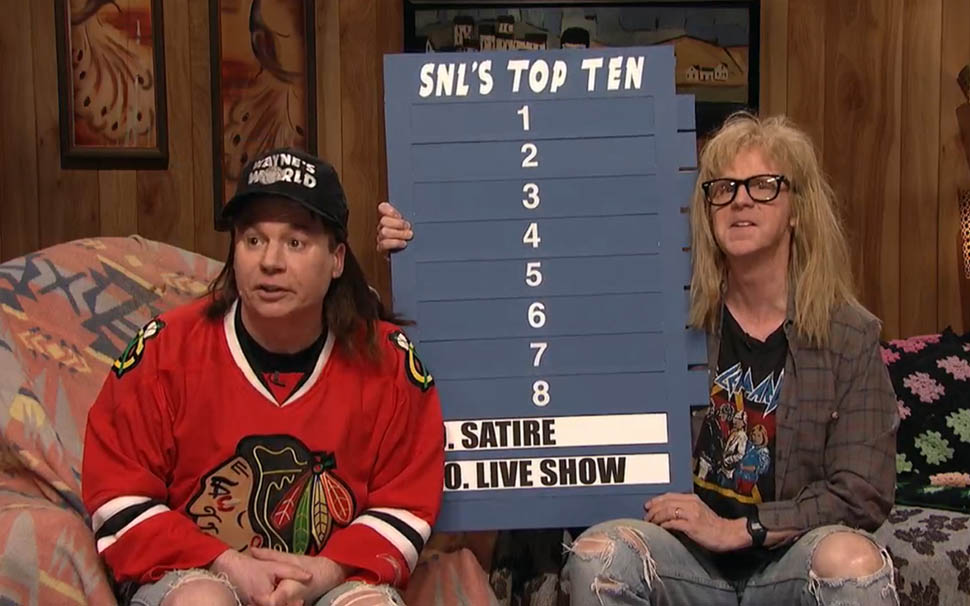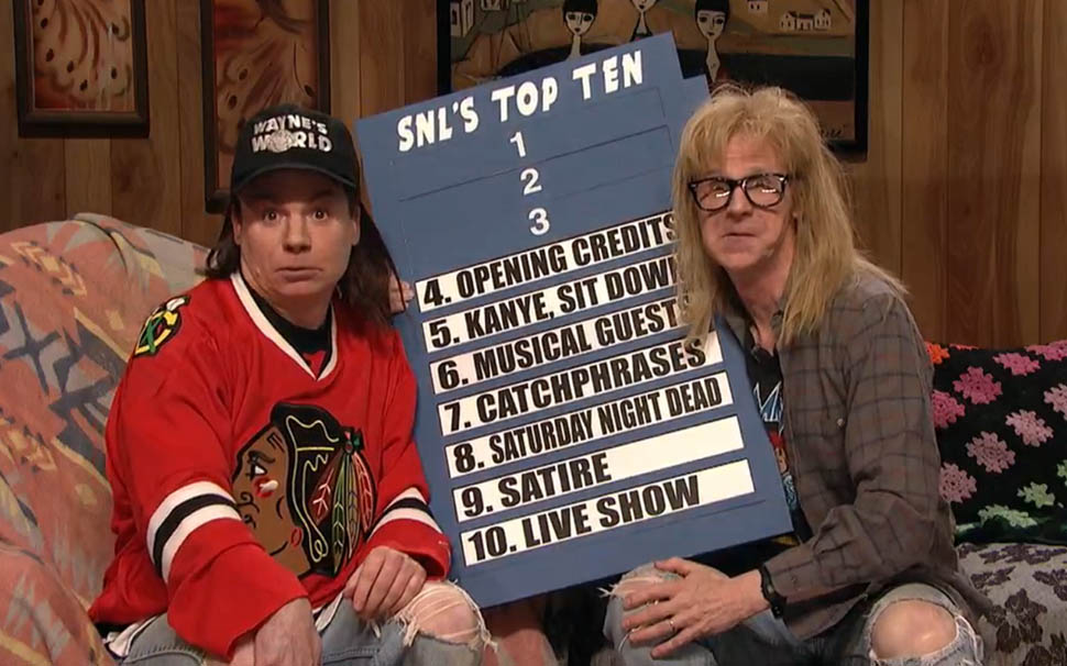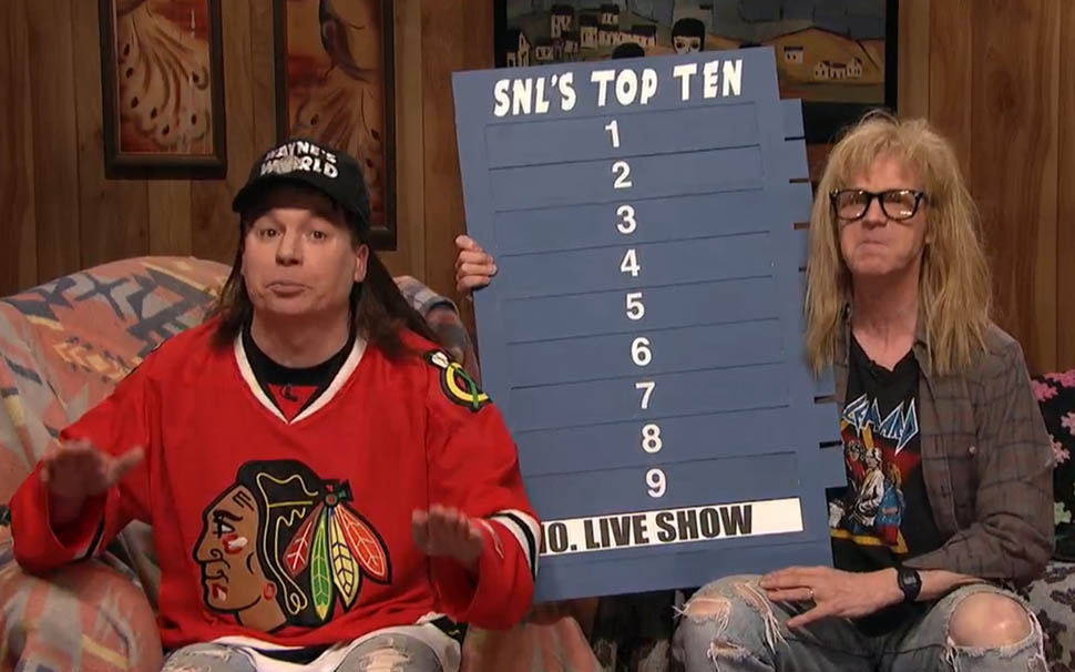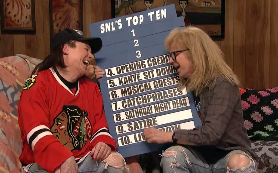 This sketch was everything SNL40 should be—iconic characters, new material. Mike Myers and Dana Carvey still have that chemistry that make “Wayne” and “Garth” two of the most indelible SNL characters of all time, and they turned the SNL-themed Top 10 into a combination of touching tribute—what a classy way to acknowledge the crew—and topical, with a great reference to Kanye West’s stage-crashing ways. “There’s a line of demarcation” is the #2 quote of the night.