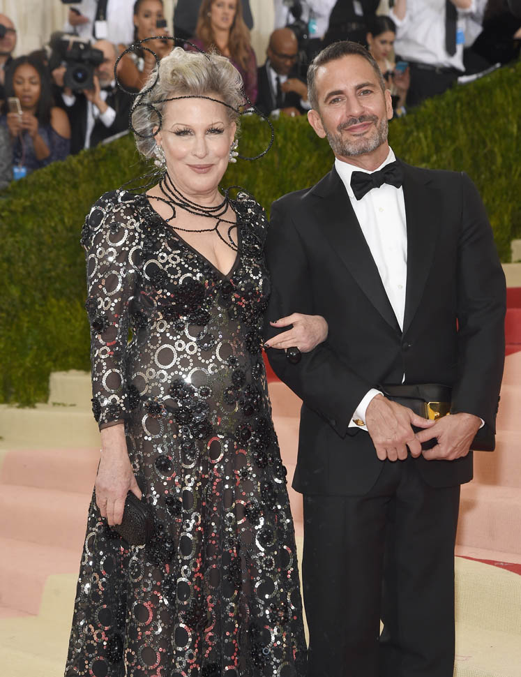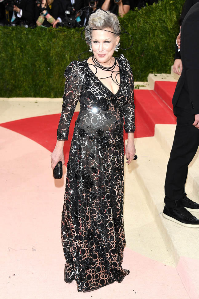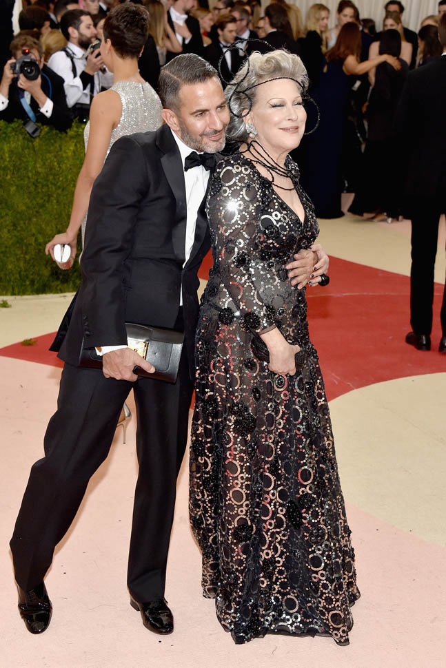 The joy for me here is that I never, ever would have imagined that I’d ever be writing about Bette Midler and Zoe Kravitz in the same post. I hope this is as delightful for you as it is for me. Because we’re checking off all of our MET Gala theme boxes in so many ways. Bette is coming at you from one generation, amused to find herself, alongside Marc Jacobs no less, in an exquisite gown that fits her beautifully, but you can’t quite call her a stately old lately because he’s wrapped her head around some random ass wire that is as much fun as anyone at any age is supposed to have.
