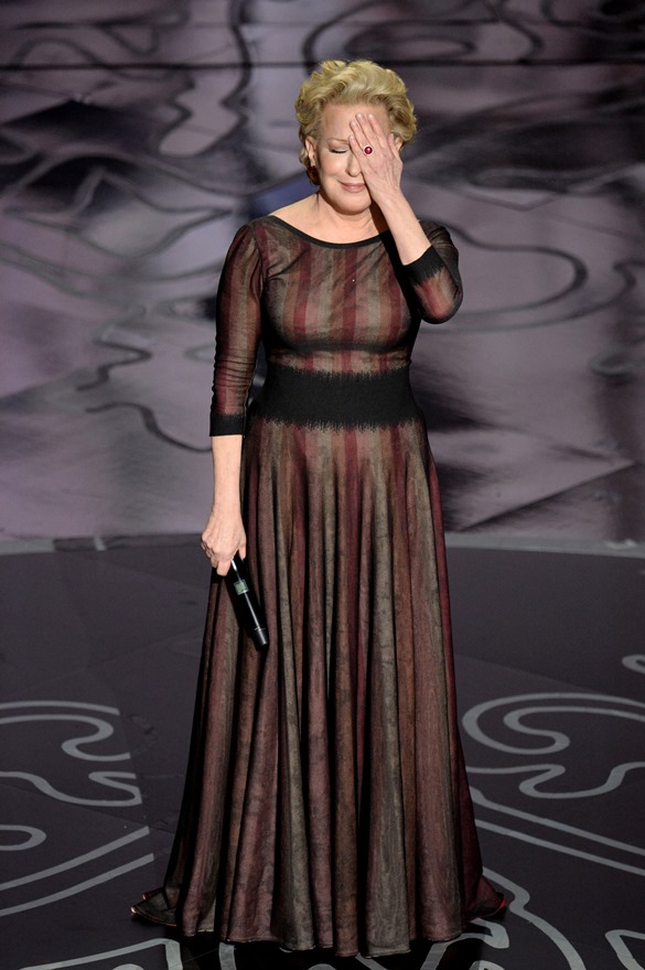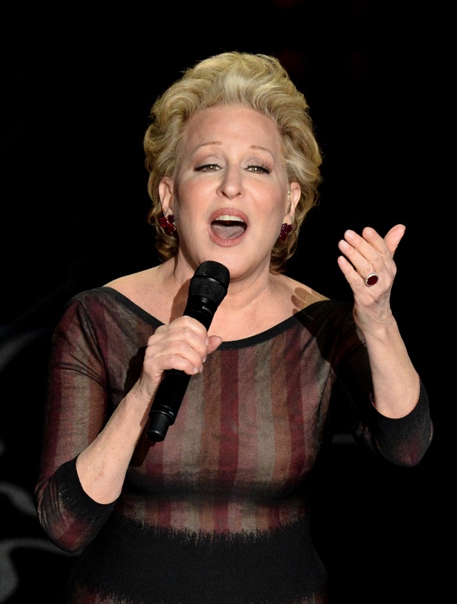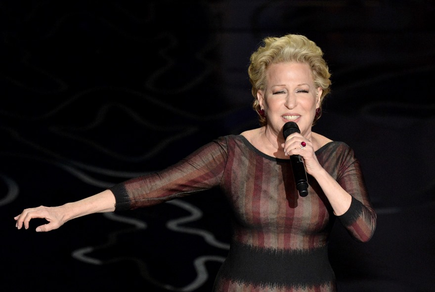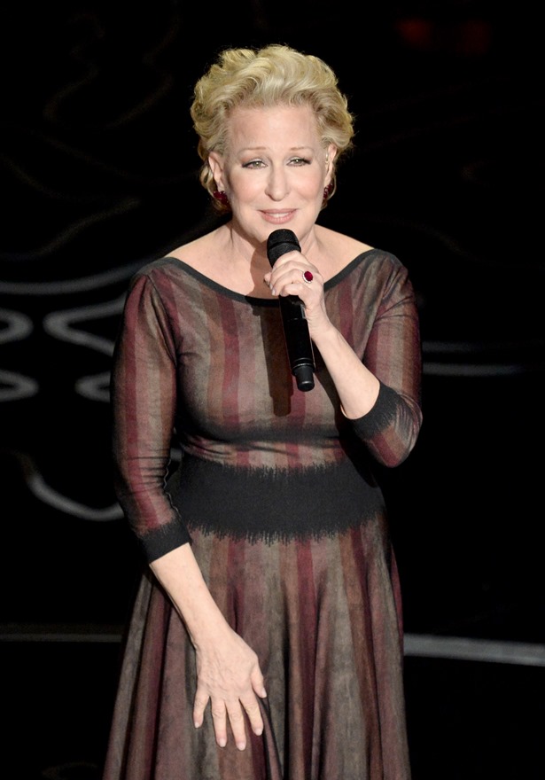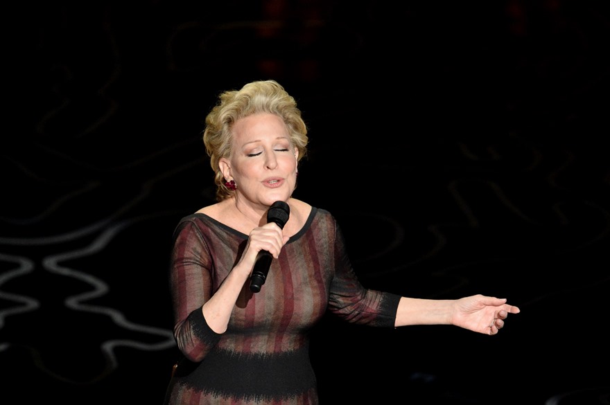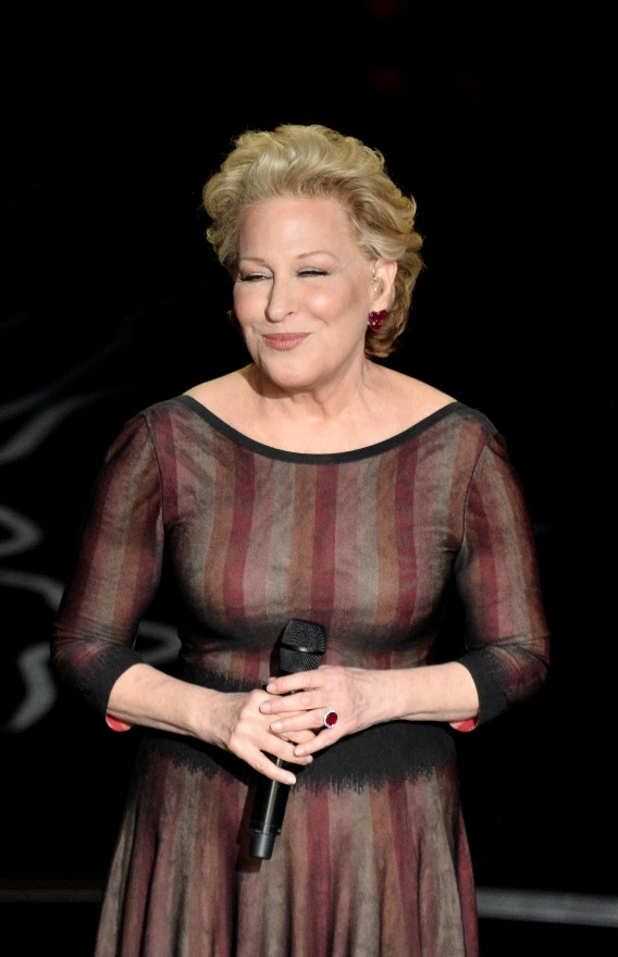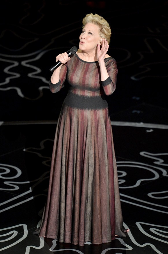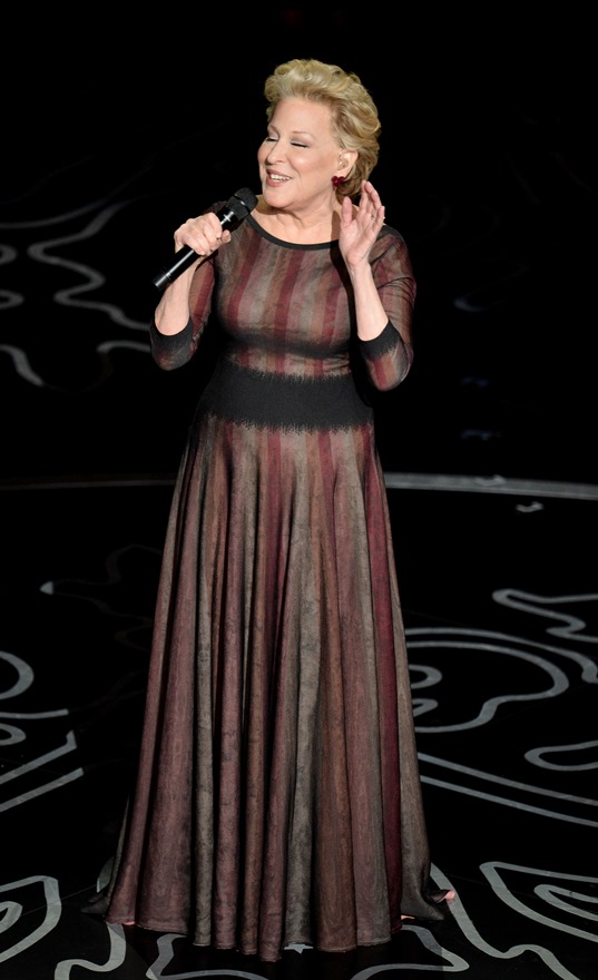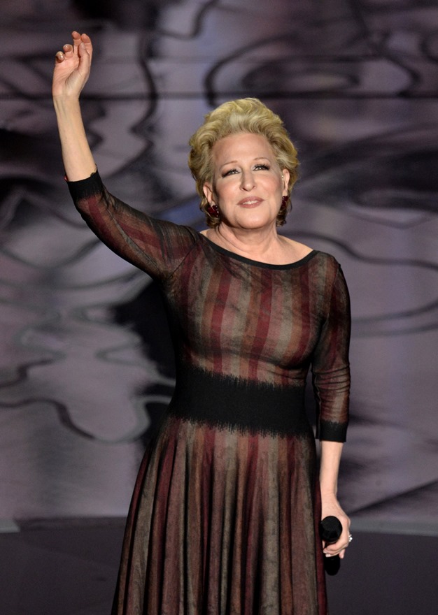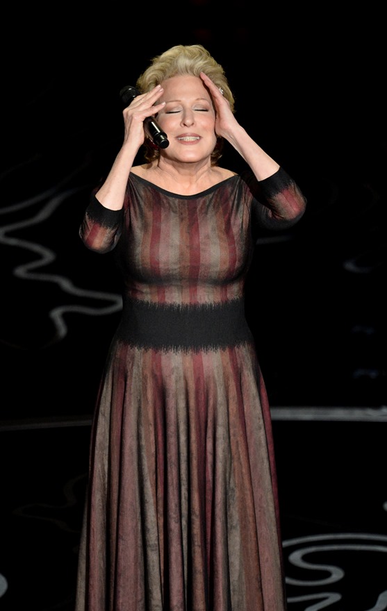 So, okay. Let us start with the Divine Miss M, who was self-effacing on the red carpet and then rather well-dressed in vertical stripes during her performance. Even though coming at the end of the In Memoriam segment can be a tricky place to be, Bette knows that that song lifts up everyone’s hearts and there won’t be a dry eye in the house, so she gears up to let it fly.