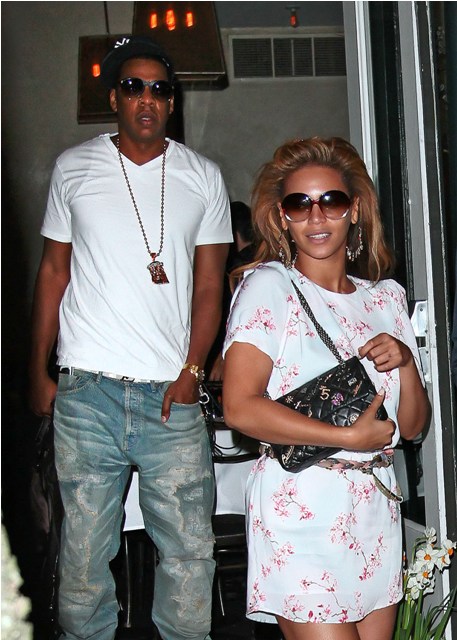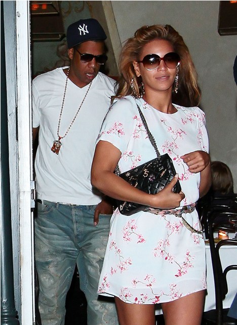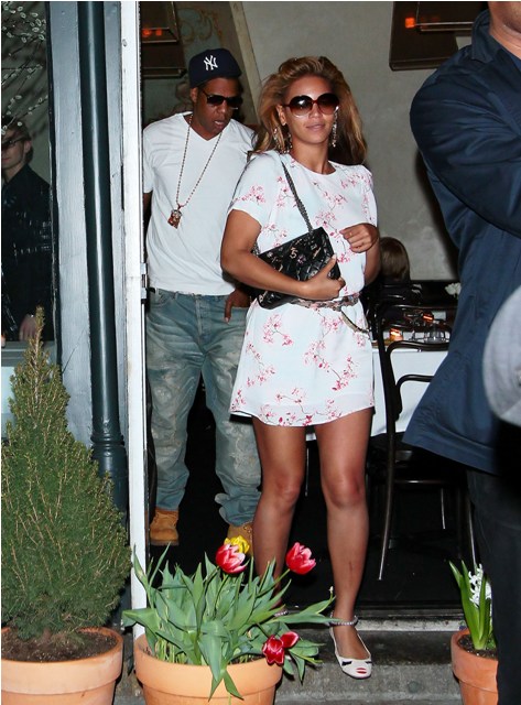 They were married 2 years ago yesterday, both of them with a particular affinity for the number 4. Beyonce and Jay-Z celebrated this weekend in New York, first on Saturday at the Broadway performance of Chicago where B busted out the denim booty shorts, and then a romantic dinner on Sunday that featured a flat-shoed Beysus in a demure-ish white print dress. Not really sure about the pearl ankle choker.