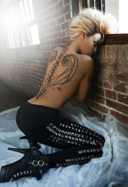 In a recent ad campaign for her mother Tina’s assy and not exactly original designs, Beyonce was photographed with temp tattoos all over her back. It’s now becoming another way for ma to make even more cash money. So they’re partnering with an airbrush company to sell the images off Beysus’s back: